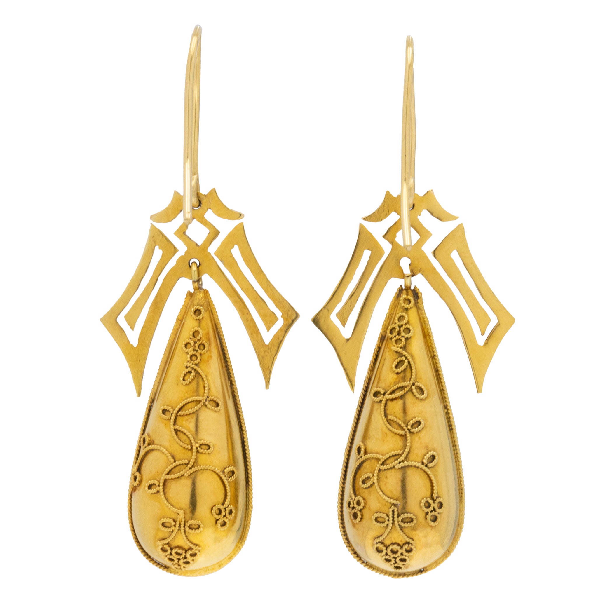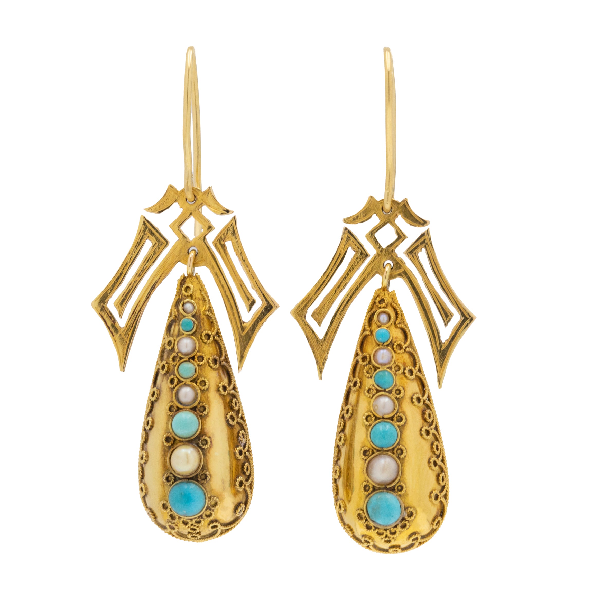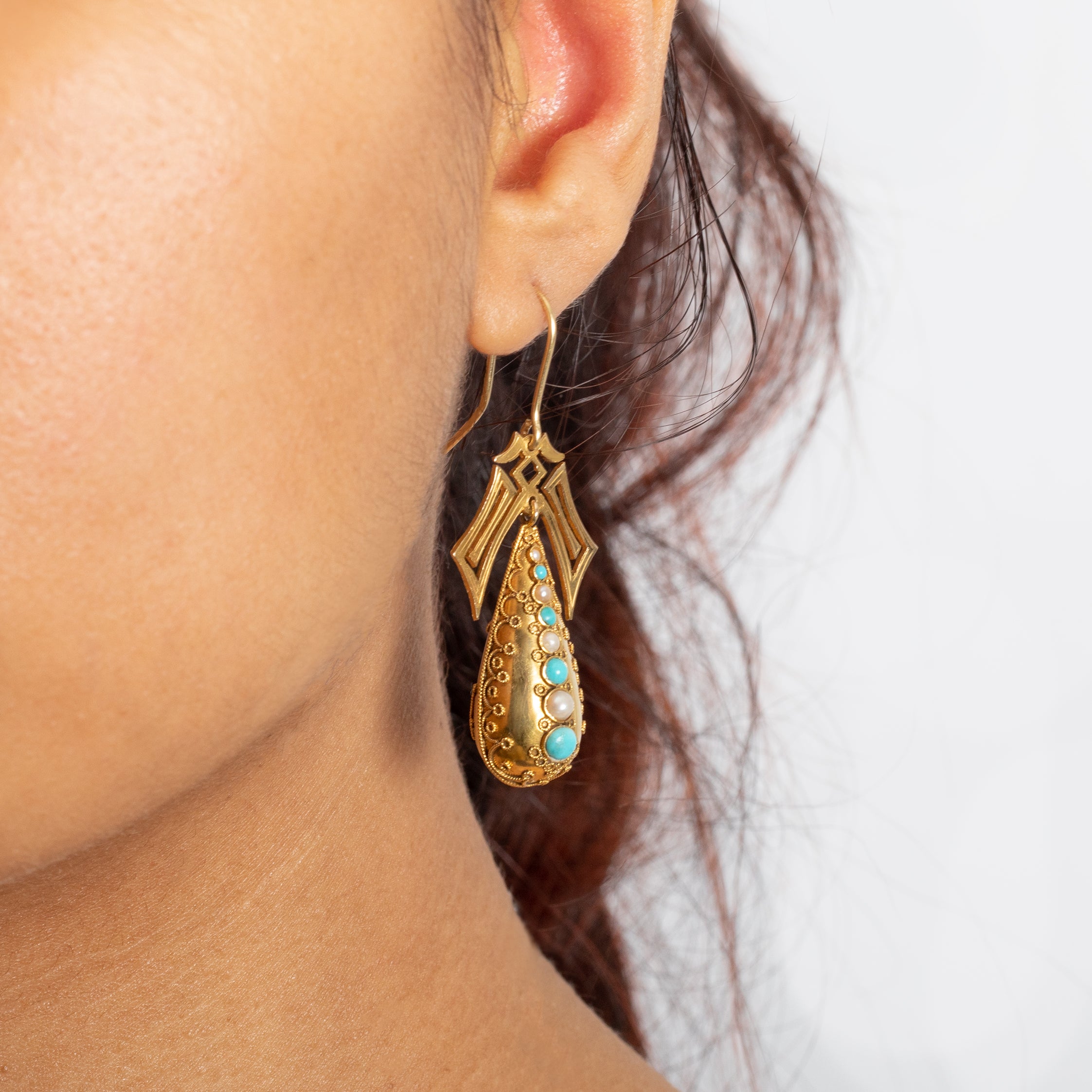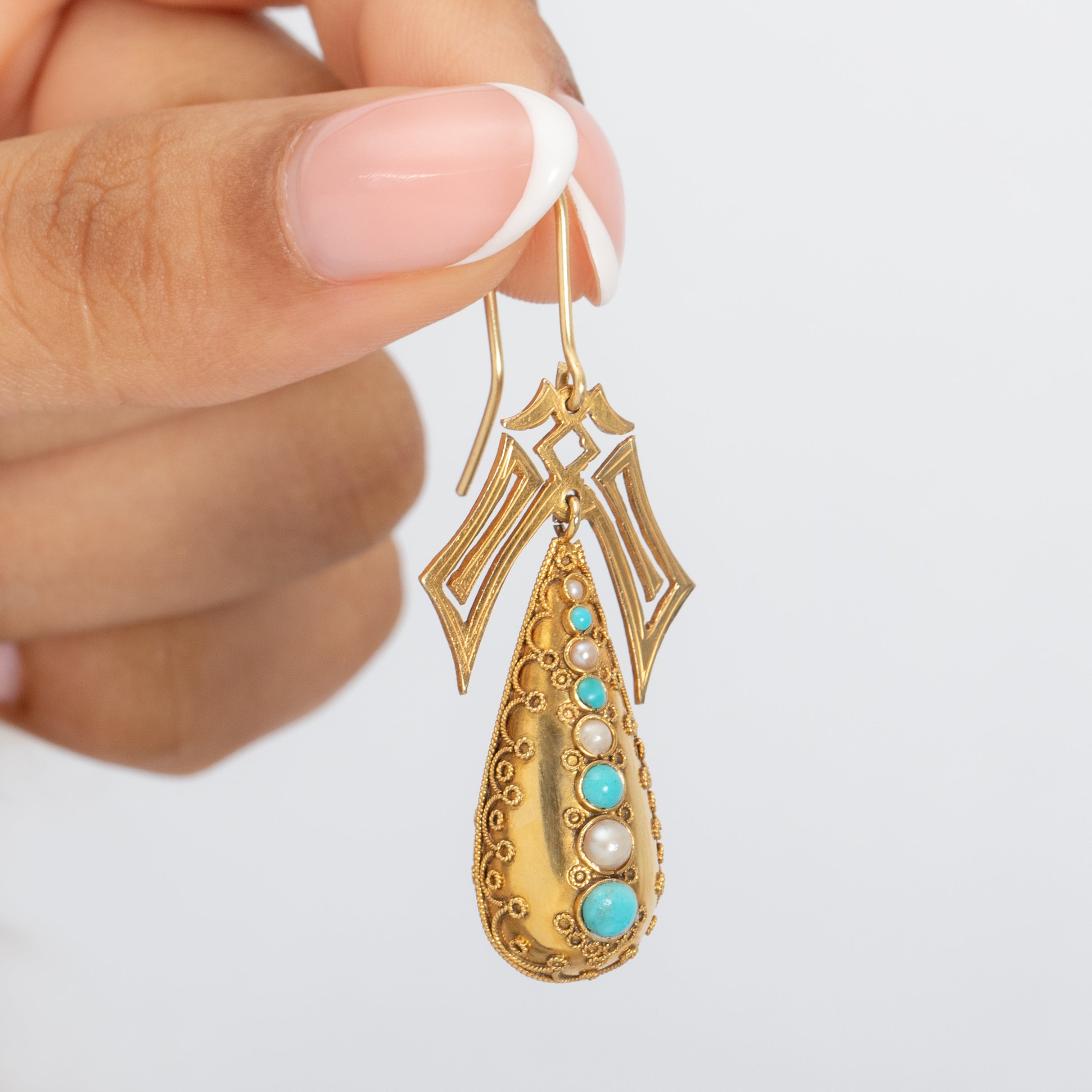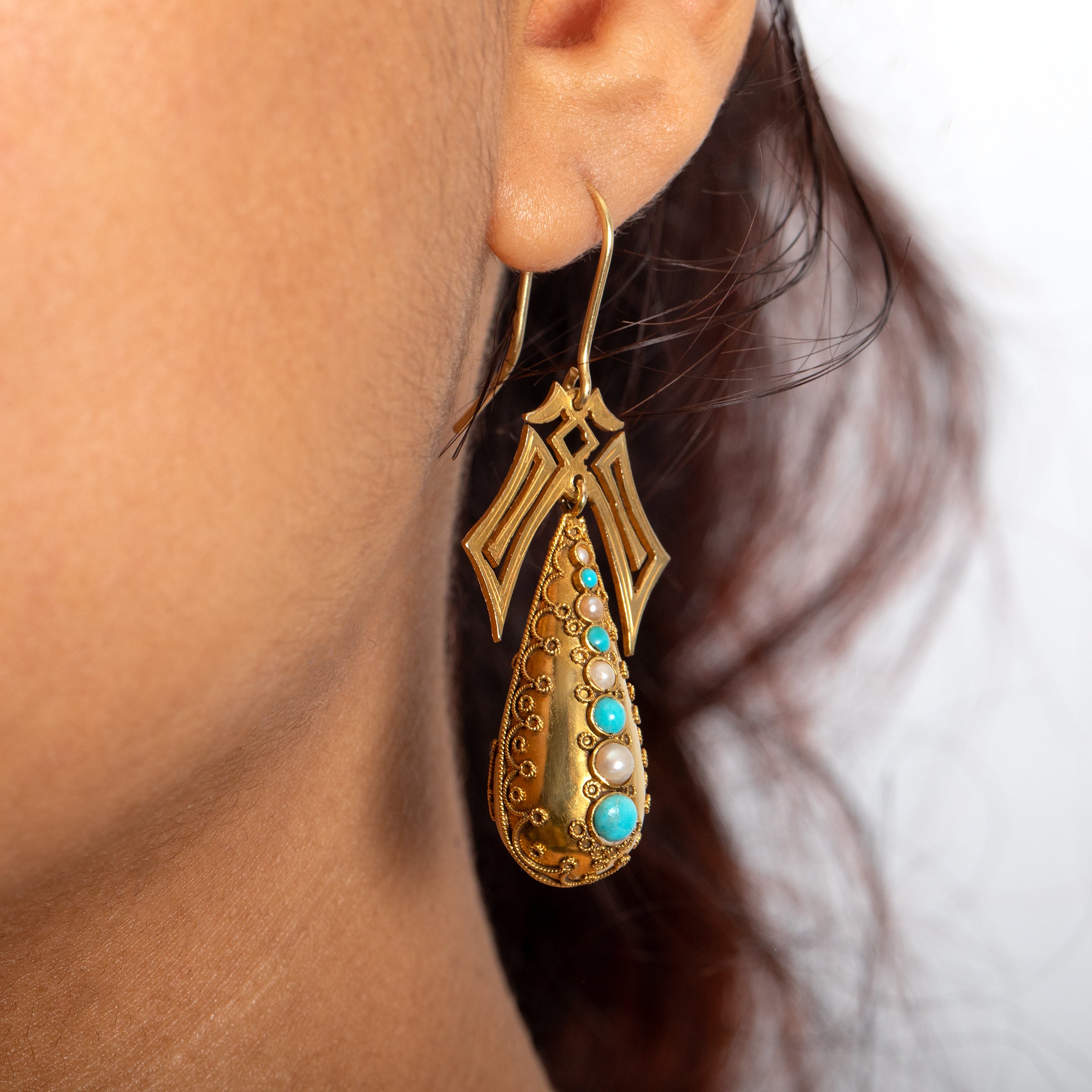 ヴィクトリアン 18ct ゴールド ターコイズ パール ドロップイヤリング