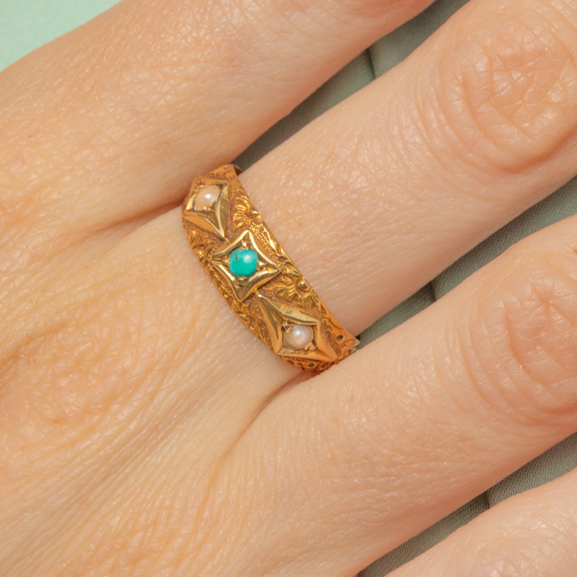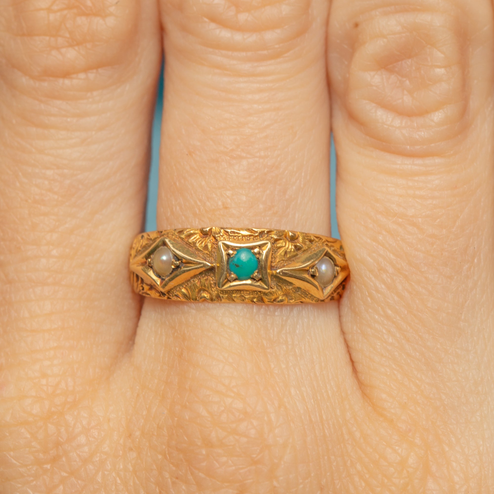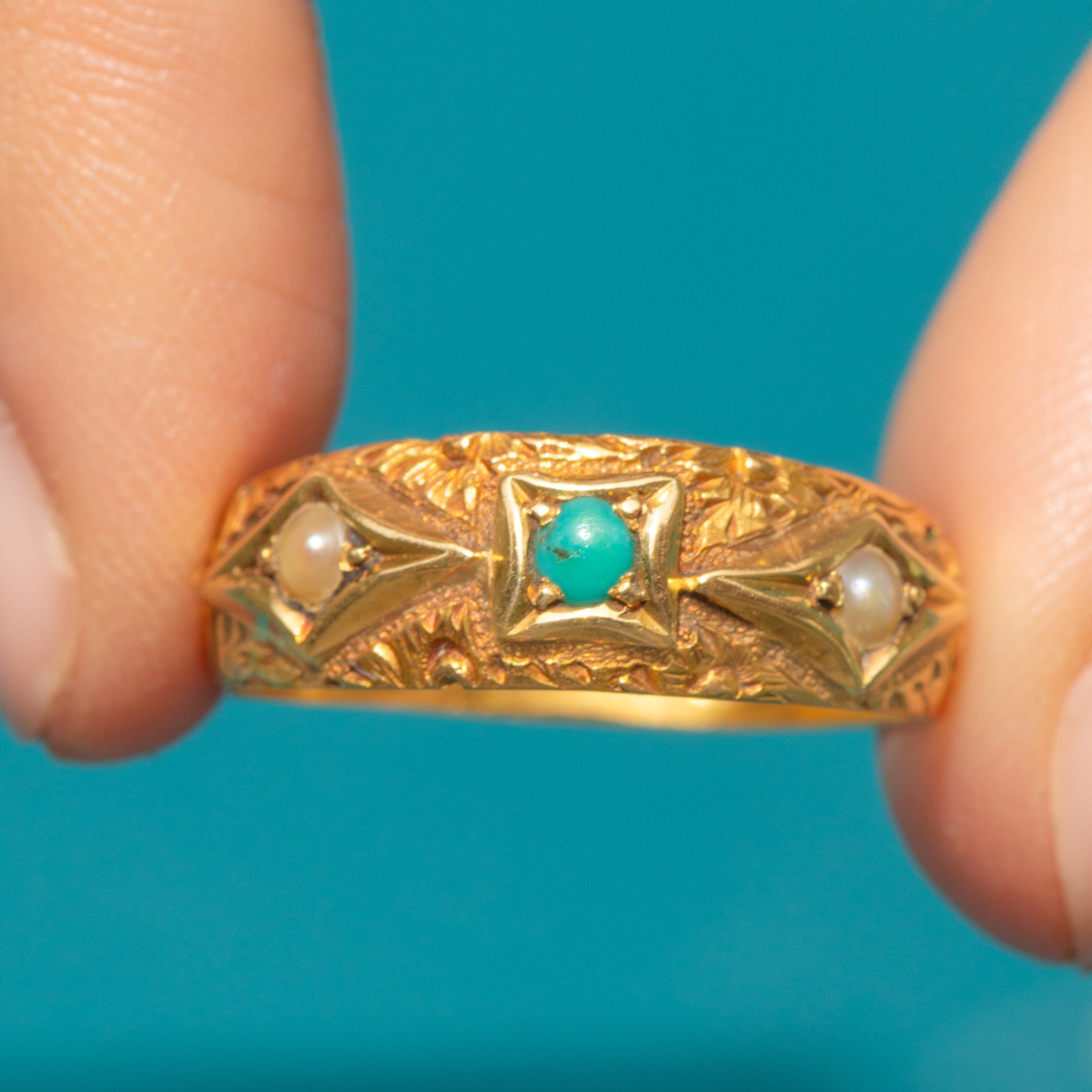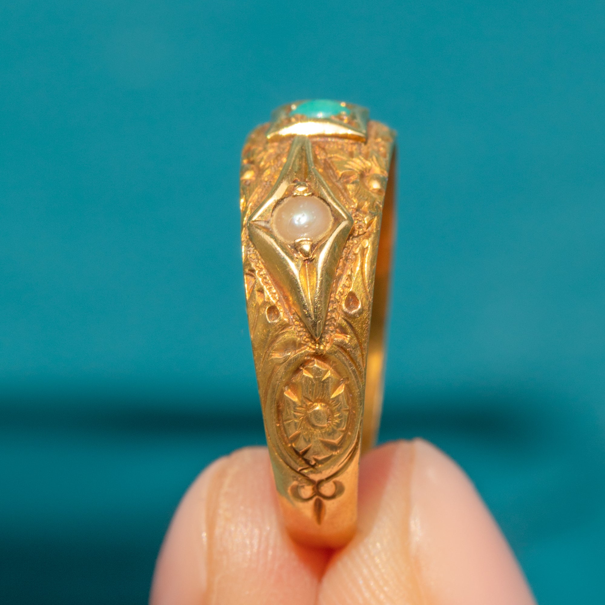 Victorian 18ct Gold Turquoise Pearl Engraved Ring, c.1880