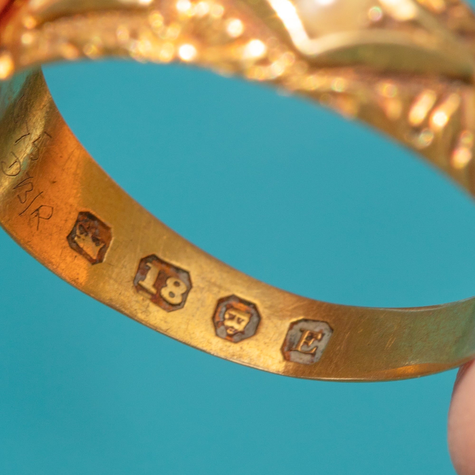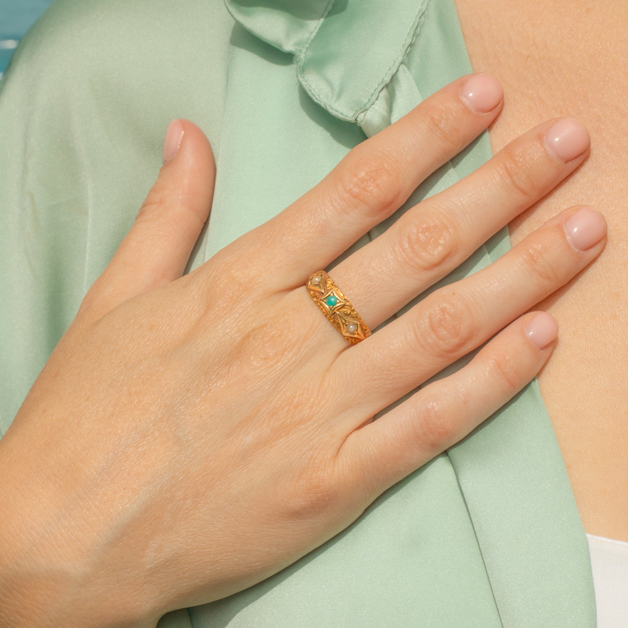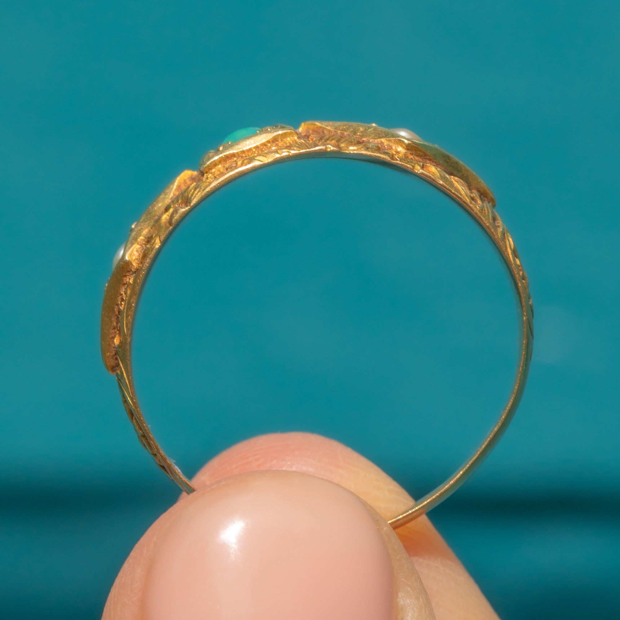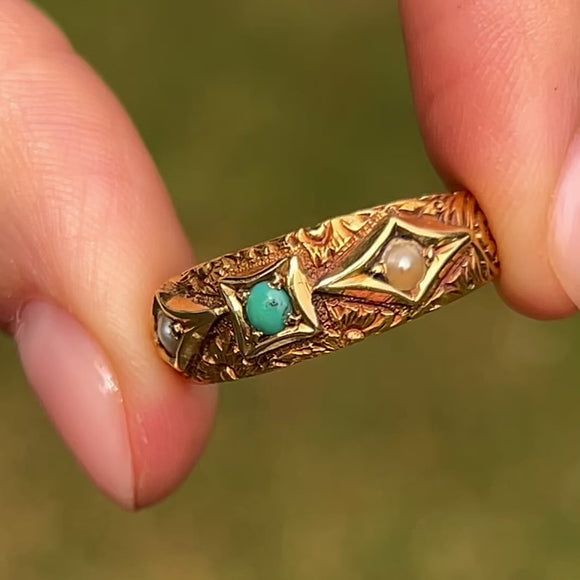 Victorian 18ct Gold Turquoise Pearl Engraved Ring, c.1880
