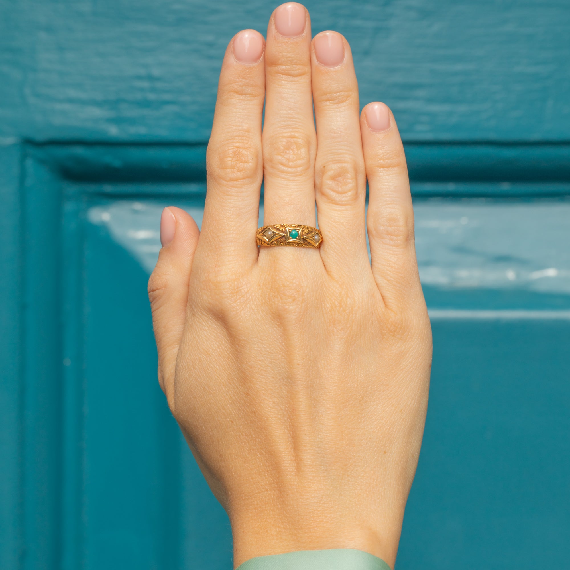 Exuding antique charm, this Victorian 18ct Gold Turquoise Pearl engraved ring will bring a decorative flourish to your collection! The sumptuous 18ct Gold band is inlaid with whimsical floral engravings and the trio of gemstones have been flush set within a bold geometric design for a unique finish.