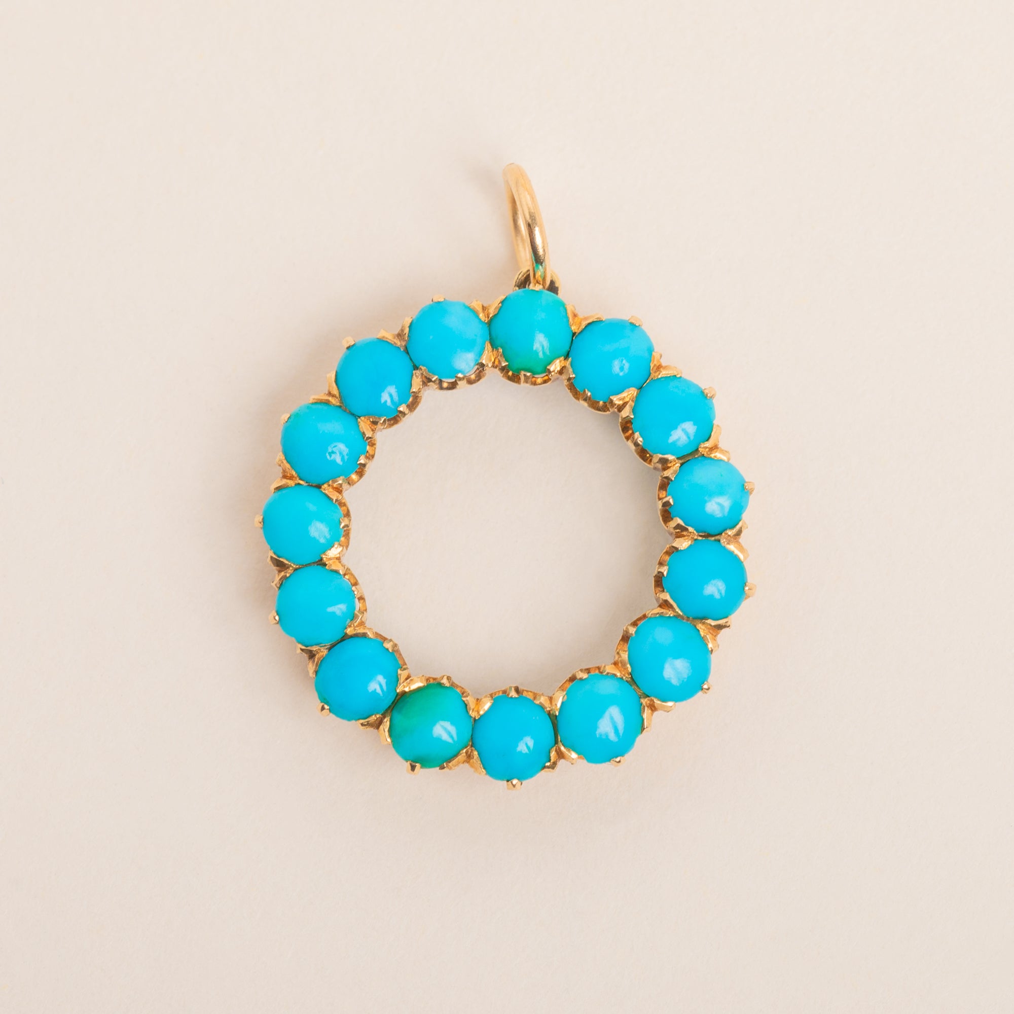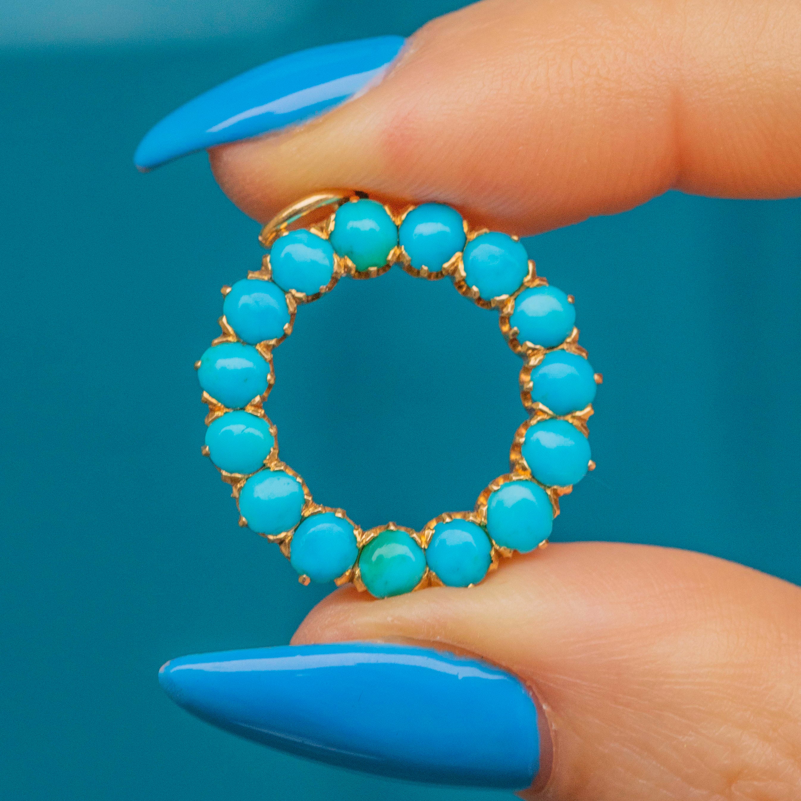 Smooth cabochon cut Turquoise sit perfectly snug in a roundel formation, each with a vivid and highly desirable Robin's egg blue hue perfectly complimented by saturated 18ct Gold. Incorporate some colour into your neck stack this October; this Victorian pendant will add a bold finishing touch!