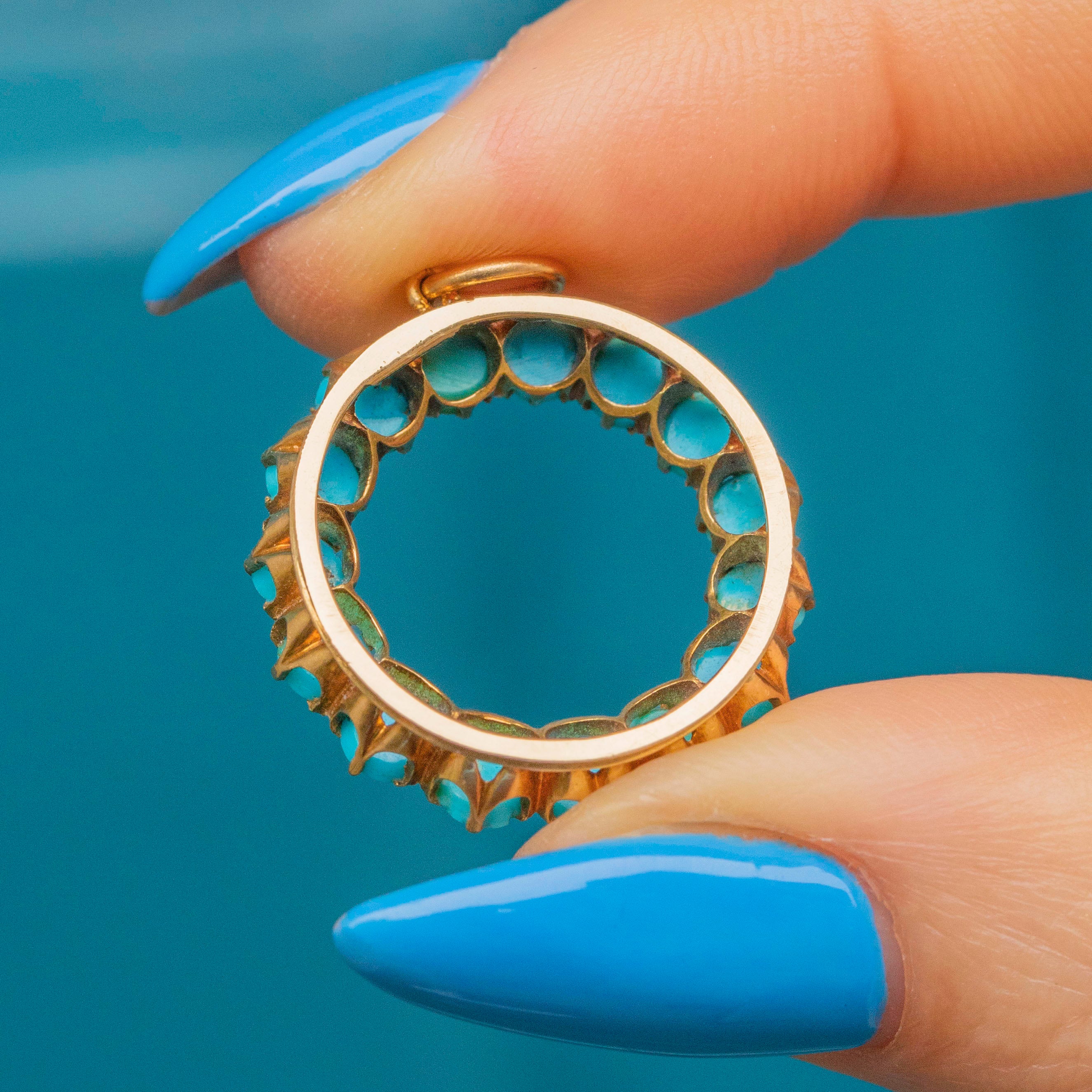 VERY GOOD. This Victorian 18ct Gold Turquoise roundel pendant is in very good condition! The Turquoise gems sit beautifully uniform, matched in tone overall but with some subtle natural variations to one or two. This pendant was likely once a brooch, and there is ever so slight indications of this on the back of the piece but it is smooth and wears comfortably.