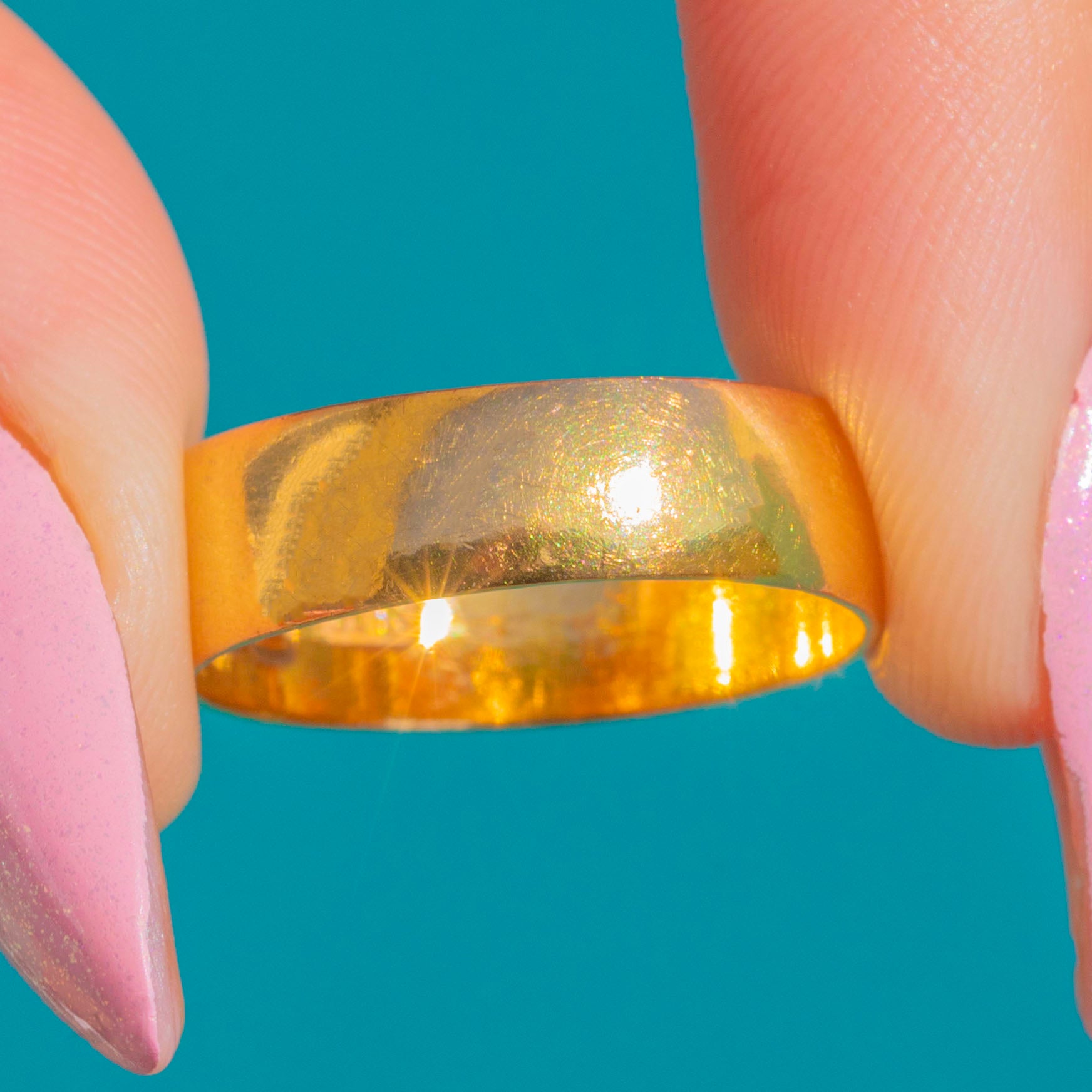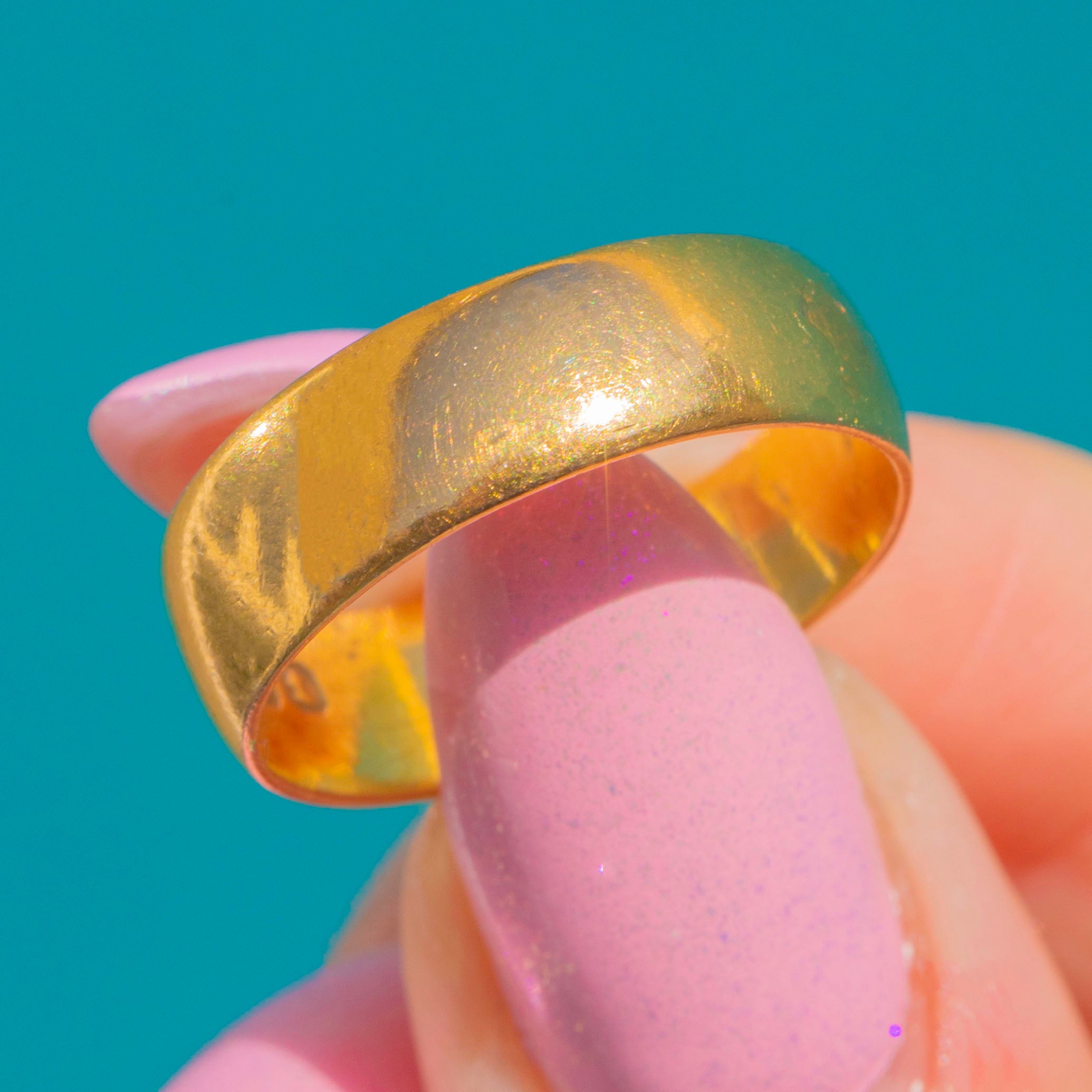 豊かな後期Victorian期の逸品、22ctゴールドのシガーバンドは1893年の作品です。ふくよかなドーム型のフォルムと5.5mmの幅が、力強くも美しいミニマリズムを演出し、高純度ゴールドならではのバターのような輝きを放ちます。クラシックなウェディングバンドとして単独で、または重ね付けで現代的なエレガンスをお楽しみいただけます。