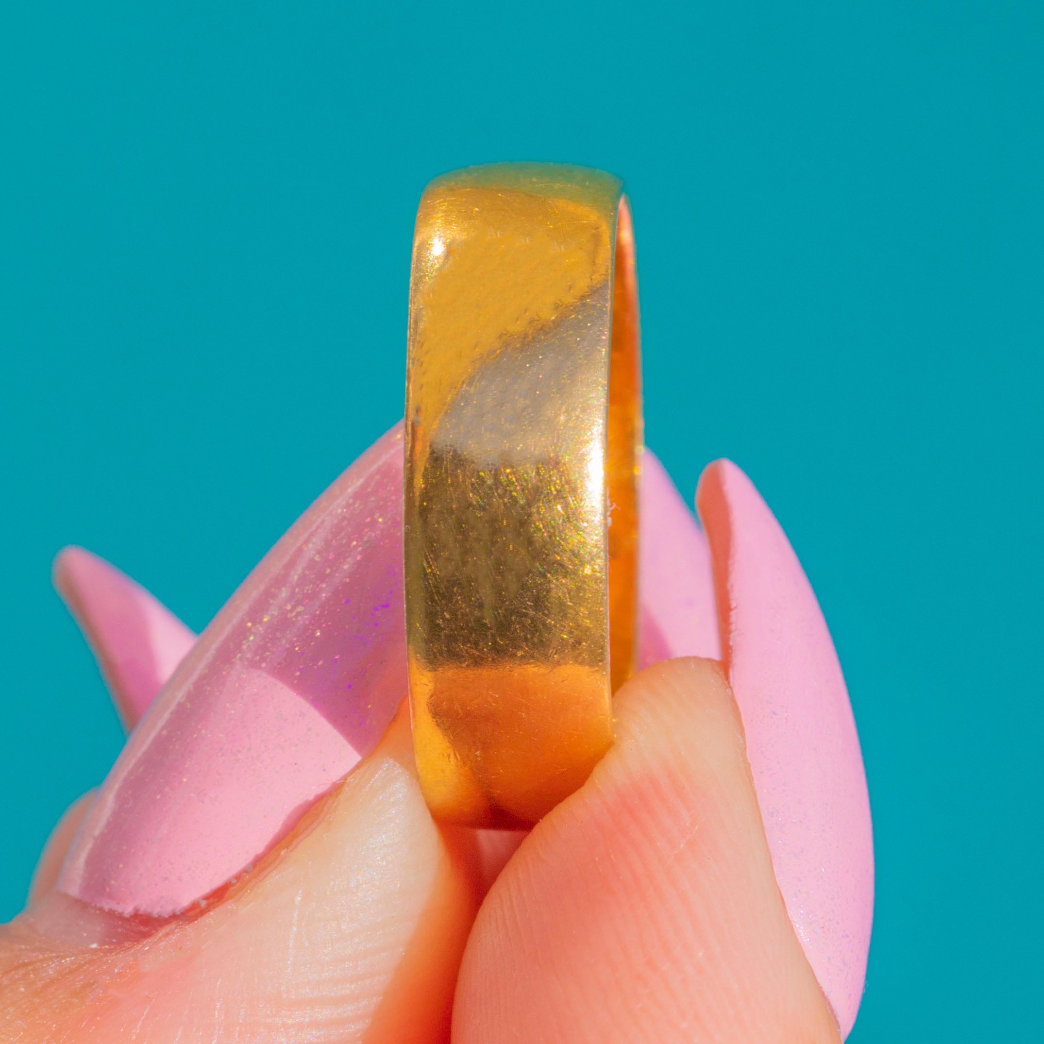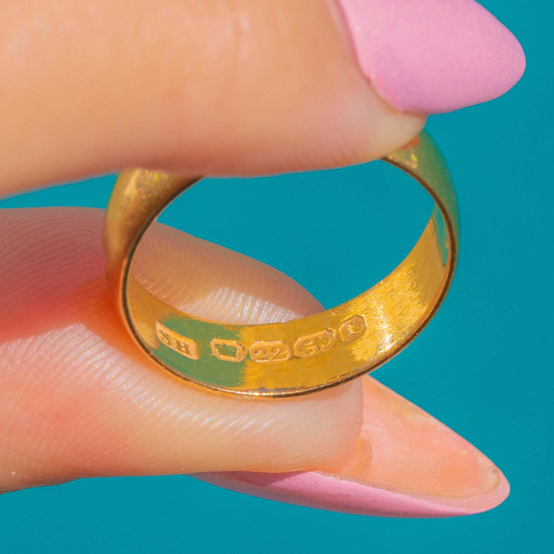 優れた状態:ゴールドは高い光沢を保ち、経年や使用によるごくわずかな表面の擦れのみが見られます。ドーム型バンドは均一で美しい形状を維持しています。明らかなサイズ直し跡や修理跡はなく、シャンク内側にホールマークが確認できます。