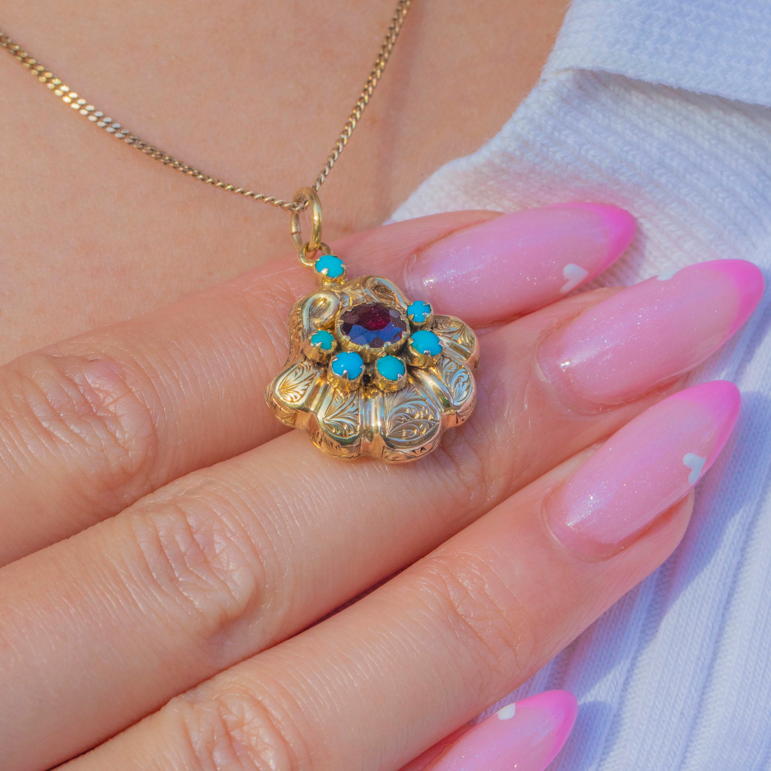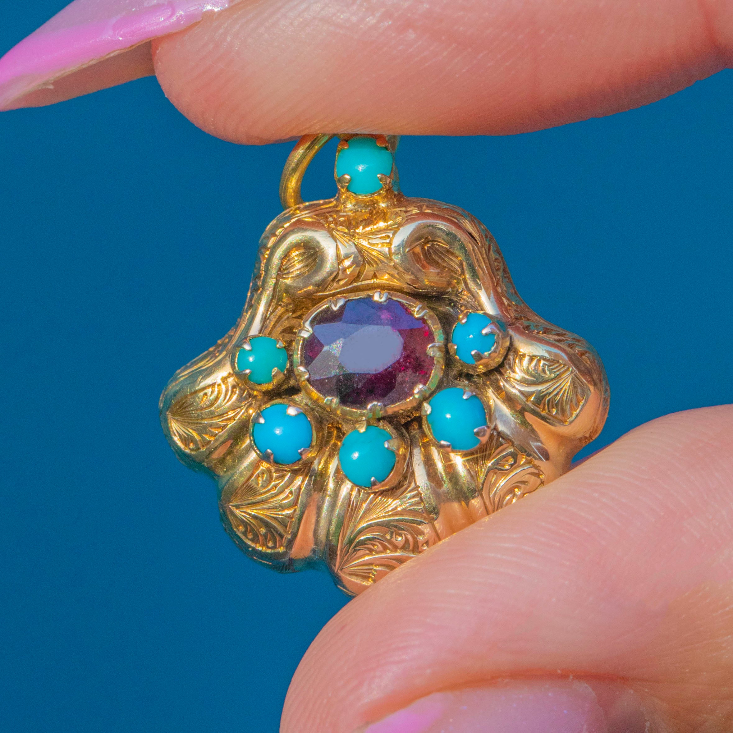 This exquisite Victorian pendant takes the form of a finely engraved fan, crafted in approximately 7ct Gold and set with vivid Turquoise and deep red Garnets. Each gemstone adds a vibrant contrast to the softly patinated Gold, evoking the colourful, romantic spirit of the late 19th century.