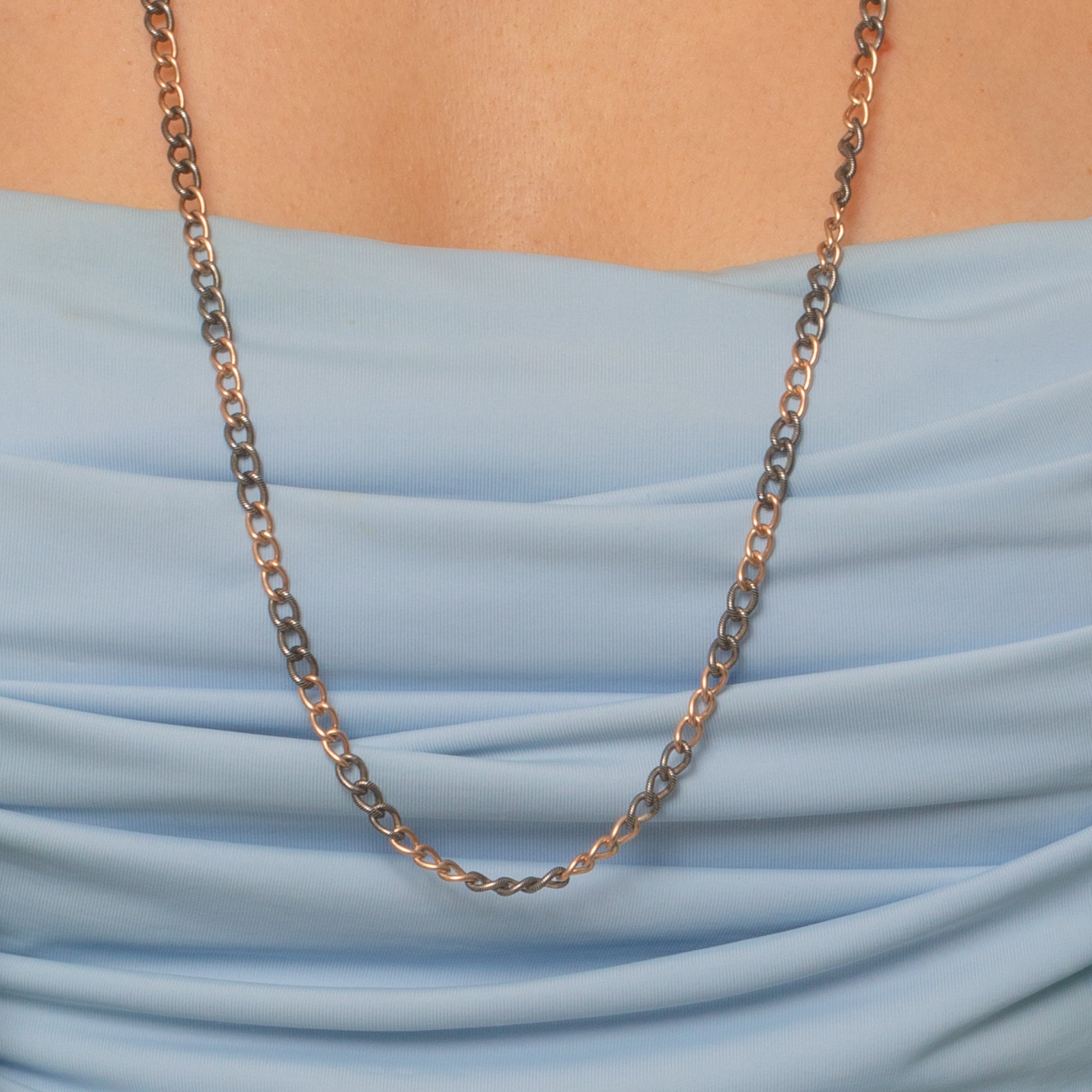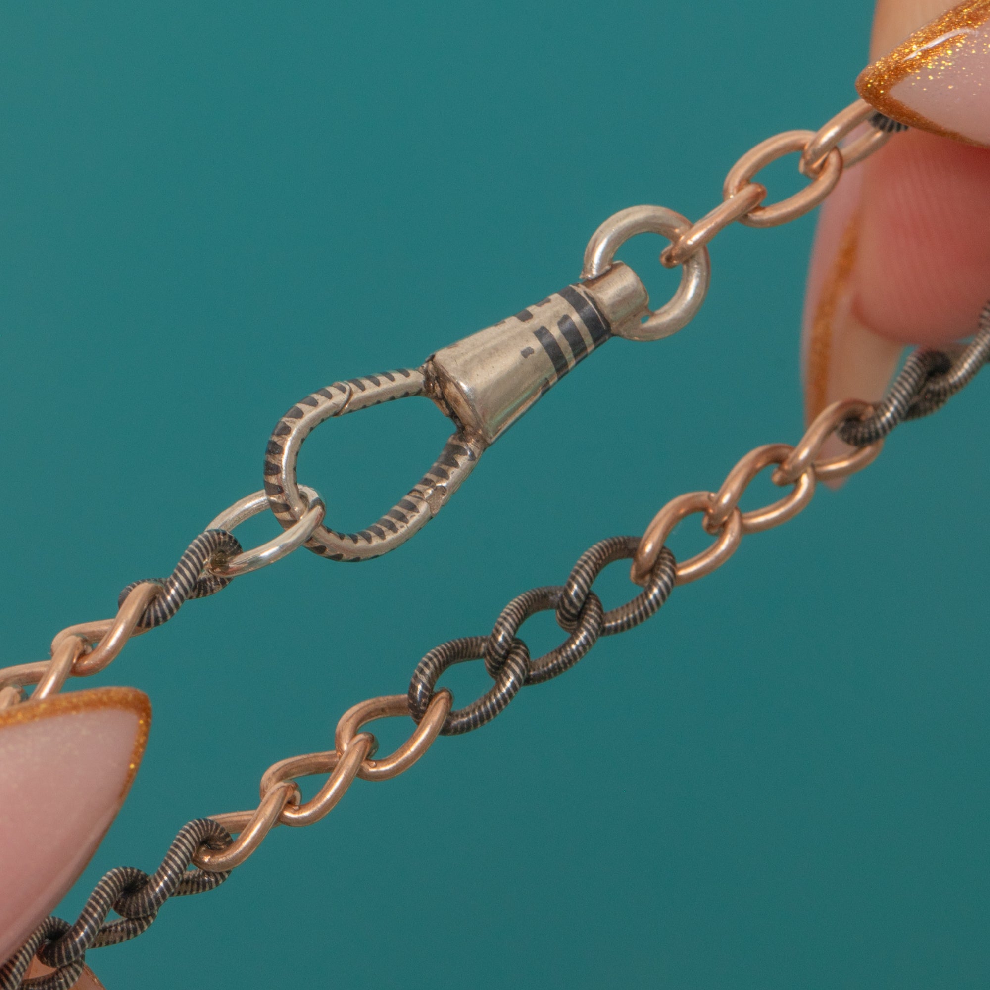 This striking Victorian Niello chain is a wonderful example of continental craftsmanship, with alternating Silver Niello Enamel and 9ct Rose Gold-plated links. The pin-striped pattern gives a subtle shimmer and contrast, creating a bold yet refined aesthetic typical of late 19th-century jewellery.