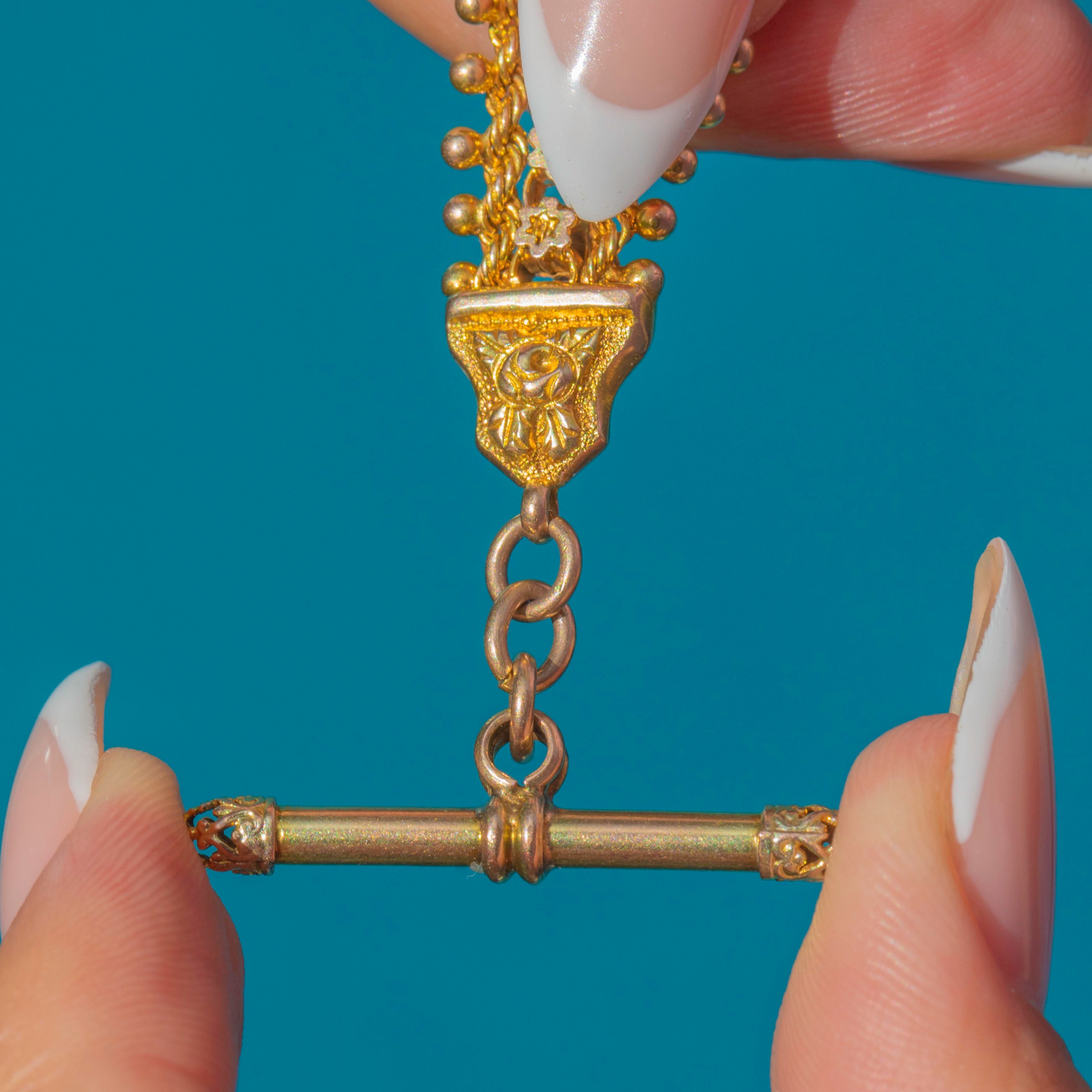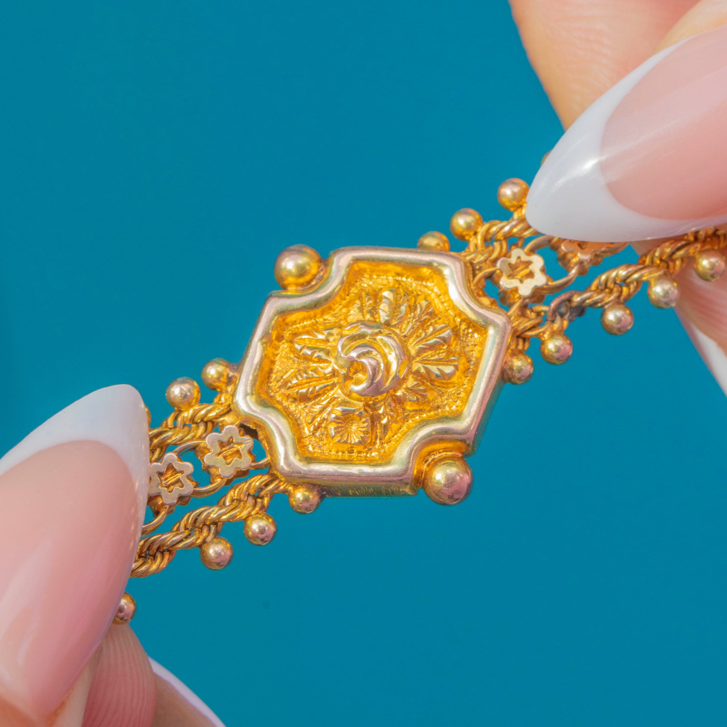 This charming Victorian Albertina bracelet is crafted in rich 9ct Gold, showcasing ornate detailing and exquisite craftsmanship. The bracelet features an intricate woven design with delicate floral links, edged by beaded Gold details, creating a beautifully textured and decorative finish. At the centre sits an ornate hexagonal medallion with a raised floral motif, and the bracelet fastens with its original dog clip and T-bar.