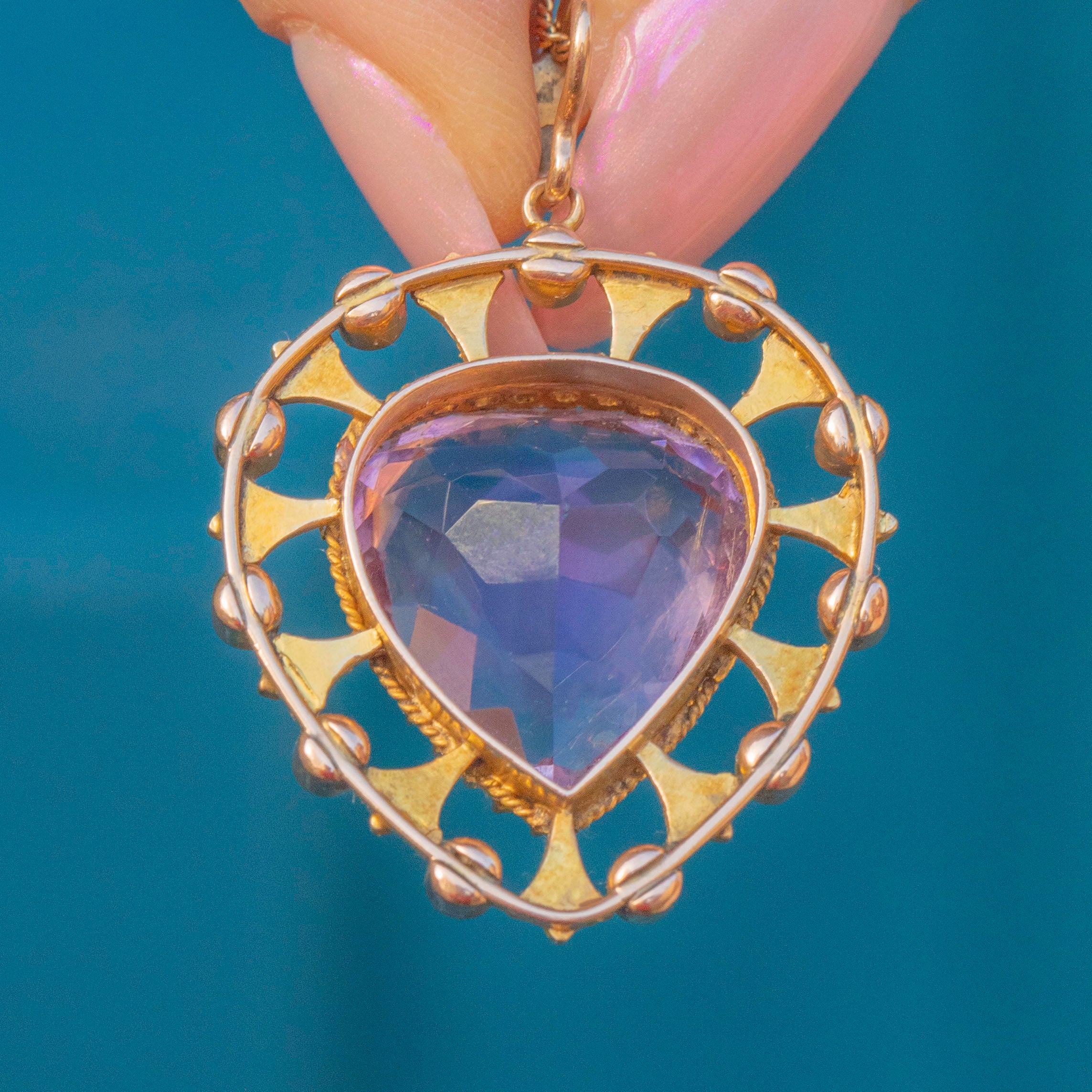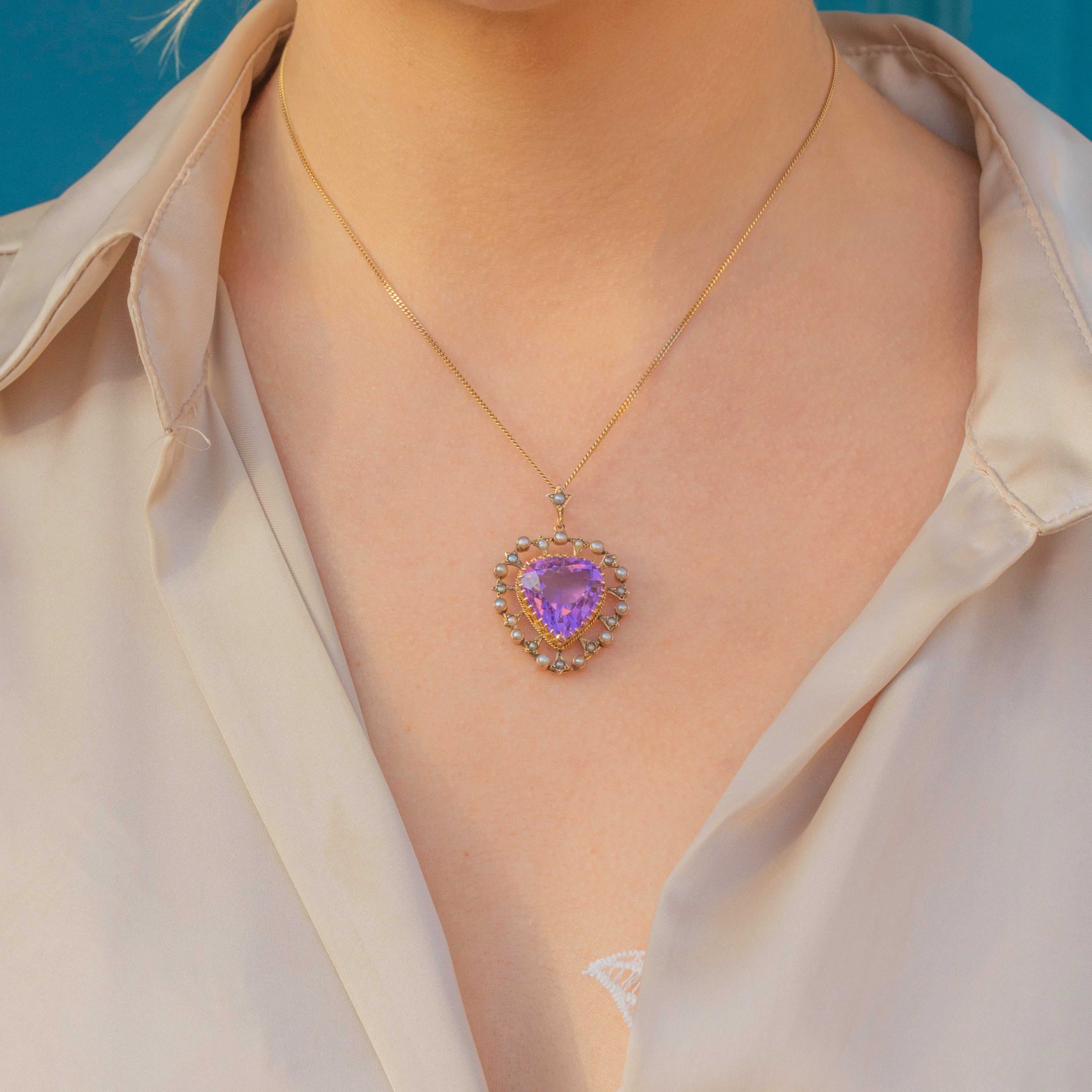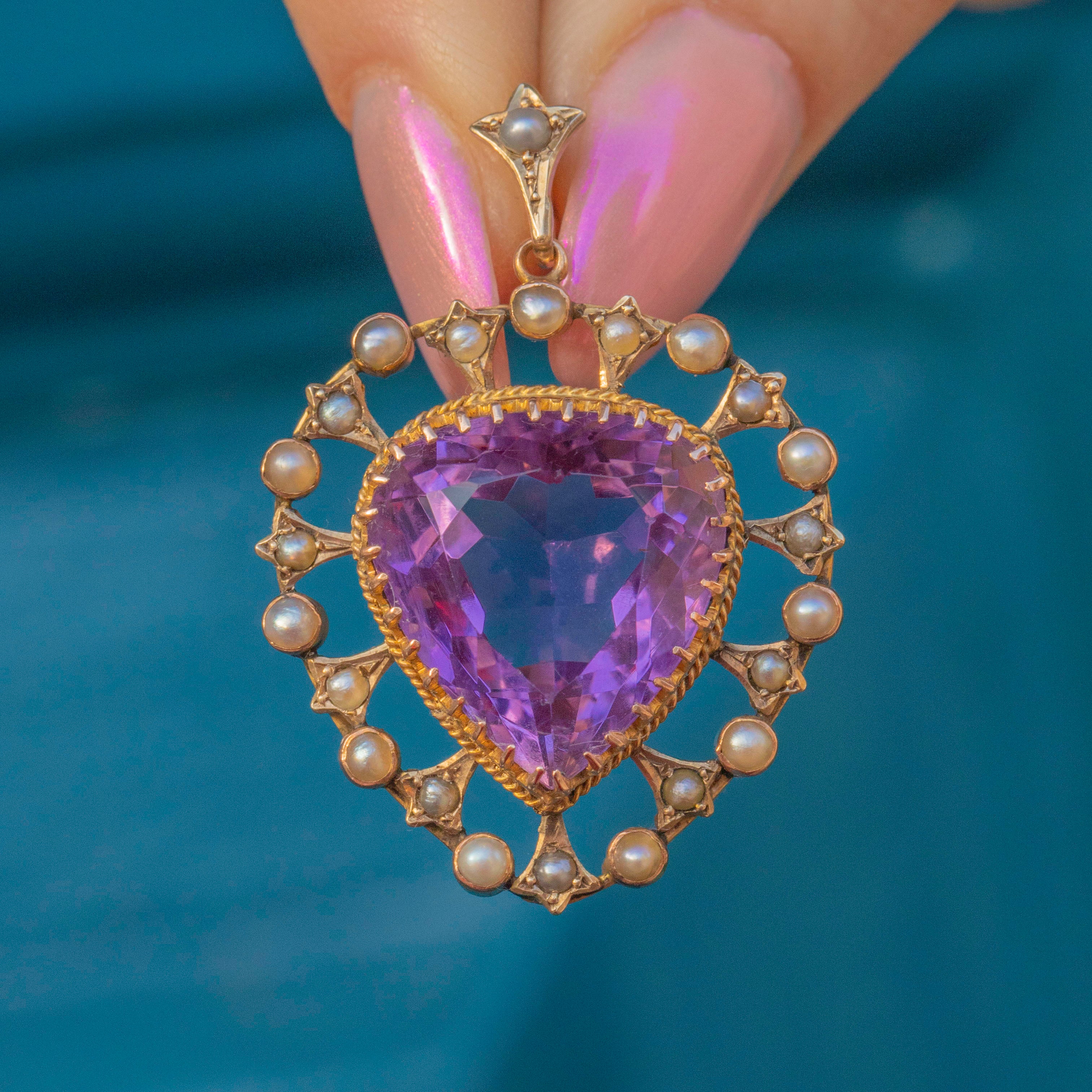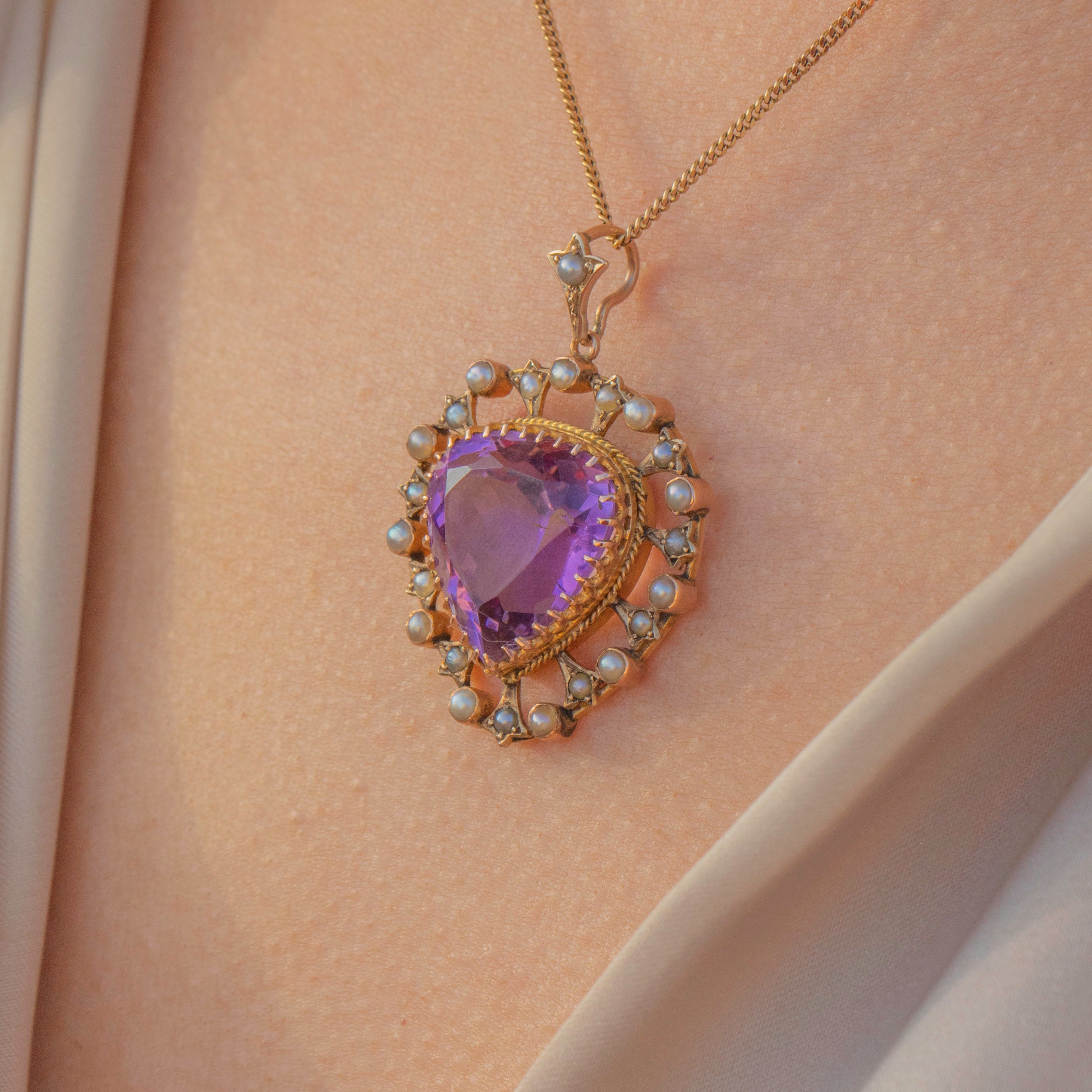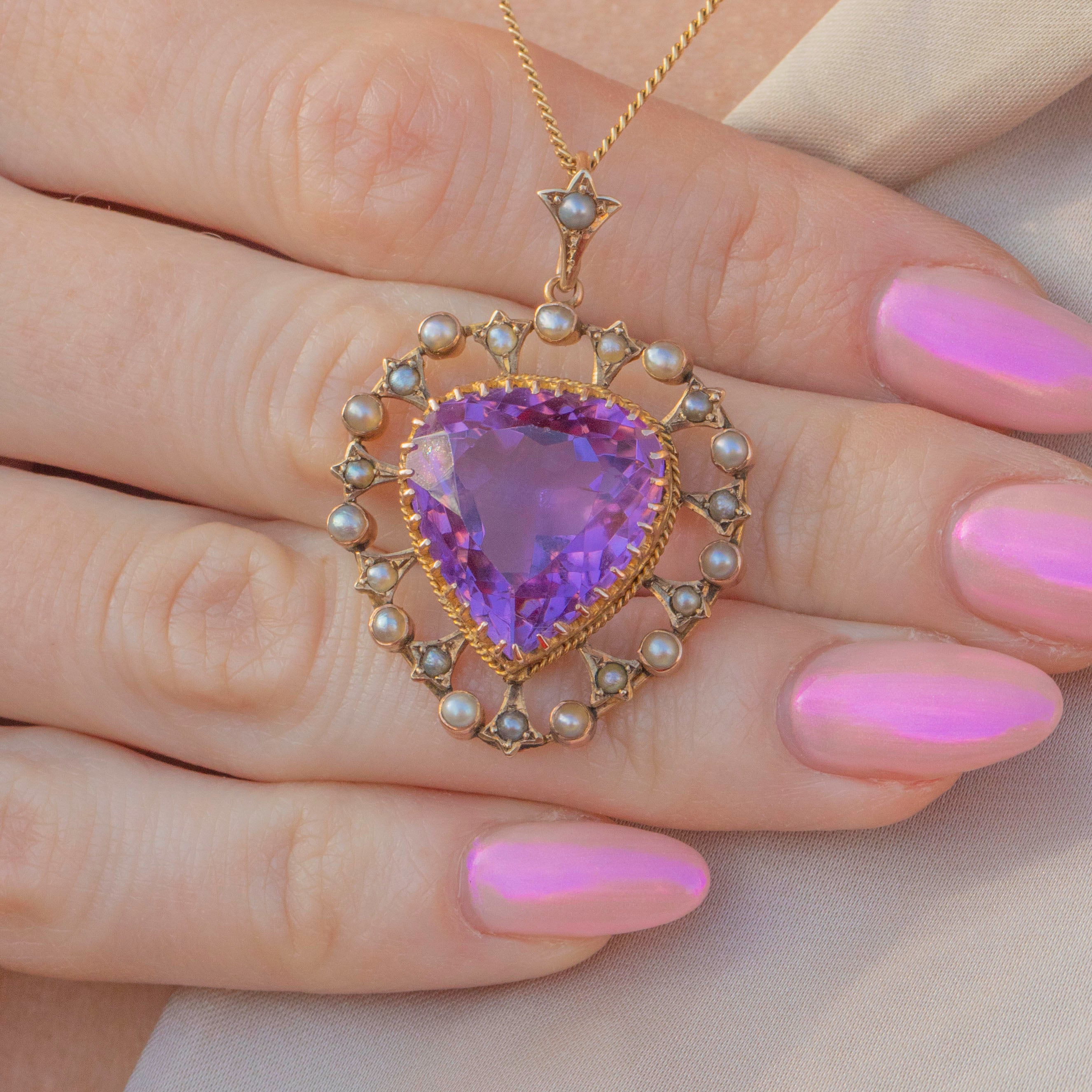 VERY GOOD. This Victorian 9ct Gold Amethyst Pearl heart pendant is in very good condition! The Amethyst has a gorgeous lavender hue and is wonderfully faceted. She has a small nibble on the back of the pendant and some minor scratches, however, this is only noticeable under a jeweller's loupe. Her Pearls and Gold are radiant and are set securely so you can wear her with confidence.