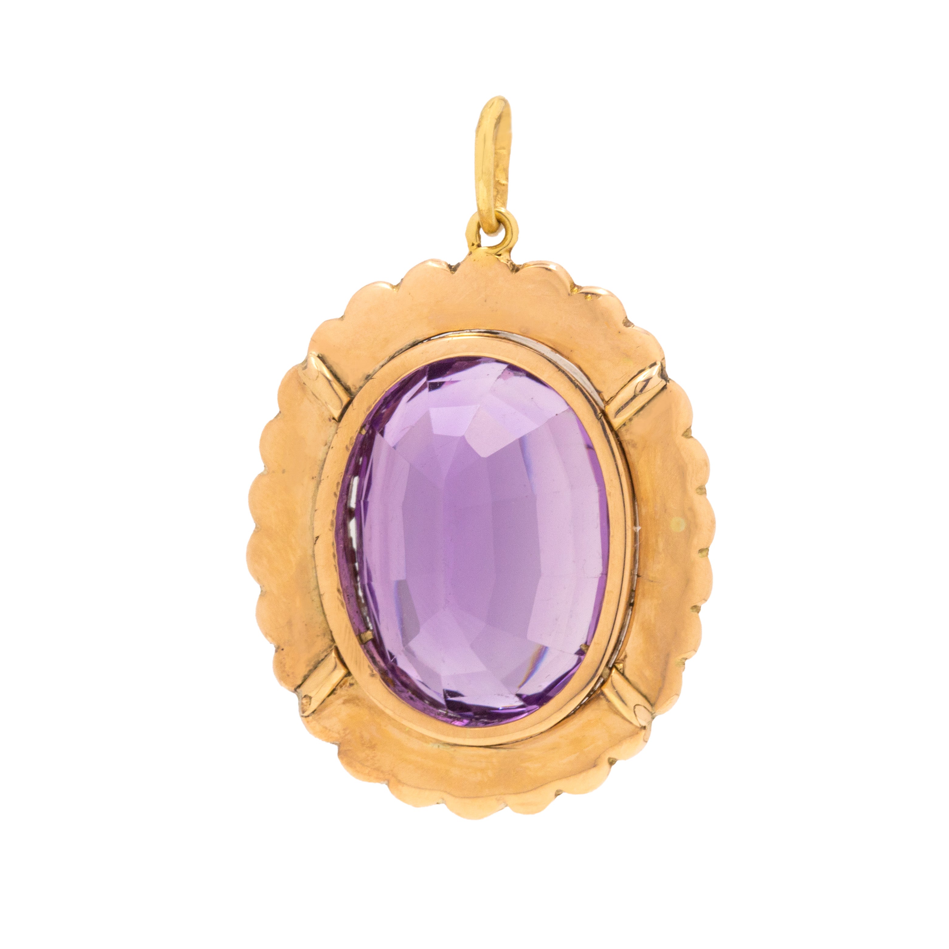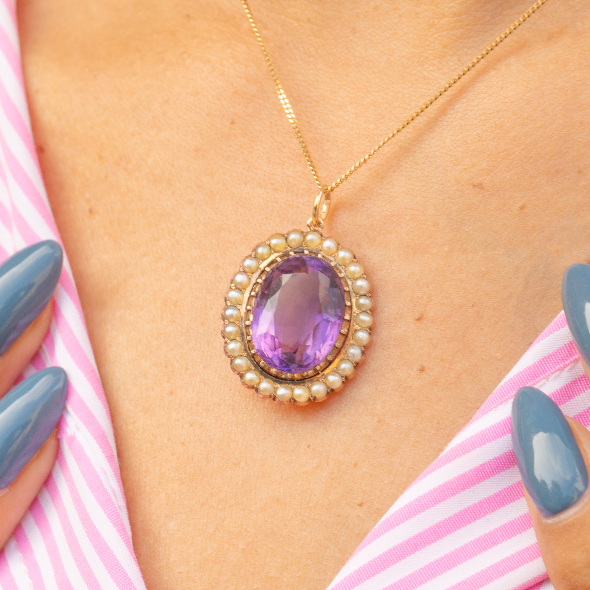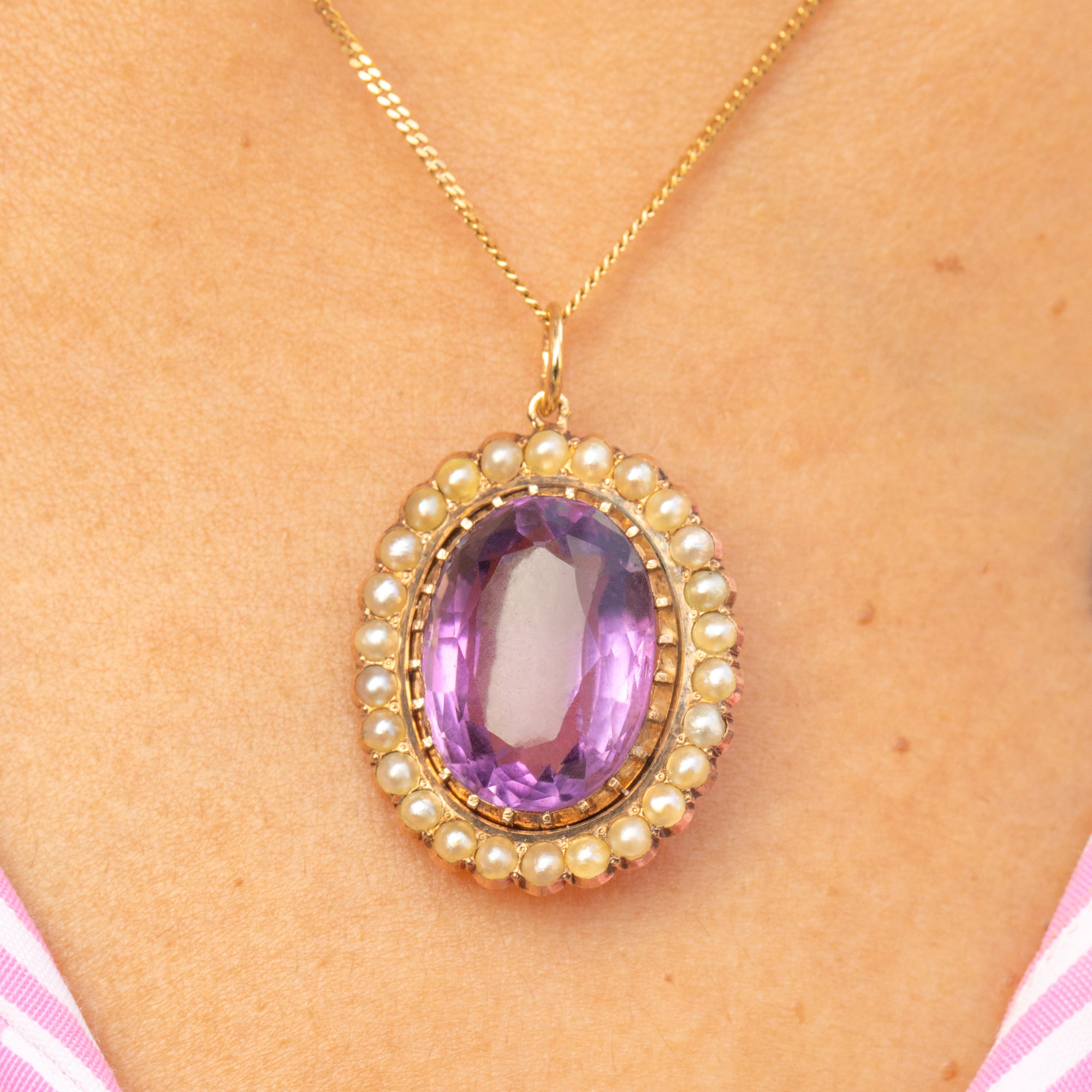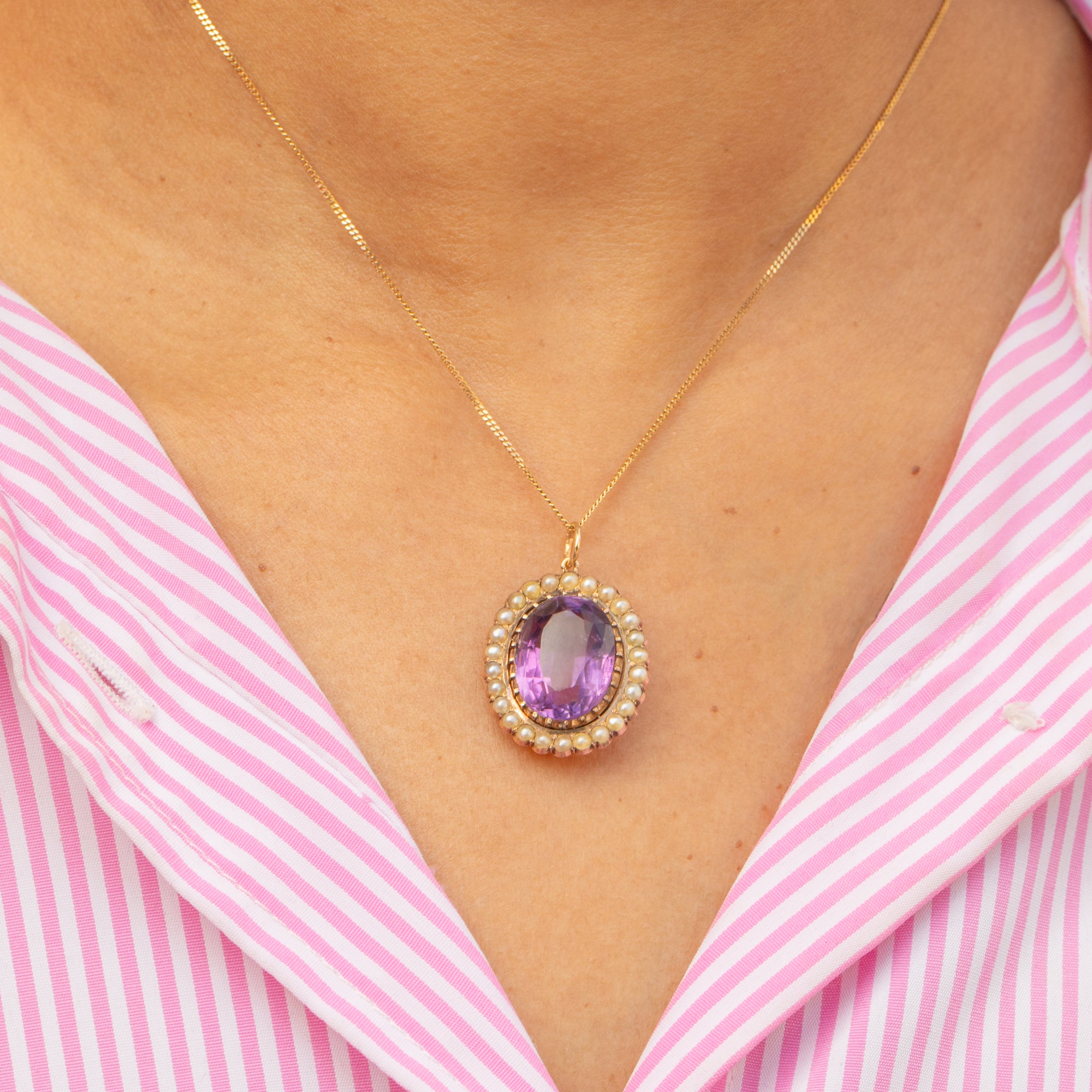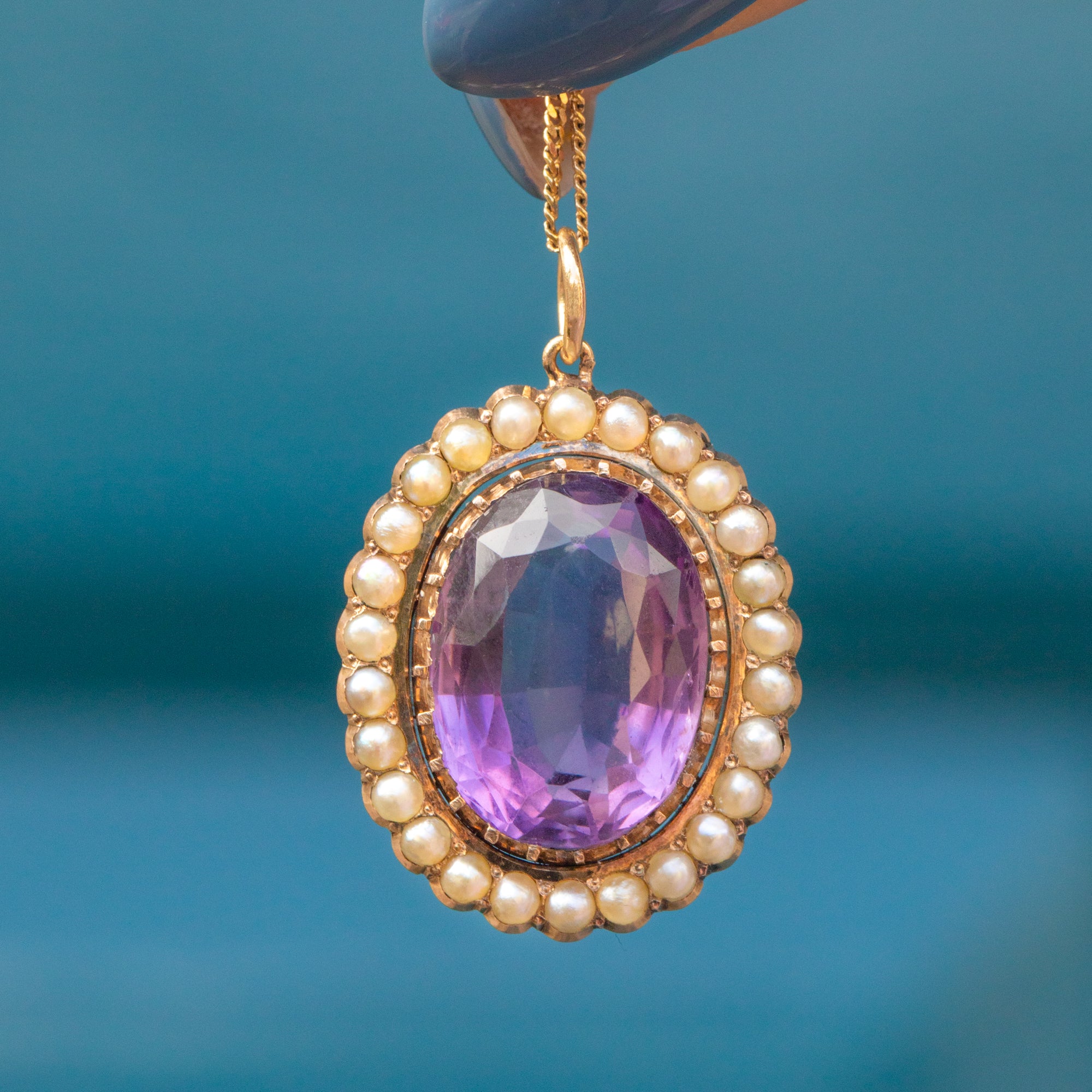 ヴィクトリアン 9ct ゴールド アメジスト パール オーバル ペンダント、9.00ct。