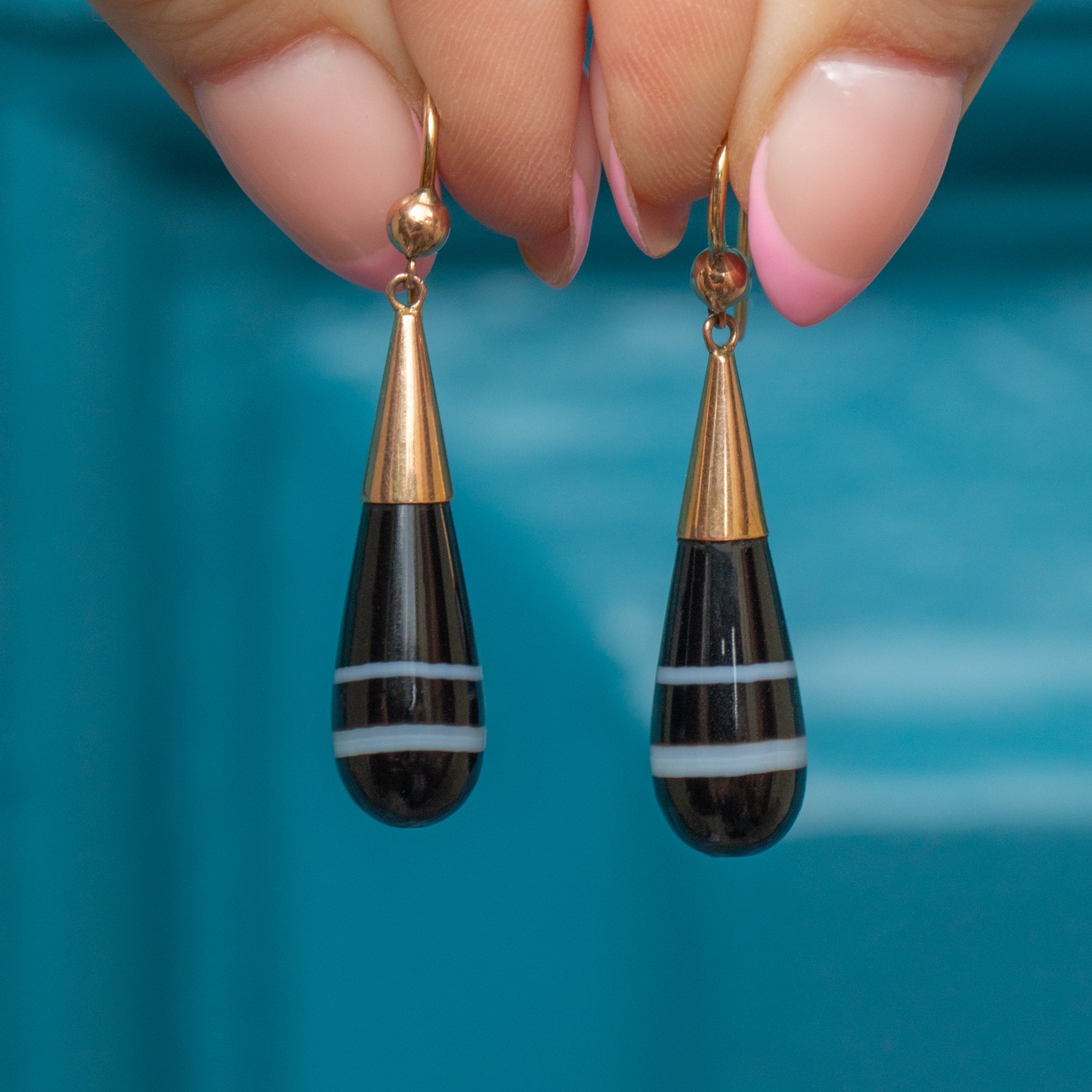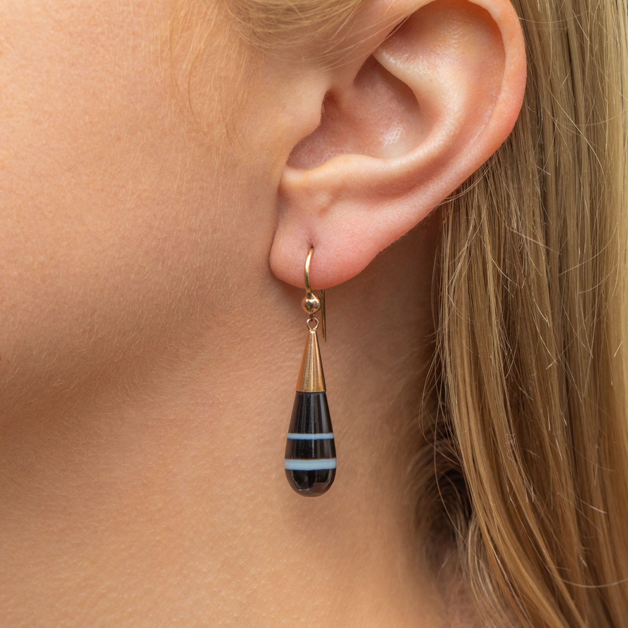 EXCELLENT. We are pleased to present these antique banded Agate drop earrings in excellent condition! The Agate is pristine and securely affixed to the 9ct Gold hooks, with no damage to note. With each component firmly connected, these antique earrings provide fluidity and safety when worn!