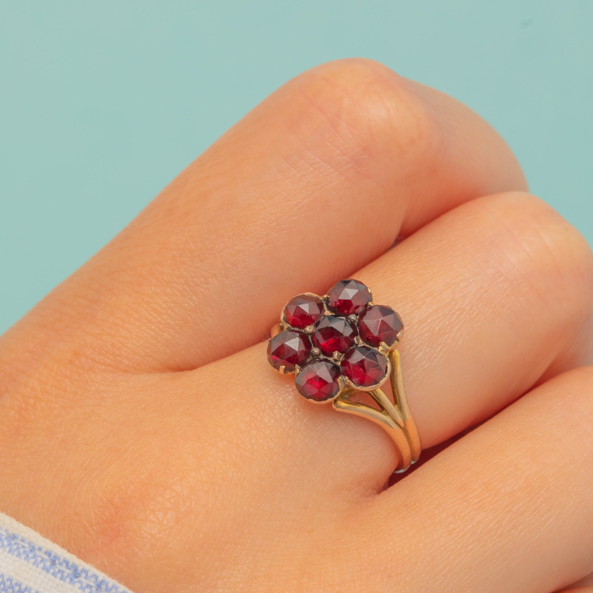 VERY GOOD: This Victorian 9ct Gold Bohemian Garnet flower cluster ring is in very good condition. The ring has plump and juicy gemstones neatly set, there is some mild wear to the stones, including a few abrasions to two of the Garnets - however this is nothing too untoward. The ring band is lovely and the piece wears like an absolute dream!