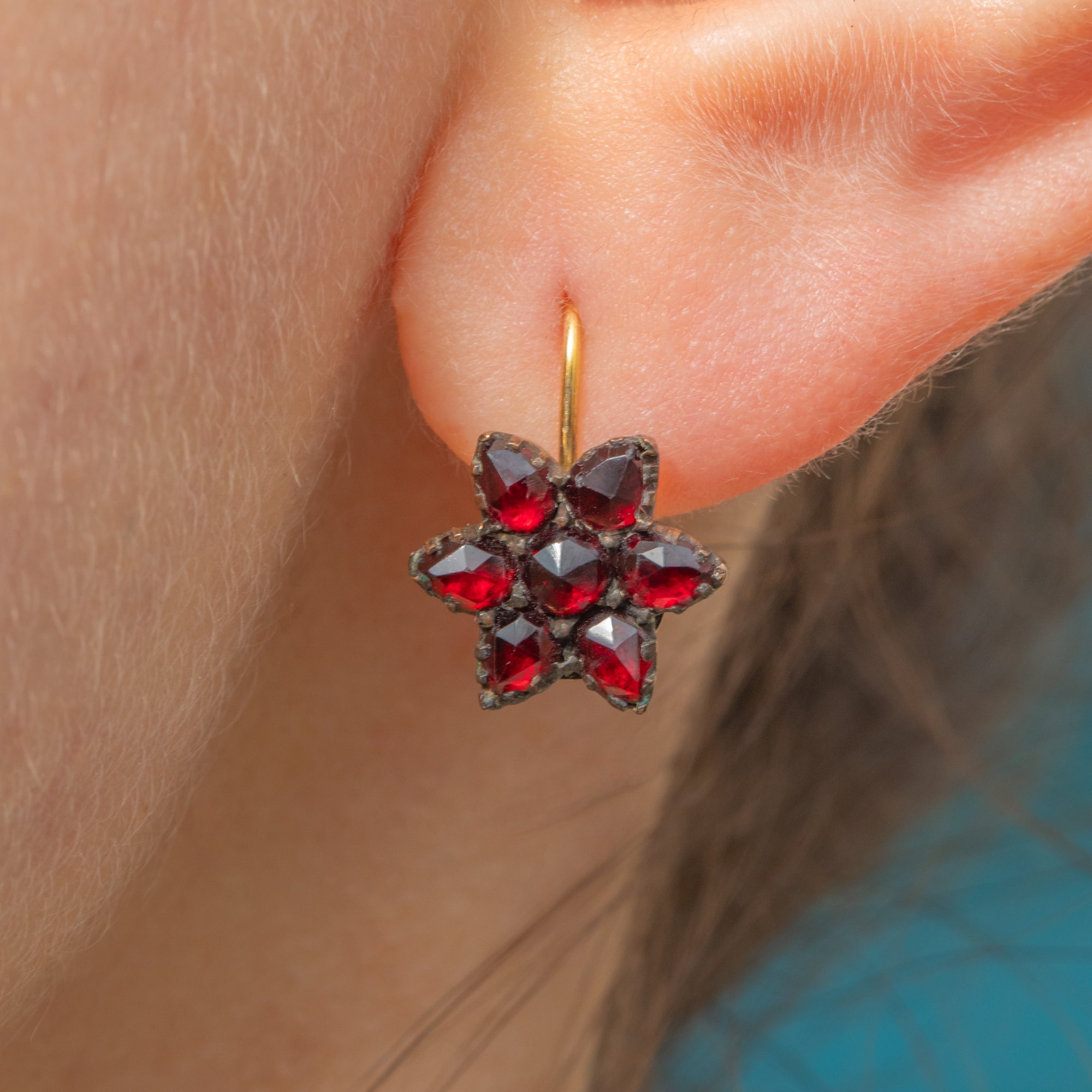 VERY GOOD: These antique Garnet flower cluster earrings are in very good condition! Each Garnet is present and secure, retaining the intense red hues Bohemian Garnets are known for. The Garnet Gold settings do have some wear on the back and there is one small chip to one of the Garnets, but this is not noticeable when they're when worn. The later added 9ct Gold hooks are slender and robust, allowing you to wear them in comfort and style!