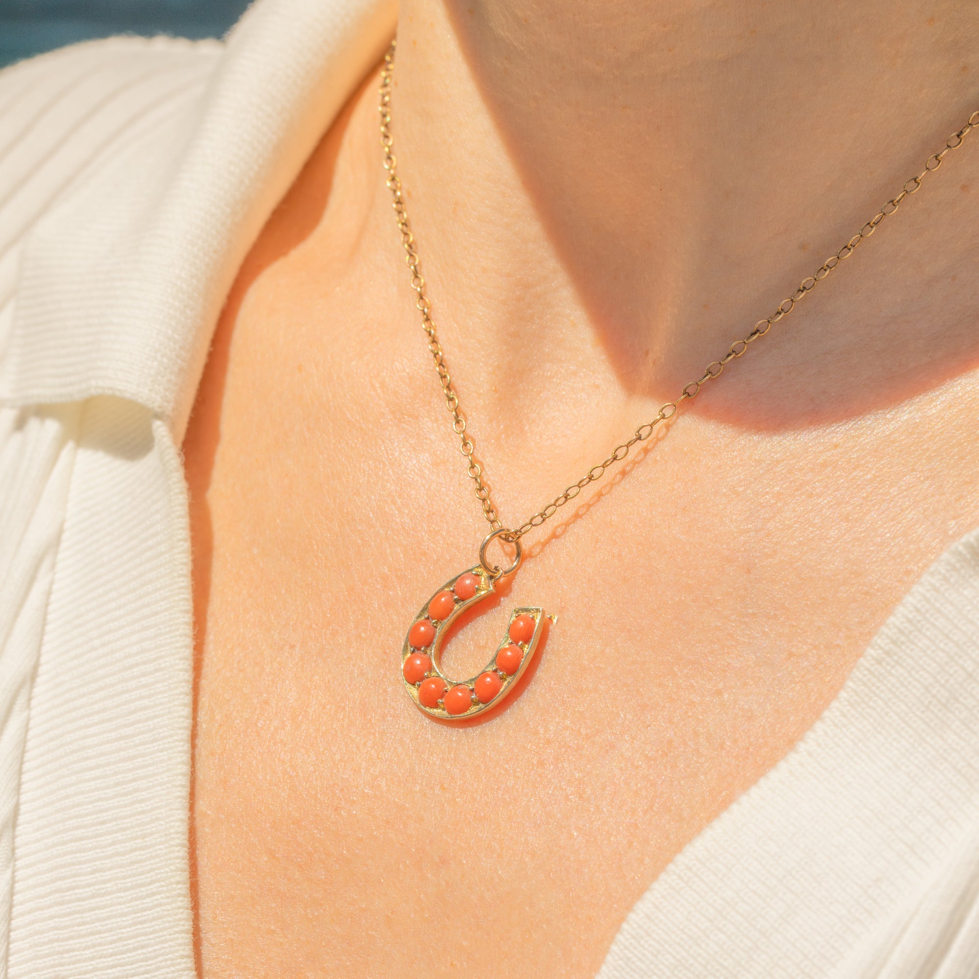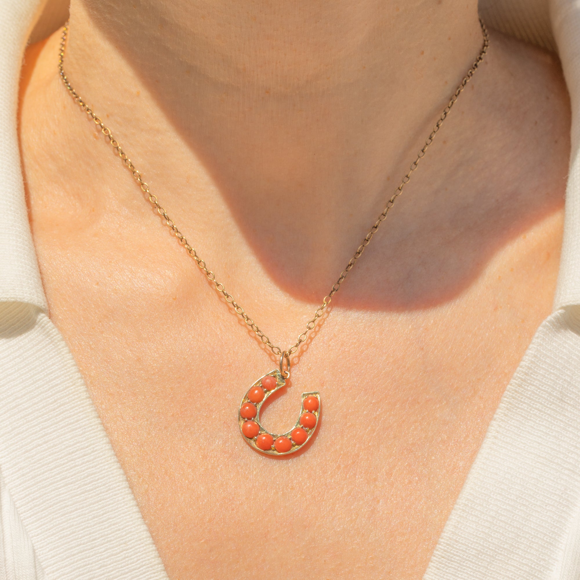 VERY GOOD: This Victorian 9ct Gold Coral horseshoe charm is in very good condition. Each of her gemstones is free from surface wear and sits securely within its setting. There are some signs of wear to the Gold commensurate with age, however, this cannot be seen while the pendant is worn. Complete with a large jump ring, you can wear this antique horseshoe pendant from a chain with confidence!