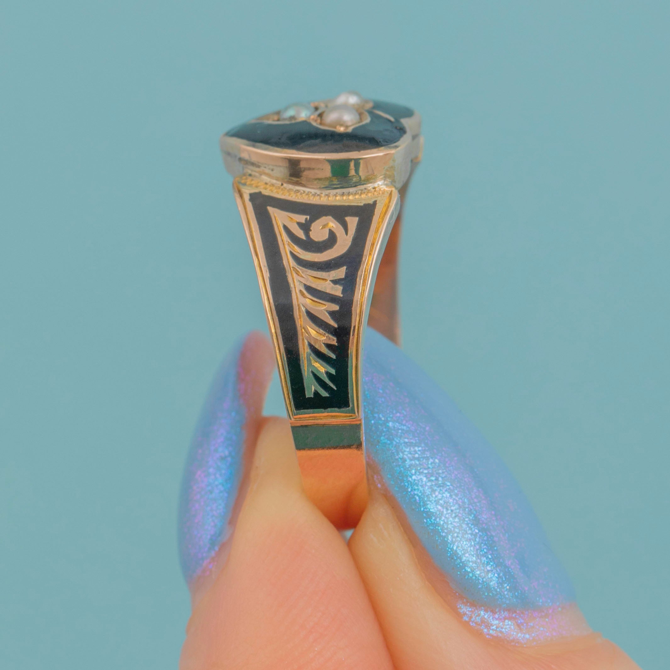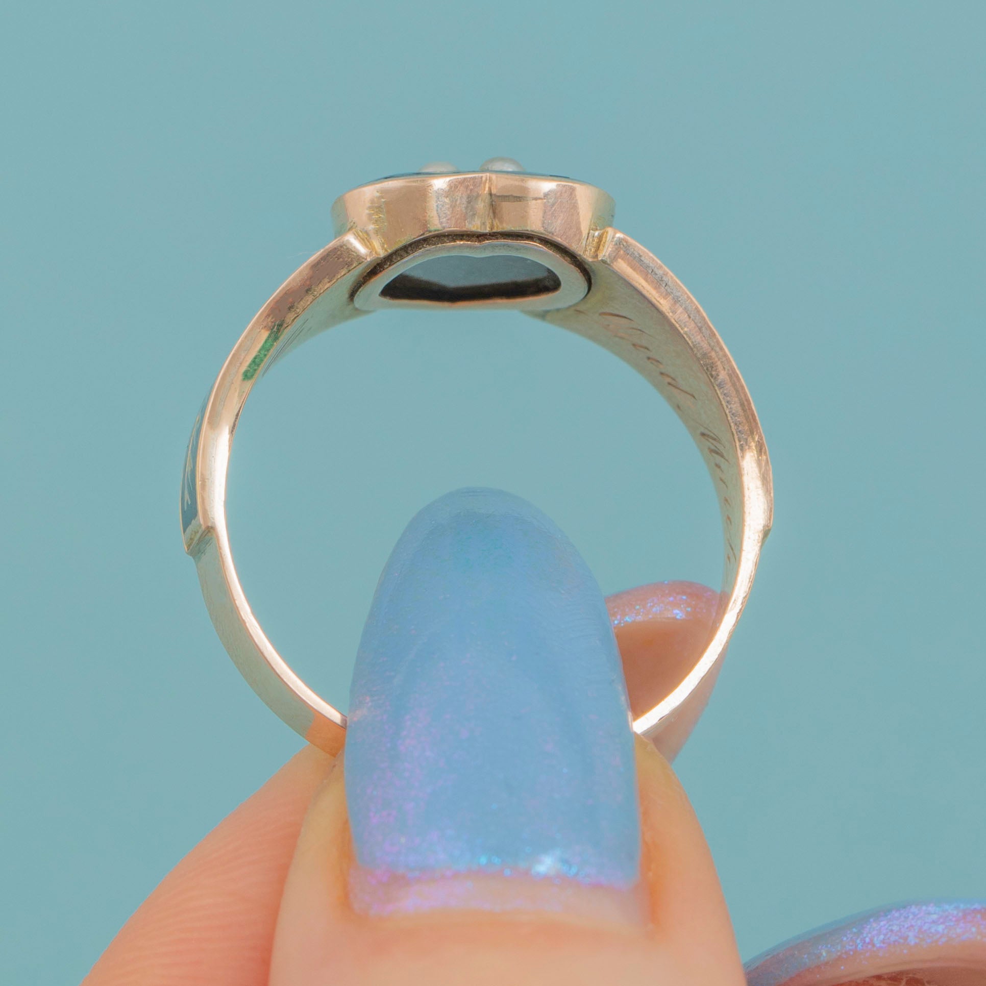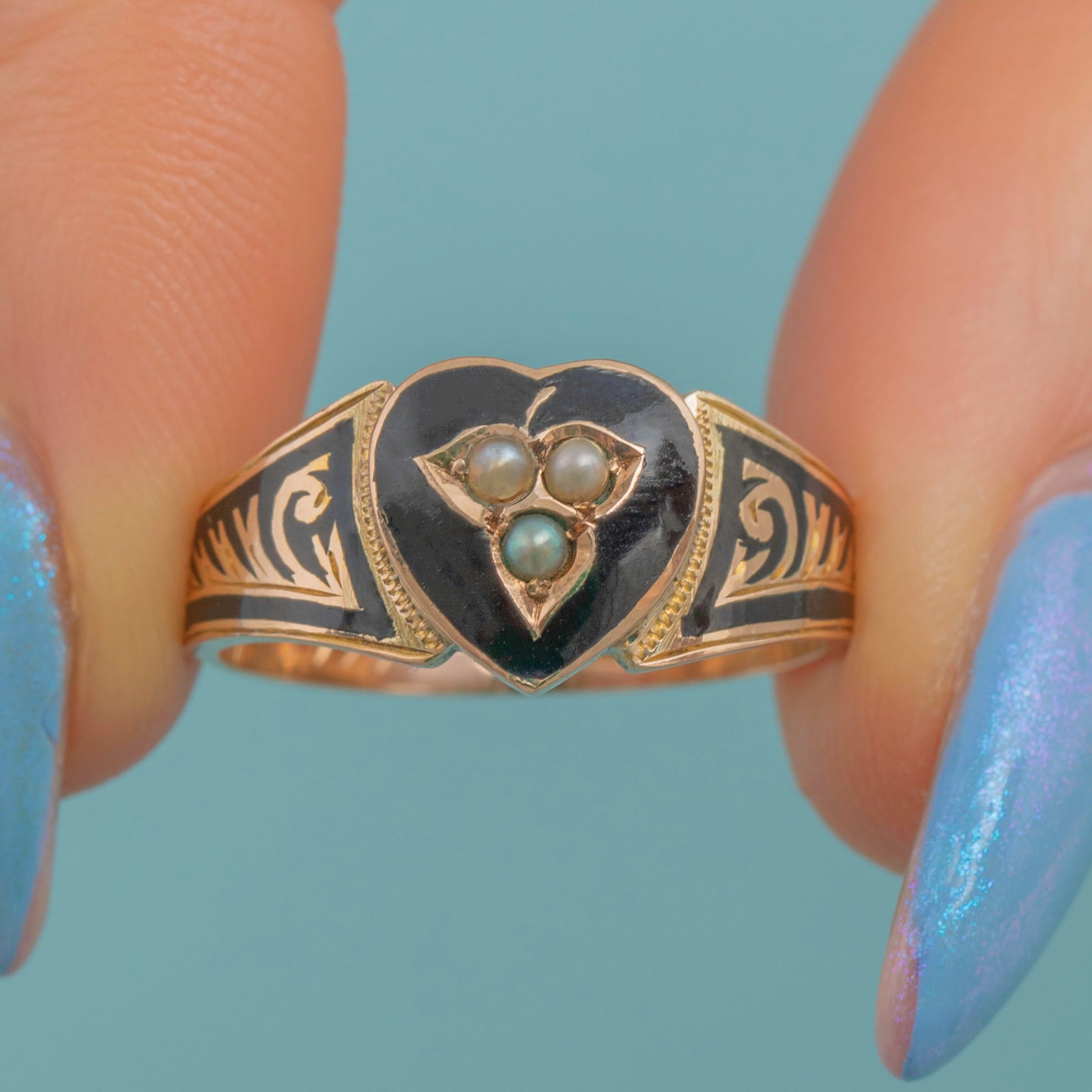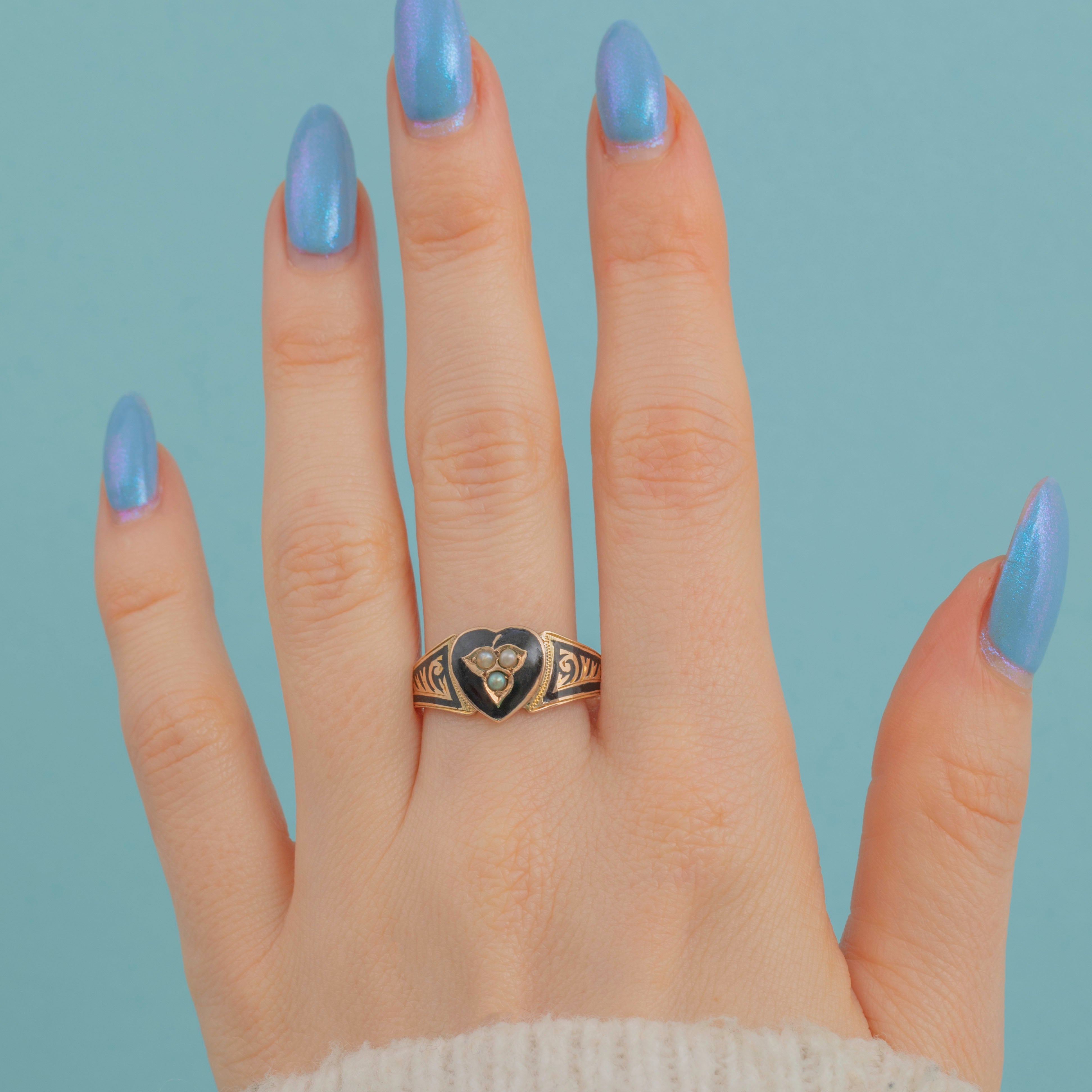 EXCELLENT. This Victorian 9ct Gold Enamel Pearl heart mourning ring is in excellent condition. The ring has been kept beautifully, even more so when you take the age of this ring into consideration. The Enamel work is pristine and the Pearls have remained secure. The hallmarks stamped inside the band are clear allowing us to date this coveted piece of Victorian mourning jewellery to 1898!