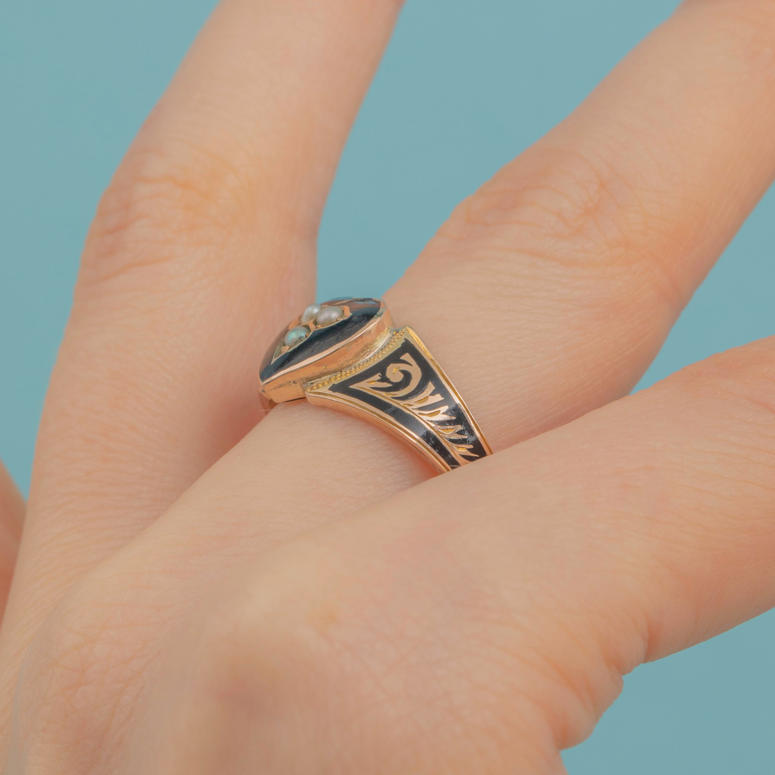 Victorian 9ct Gold Enamel Pearl Heart Mourning Ring, c.1898