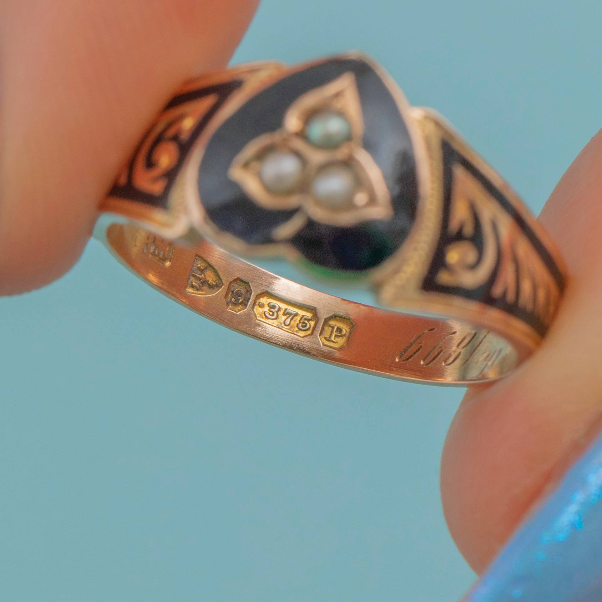 MATERIALS: Tests as 9ct Gold, Black Enamel, Pearls.