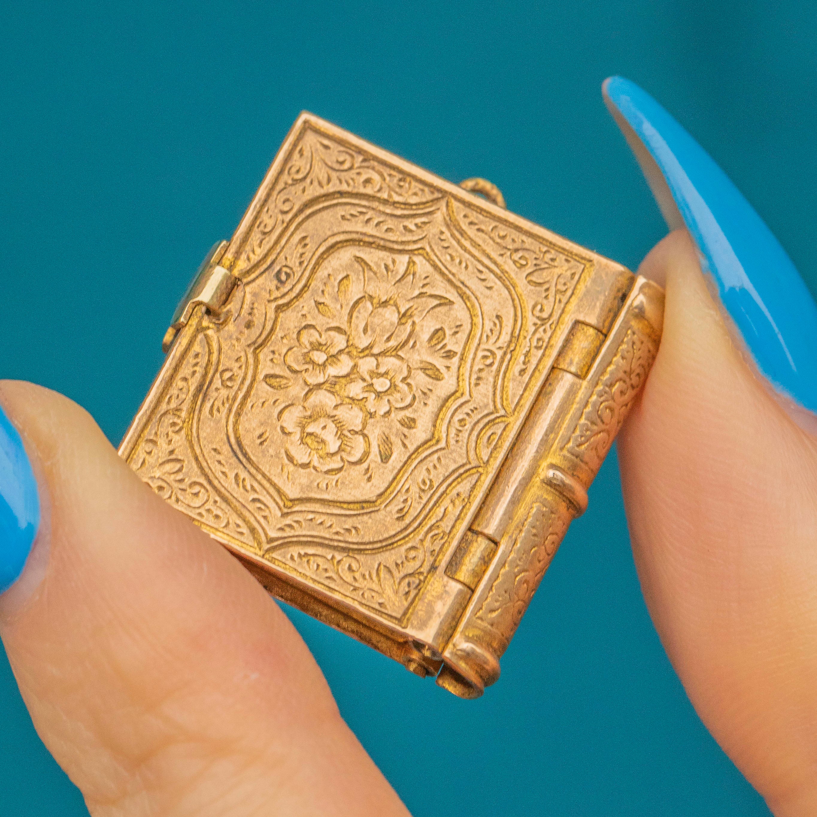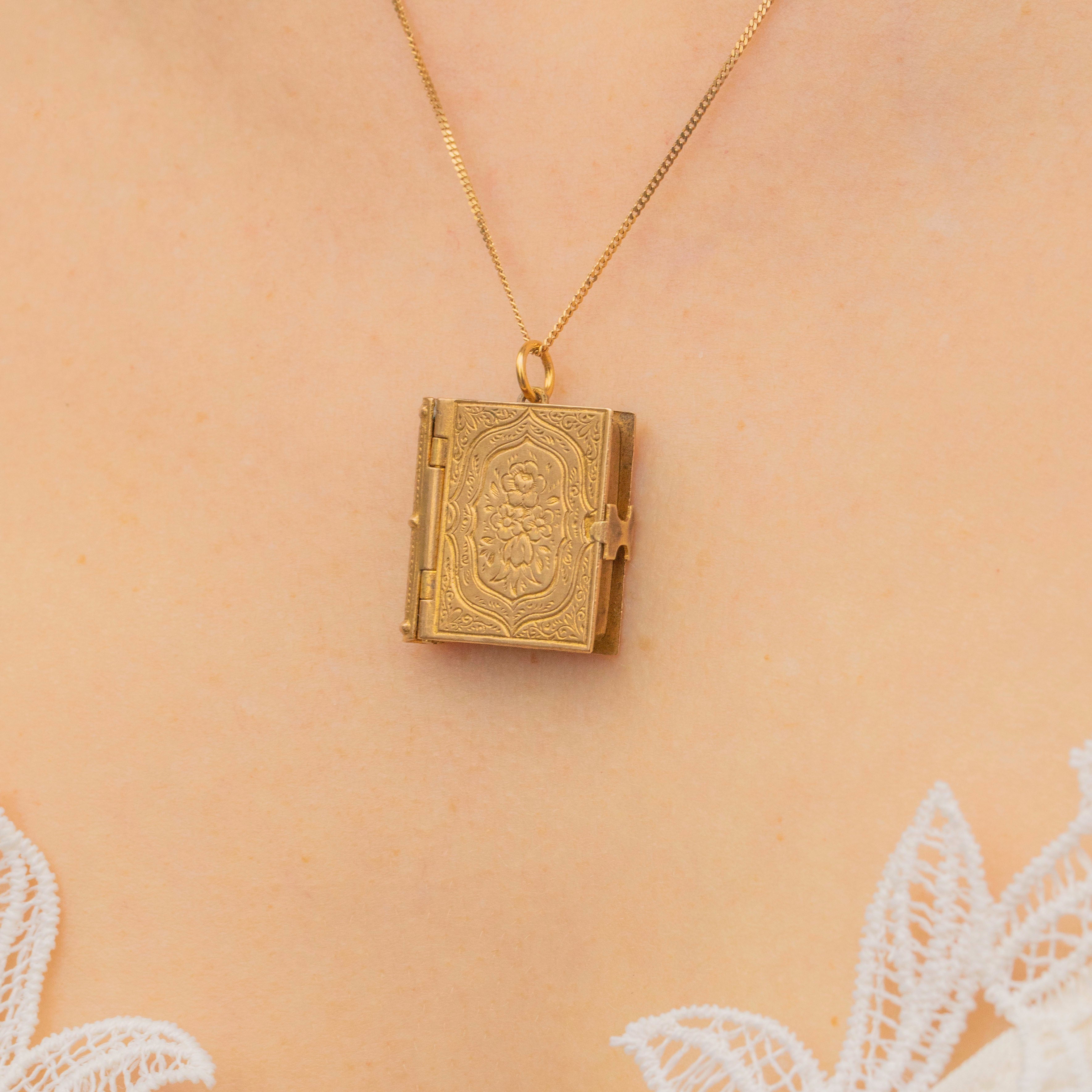 Continue to write your legacy with this Victorian 9ct Gold engraved book! Engraved with sentimental forget-me-nots both front and back, this book locket opens to reveal two engraved 'pages' in which you can place four photos.
