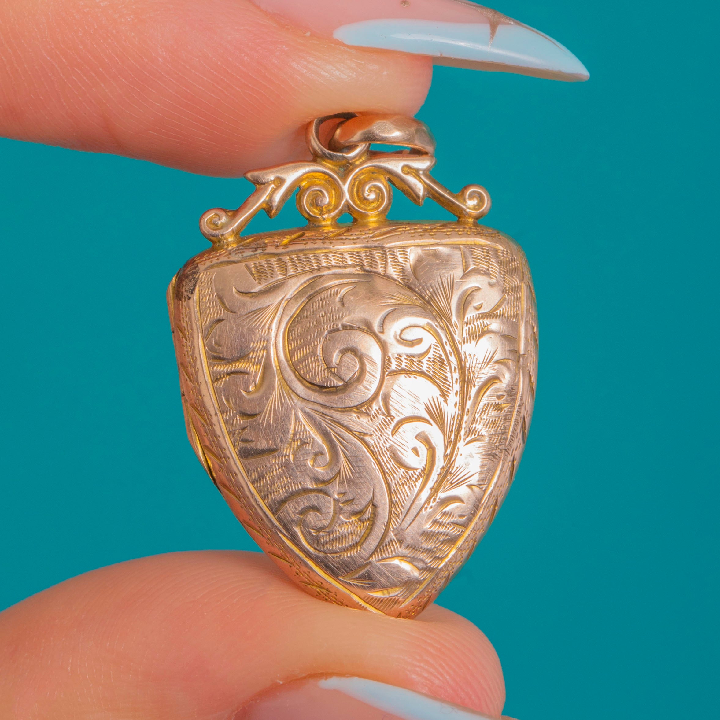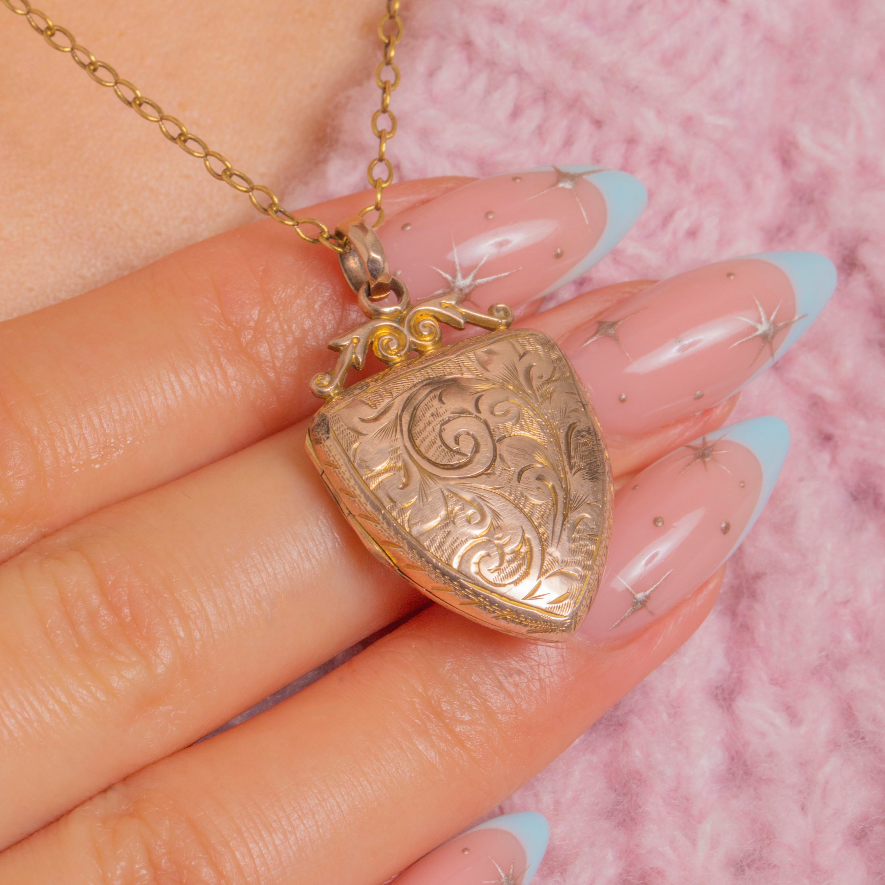 優美で華やかなこのVictorian時代のシールドロケットは、明るいカットの草花模様の彫刻と、中央に整然と配されたハート形のカルトゥーシュで豊かに装飾されています。小ぶりな渦巻き状の頂飾りと丸いジャンプリングが全体の輪郭を引き締め、王冠のような愛らしい趣を添えています。