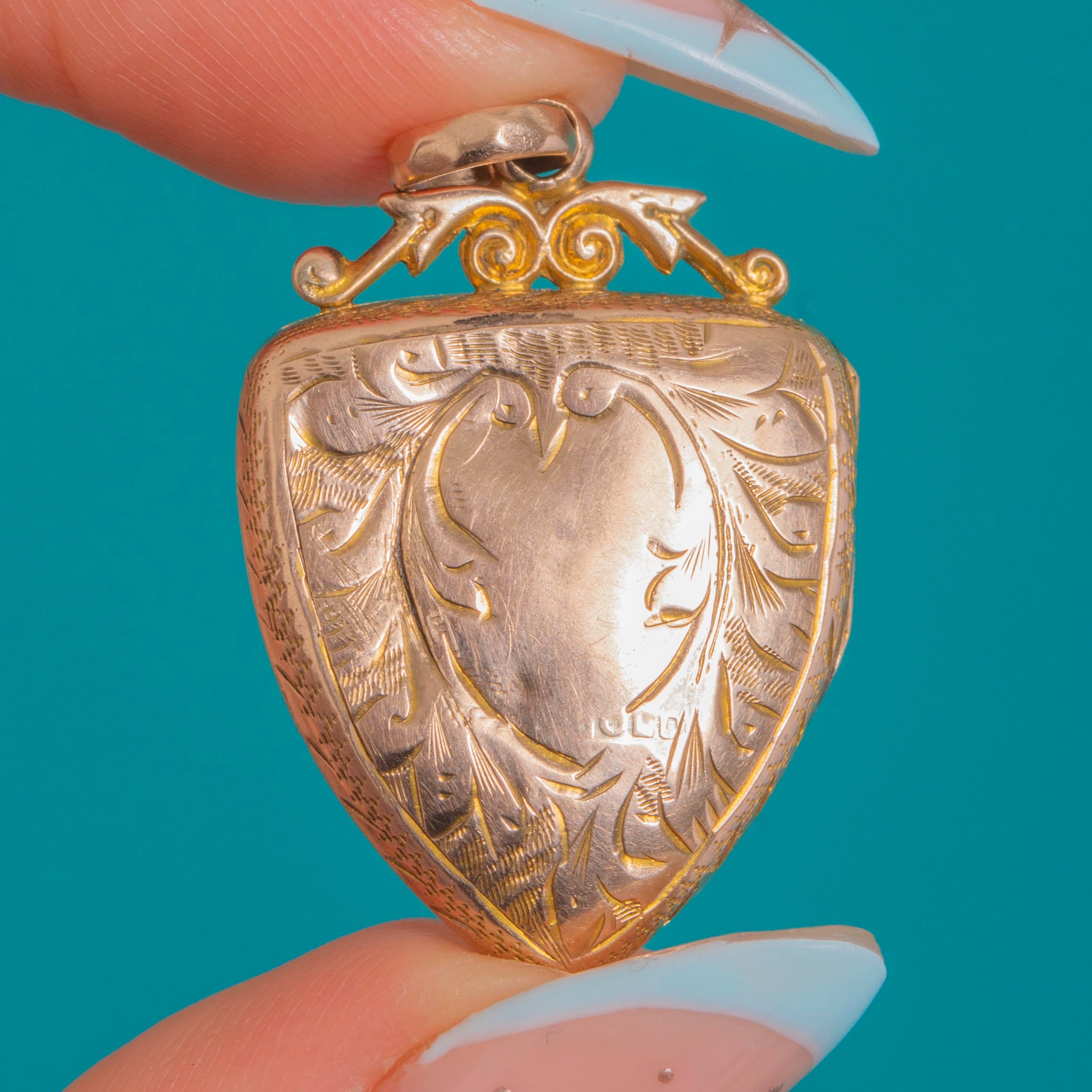 Victorian 九金 彫刻入り盾形ロケットペンダント