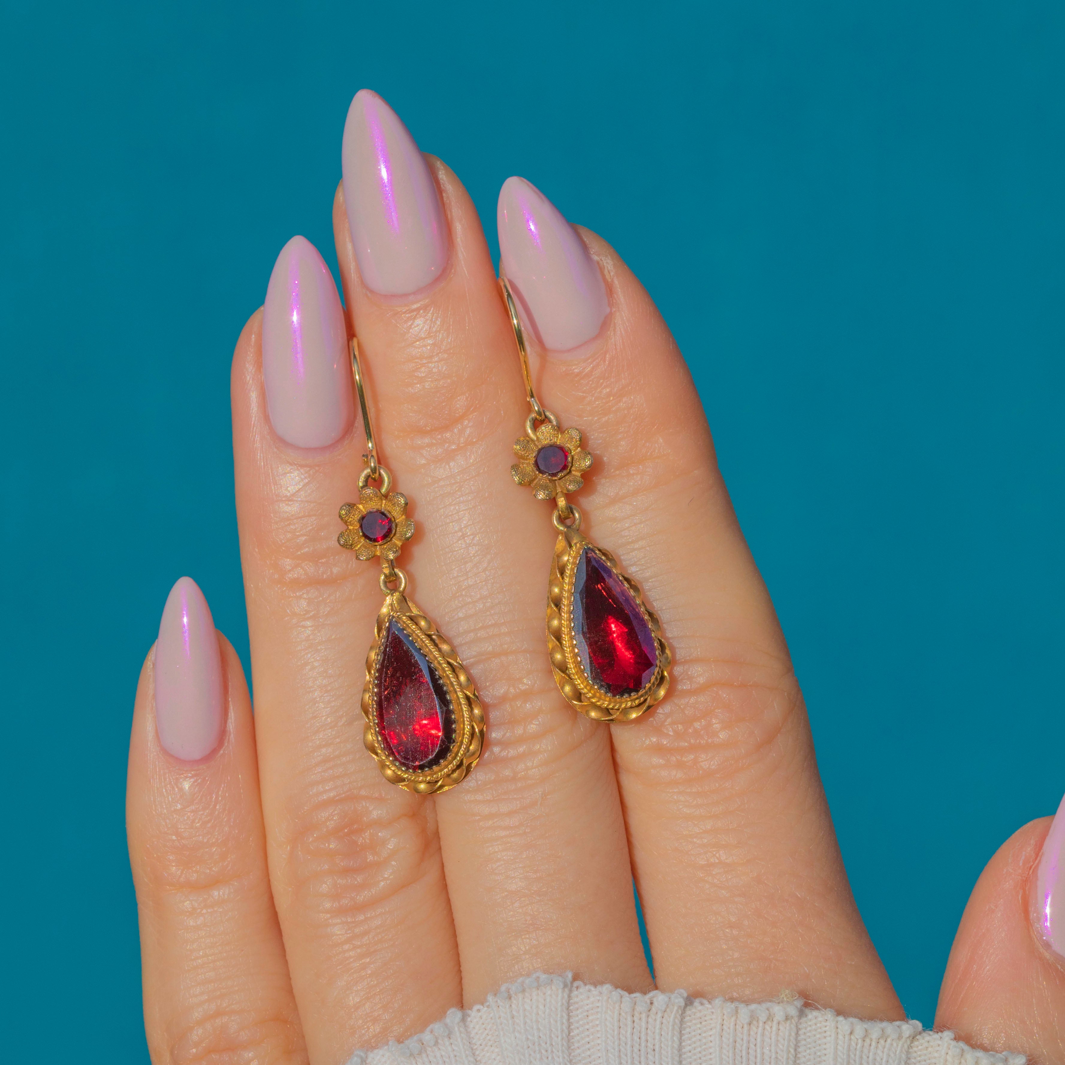 These stunning Victorian earrings are crafted in 9ct Gold and set with richly coloured Garnets. Each earring features a dainty Garnet flower at the top, suspending a vibrant teardrop Garnet framed in Gold. The combination of the glowing red stones and ornate settings gives them a beautiful period elegance.