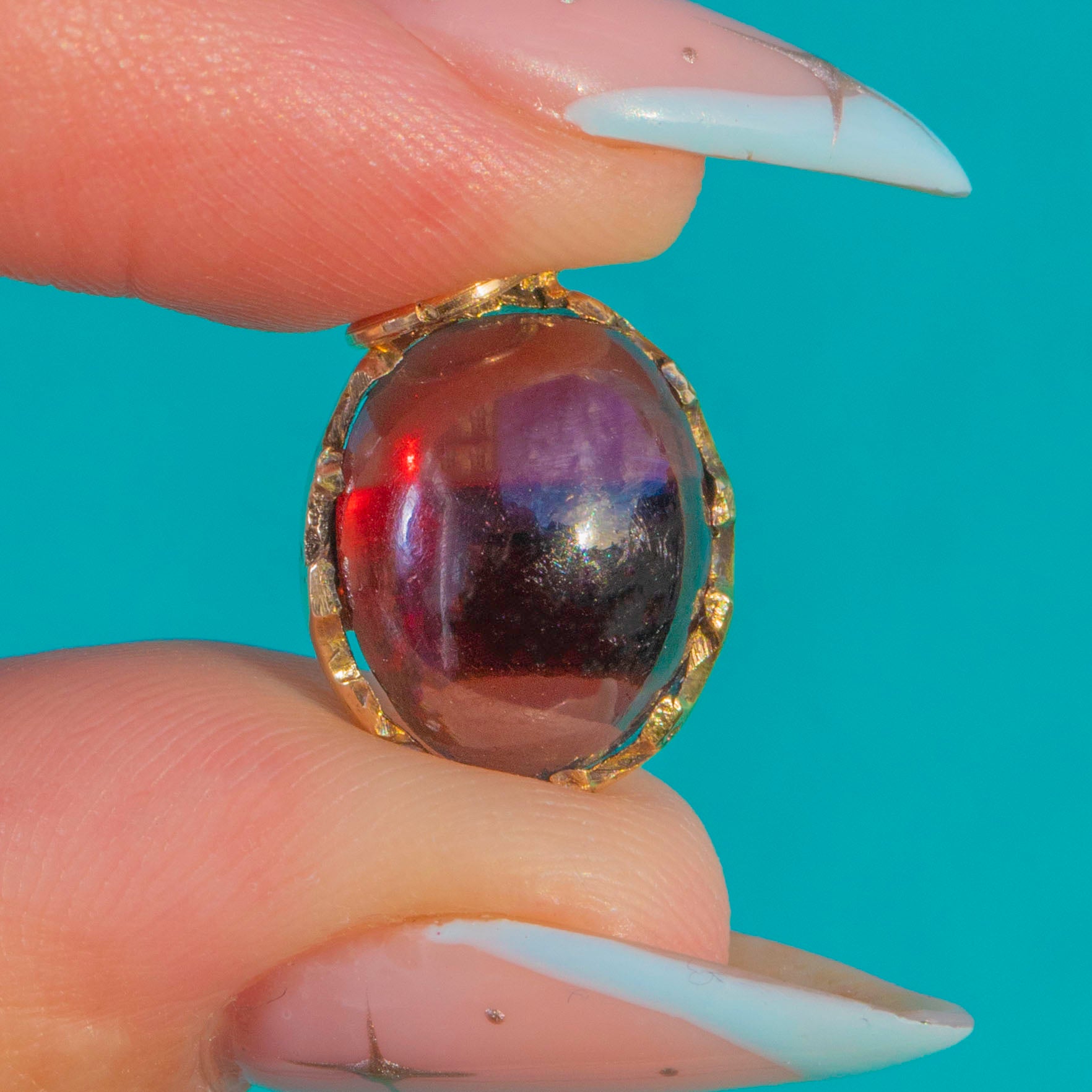 小ぶりなVictorian時代の逸品。深い赤紫色のガーネットを、繊細な槌目模様のある柔らかな色合いの15金で包み込んだ、気品あふれるペンダントです。高く盛り上がった9.27カラットのガーネットは、艶やかな表面と濃厚な葡萄酒色が光を受けて美しく輝き、時代を超えた優雅な趣を放ちます。