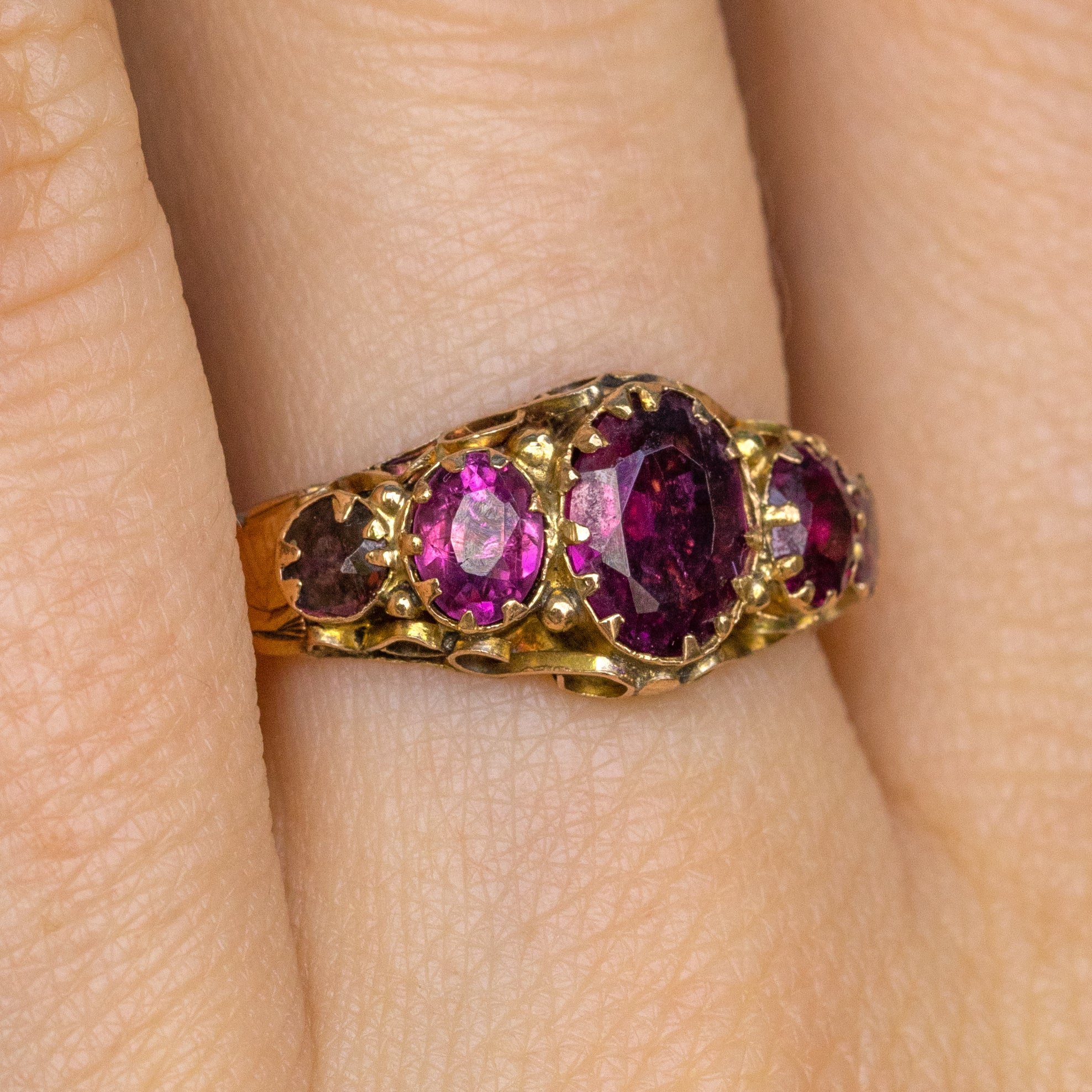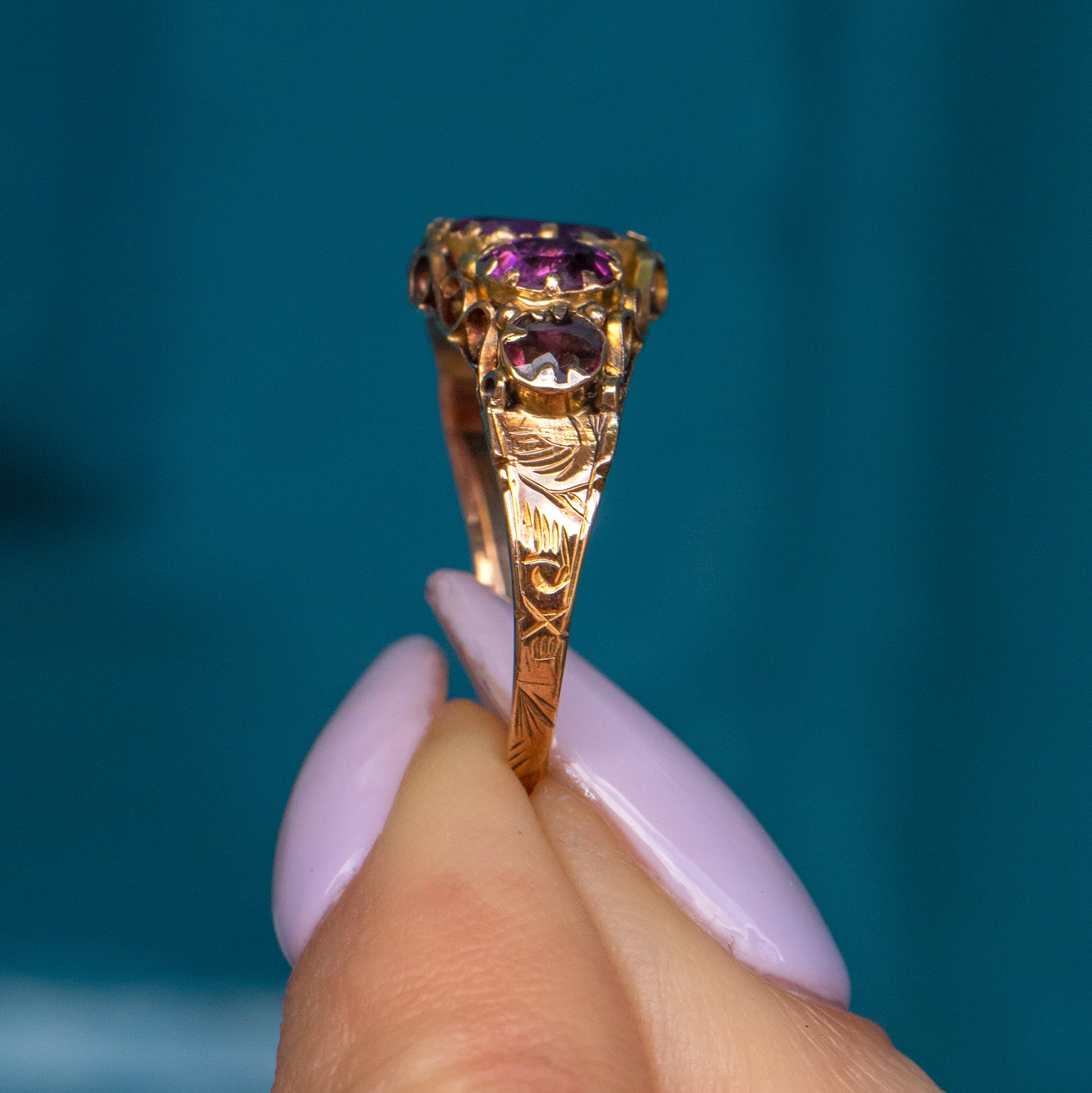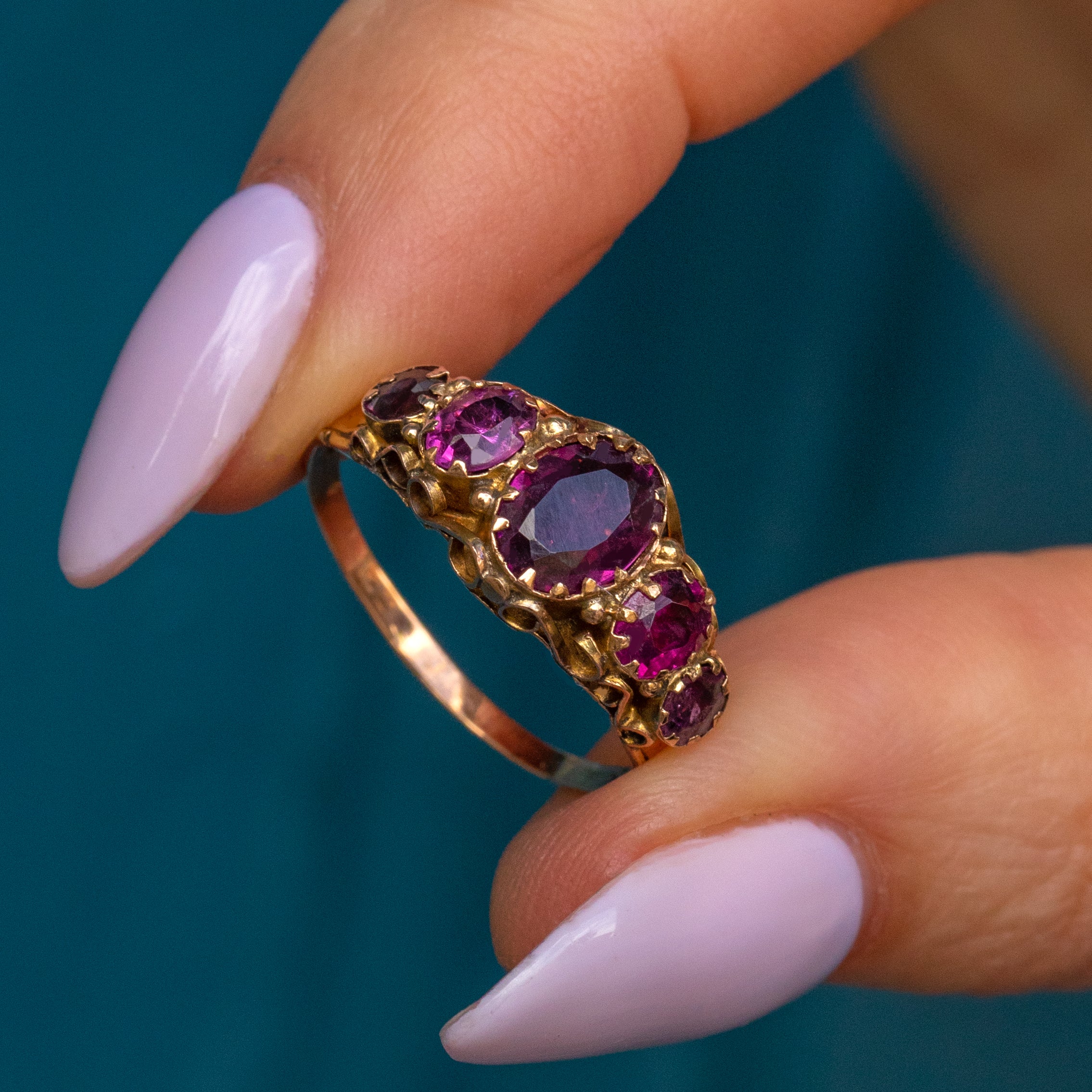 This Victorian 9ct Gold Garnet five stone ring is an antique collector's dream! Bursting with intricate craftsmanship, this antique ring homes five Garnets with punchy purple hues that glisten beneath the light.
