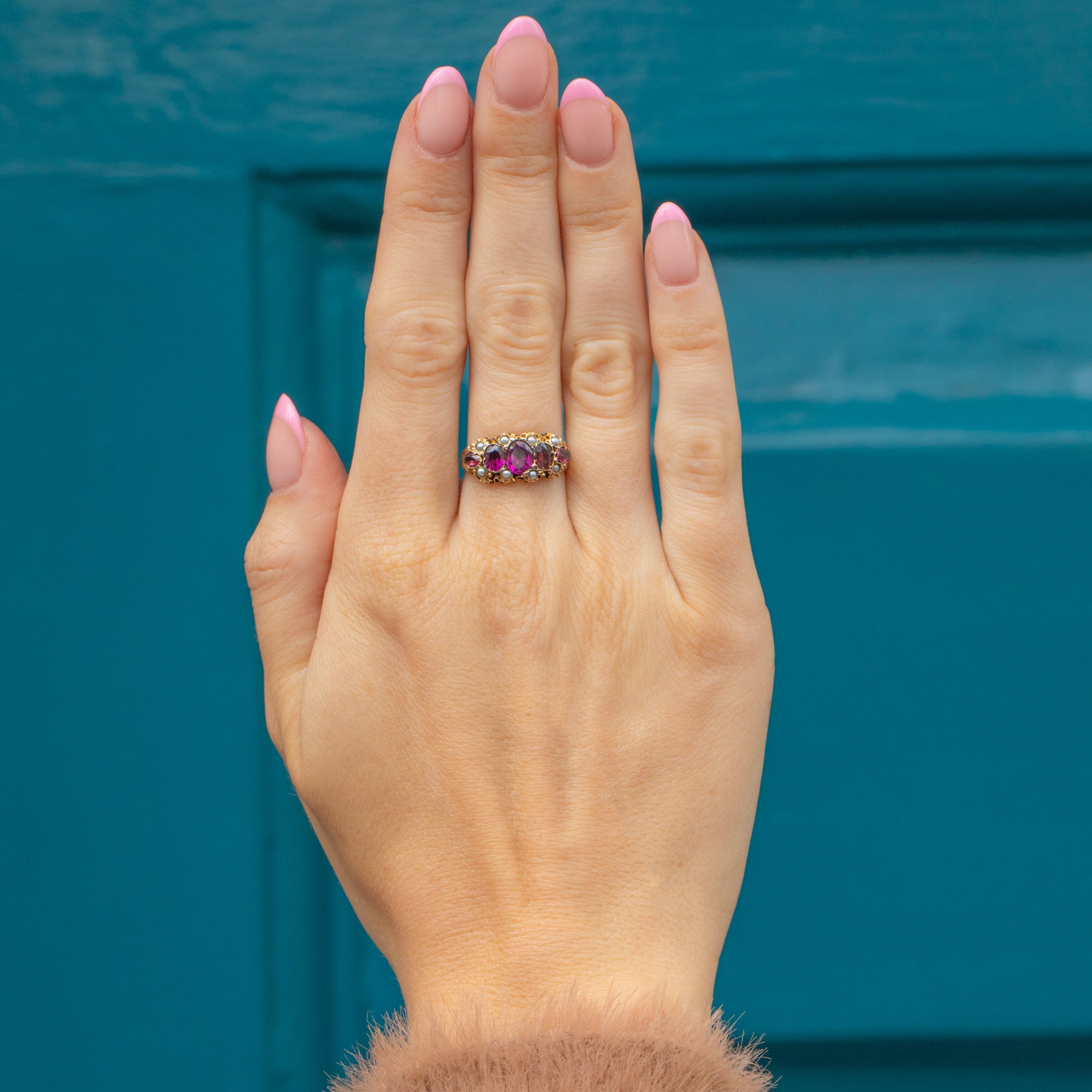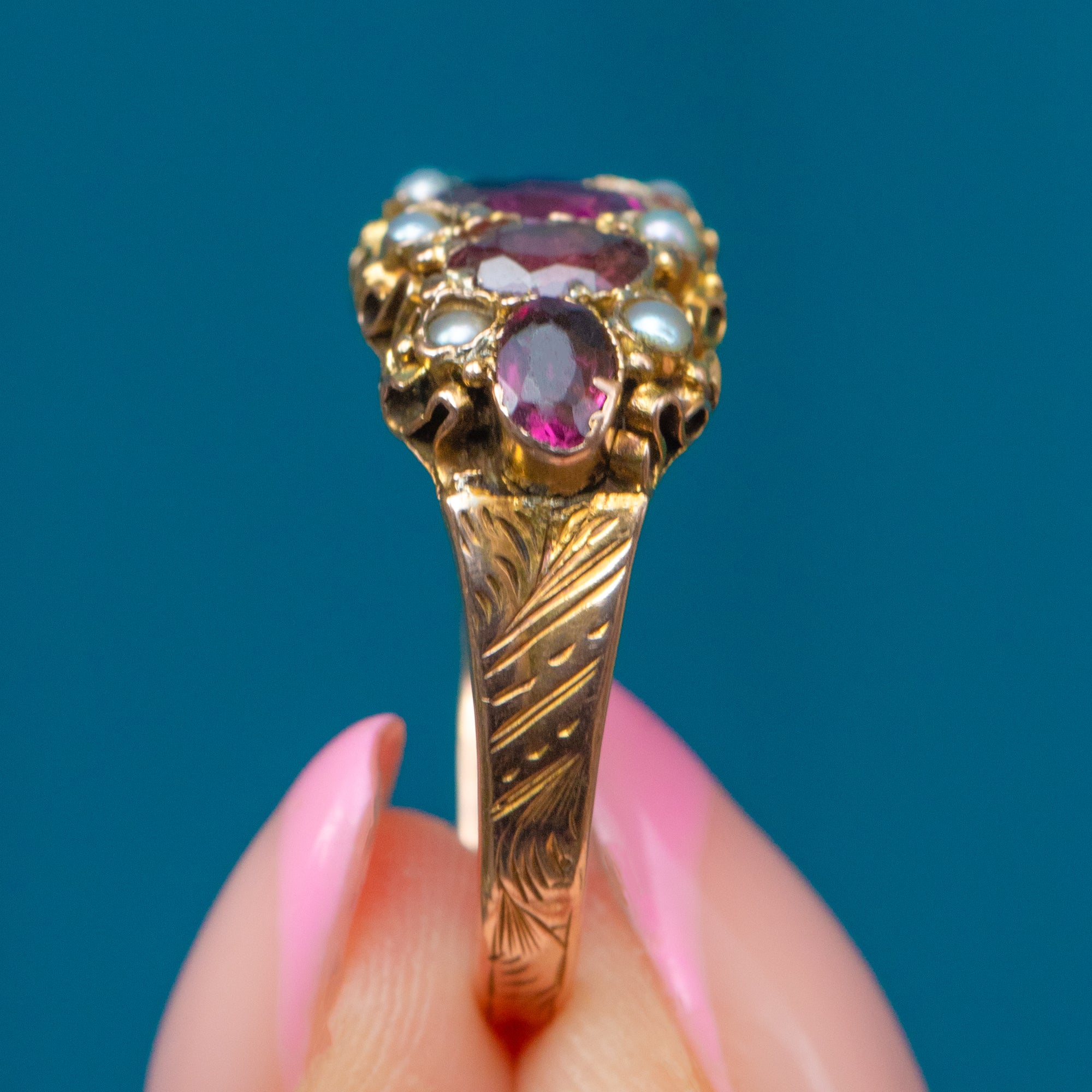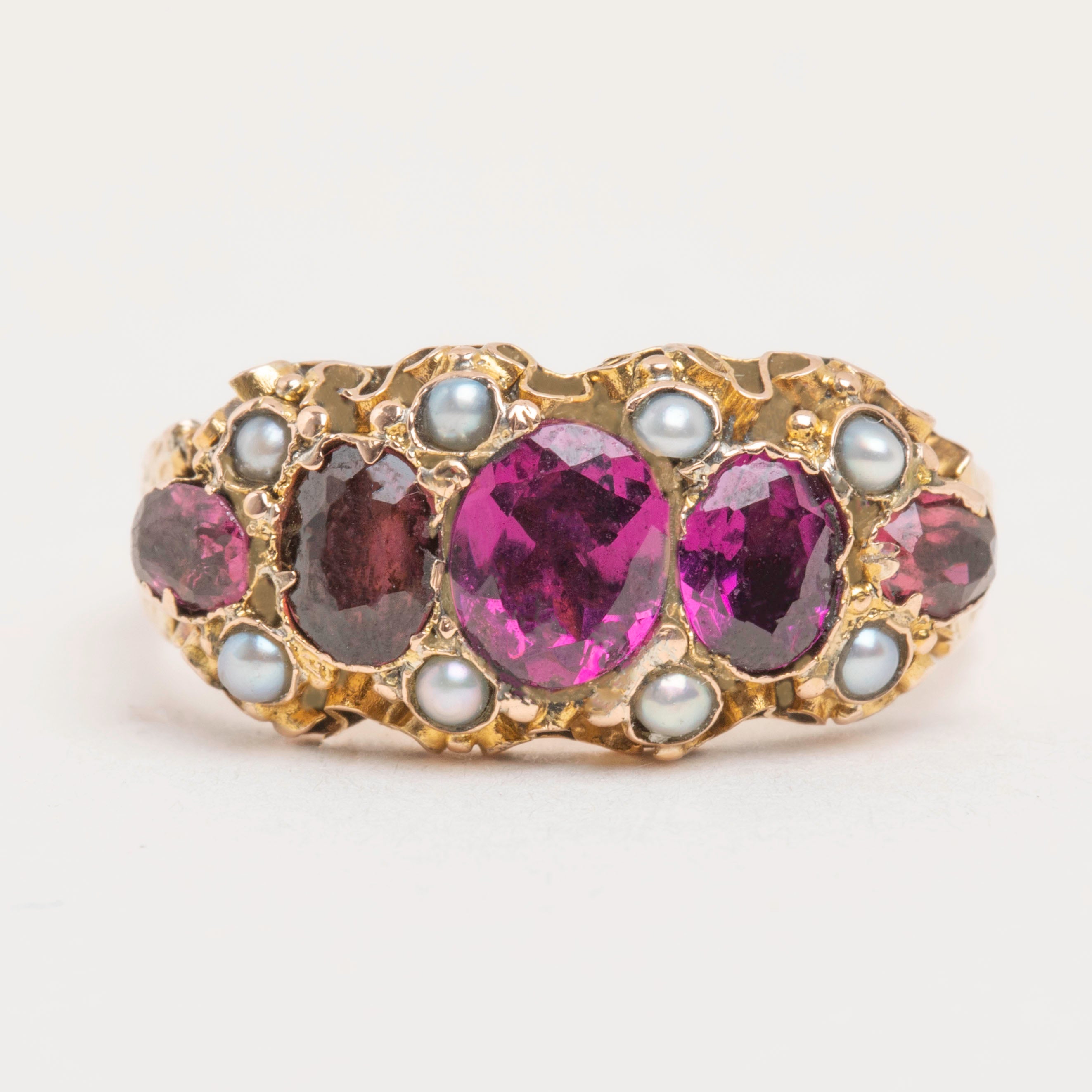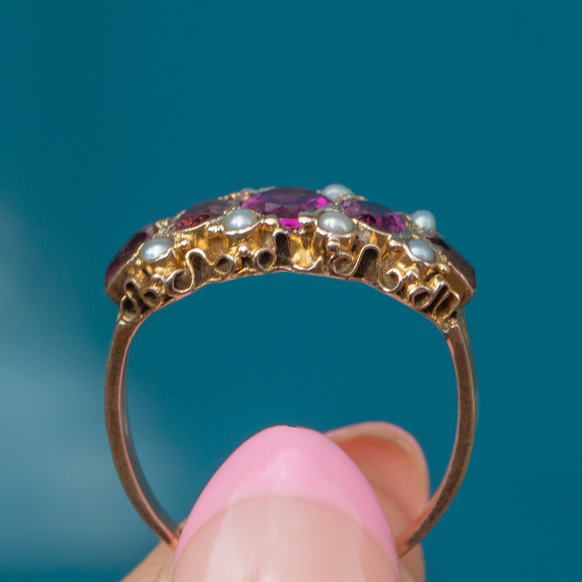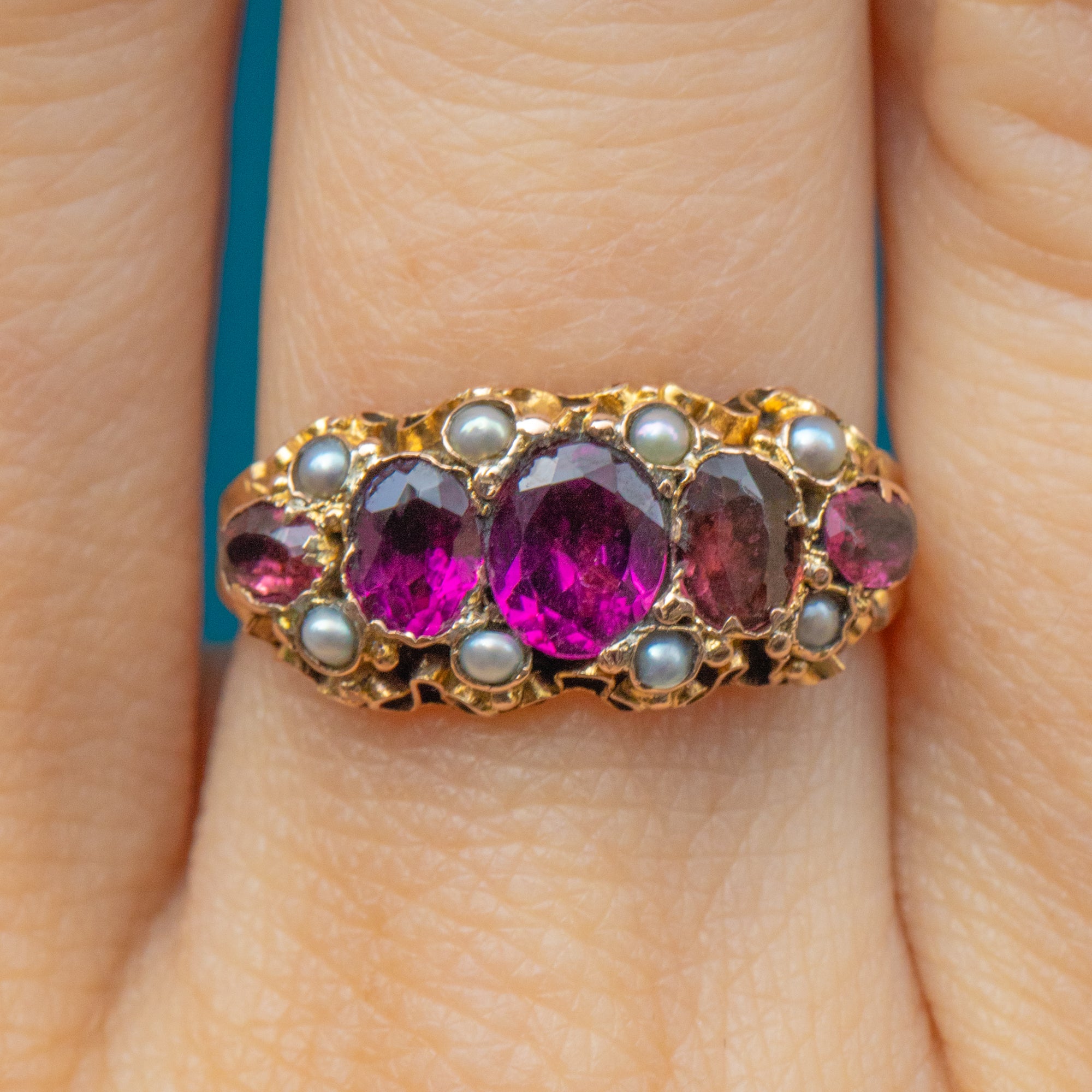 The five Garnets shimmer in pretty purple tones against the Gold, bordered by iridescent natural seed Pearl chasers making this the sweetest ring fit for a Victorian princess!