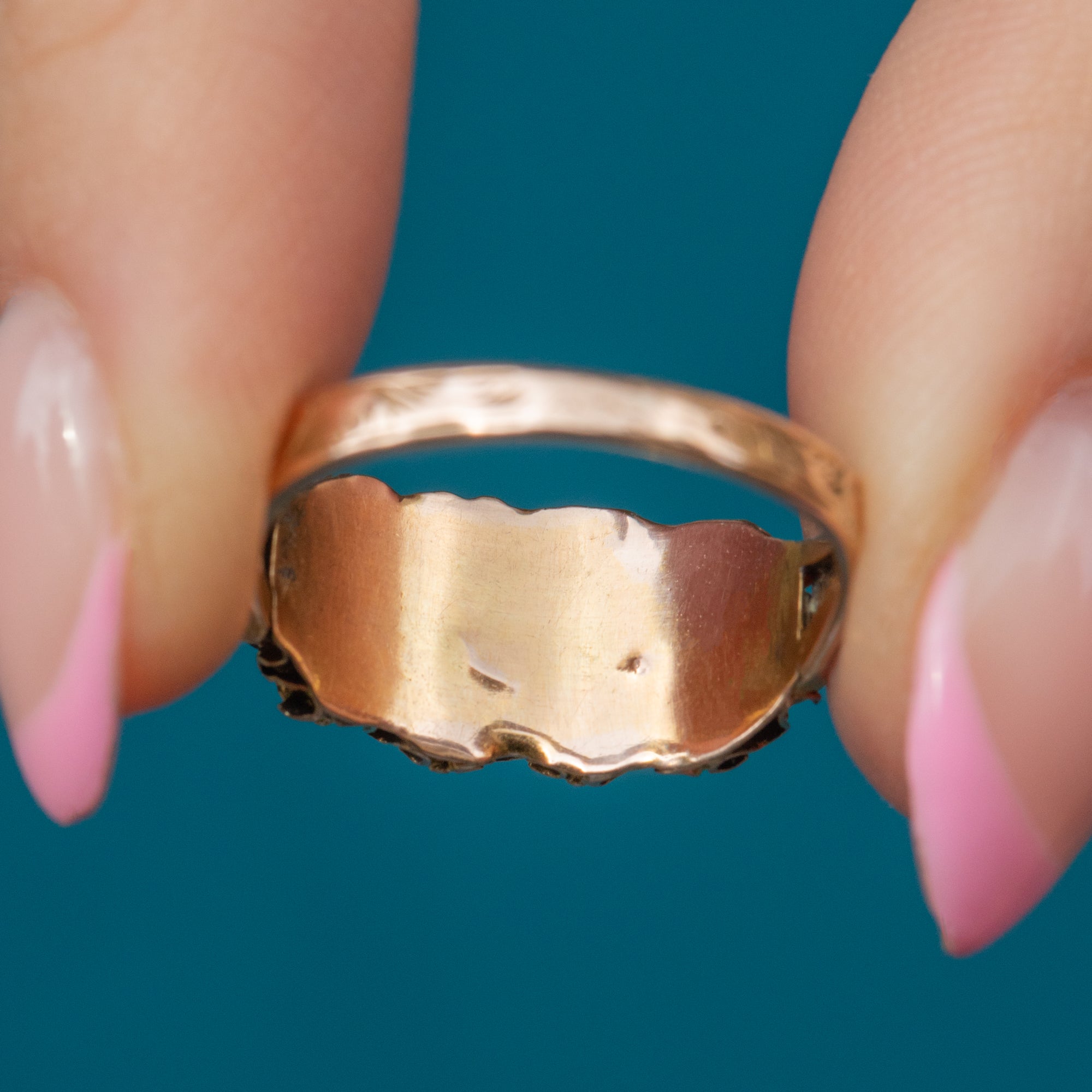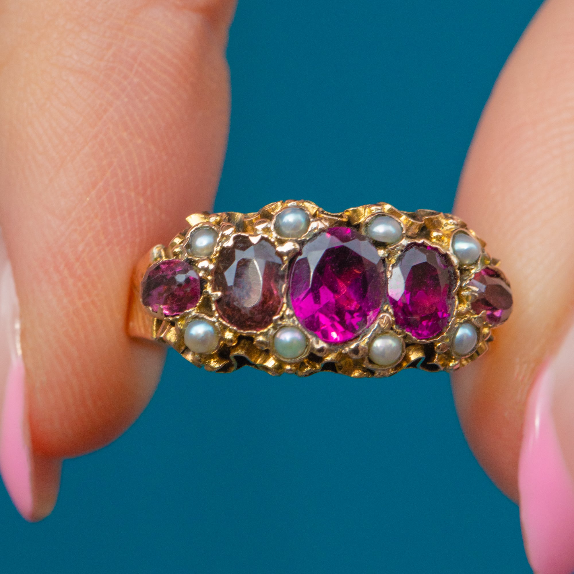 VERY GOOD. This Victorian five stone Garnet and Pearl ring is in a very fine condition indeed. The Garnets are all immaculate with no signs of wear to note and the Pearls still have lustre and are all held securely. The engravings are clear and very pretty. There is wear on the inside of the band in keeping with age, and we believe the ring has had a previous re-sizing at some point during its history as the assay office hallmark is no longer visible, however, the re-size is not visible apart from this clue. This solid 9ct Gold Victorian Garnet ring is an utter delight to behold and we cannot wait for you to fall in love just like we have!