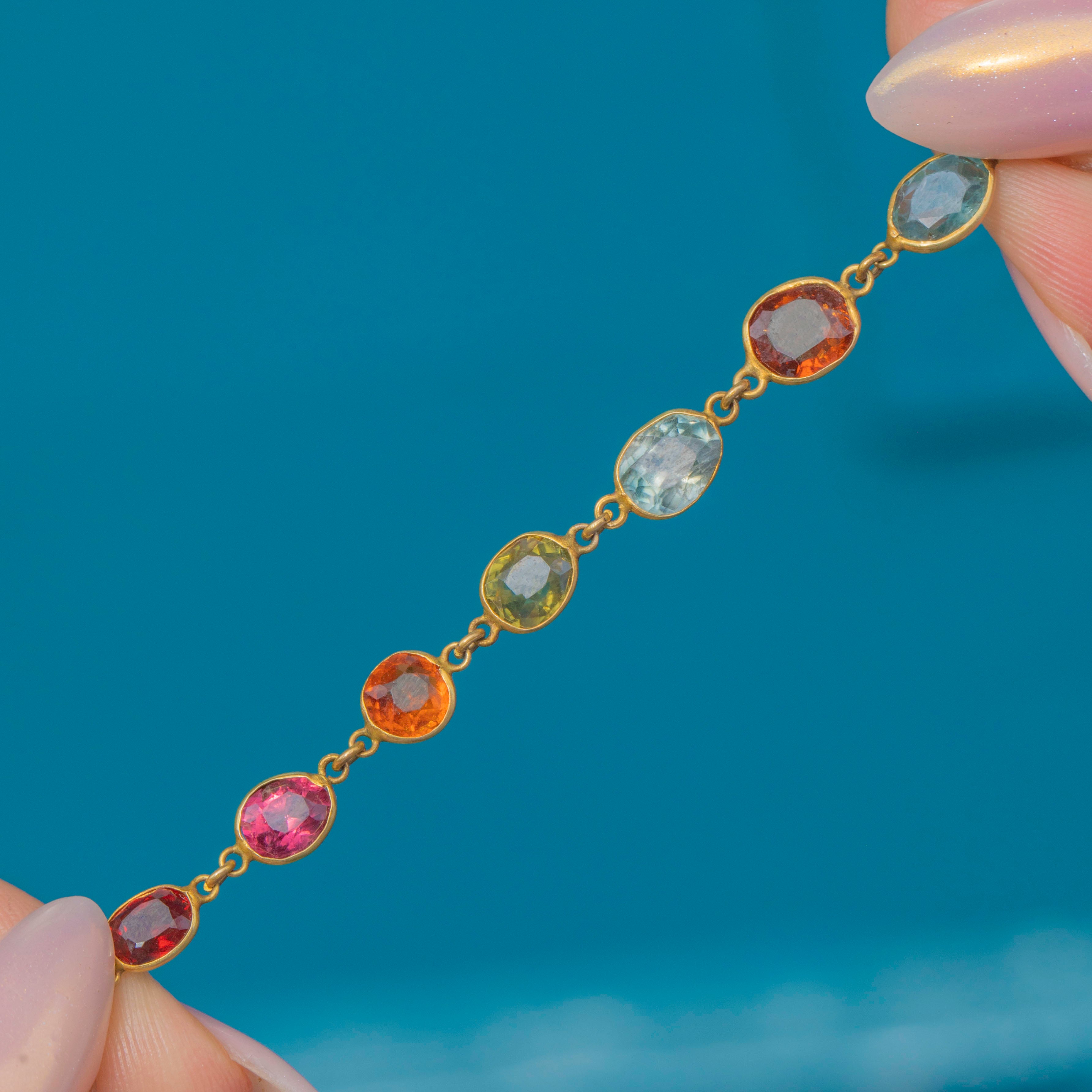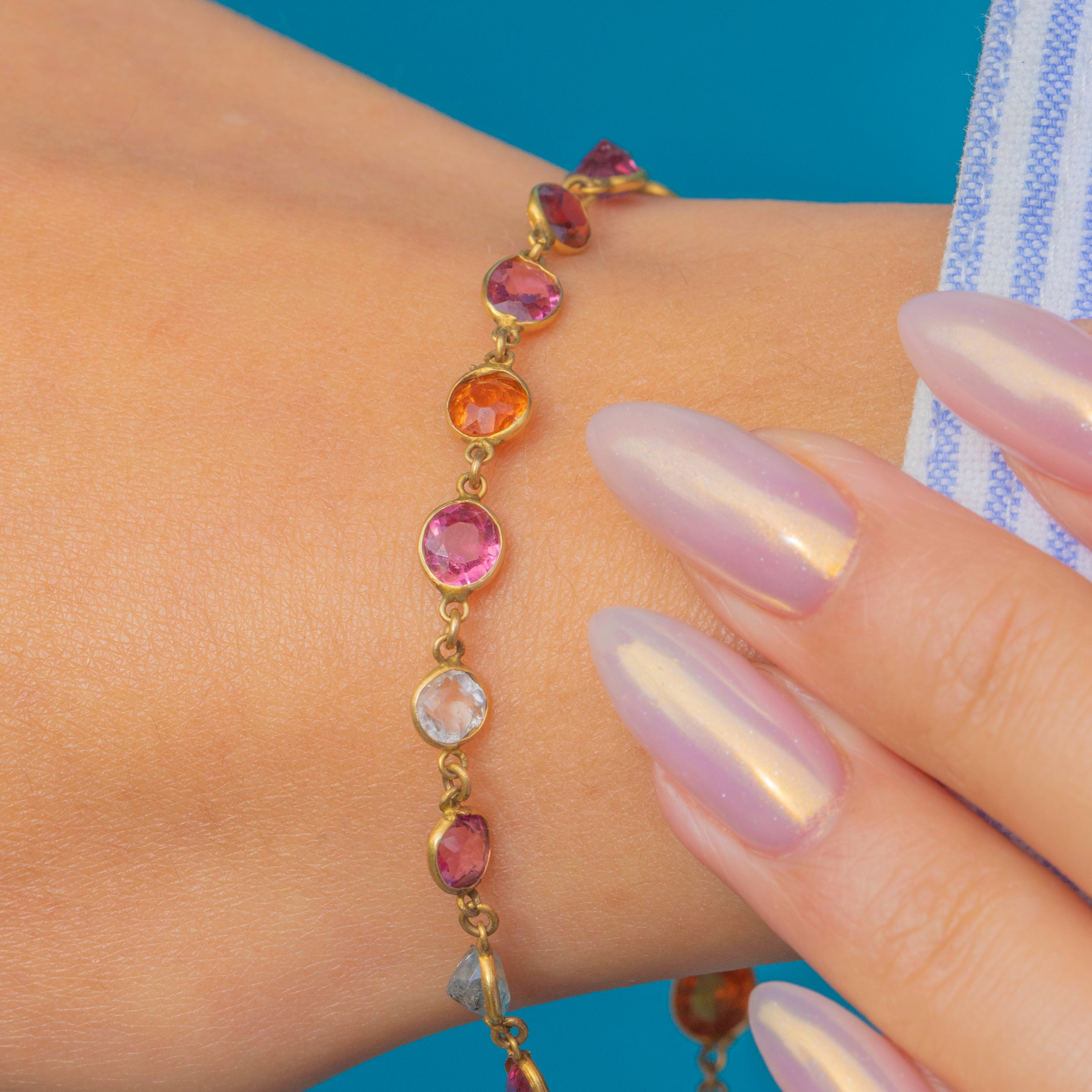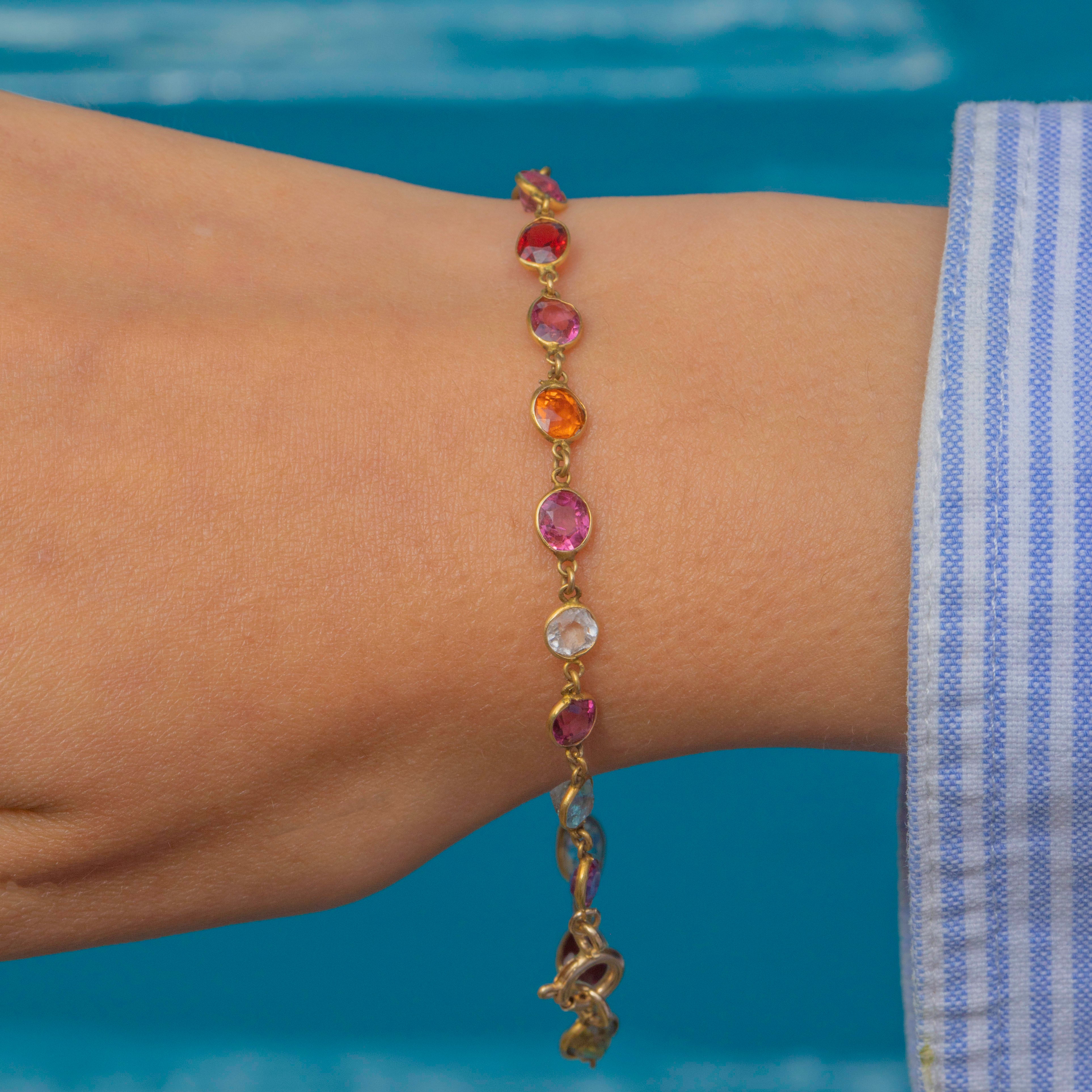 This delightful Victorian harlequin bracelet is crafted in 9ct Gold and set with a lively array of colourful gemstones. The design displays soft cornflower Blue Sapphires and Blue Topaz, complemented by Pink Garnets, Spinel, Citrine, Rock Crystal, and Orange Paste, creating a playful rainbow of colour across the wrist.