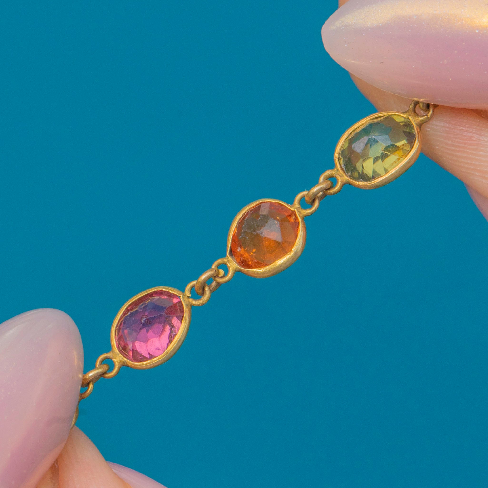 Each gemstone is set within 9ct Gold, the warmth marrying the various tones of bracelet. Measuring 7.5" long, this antique piece is ideal for adding a pop of colour to your attire.