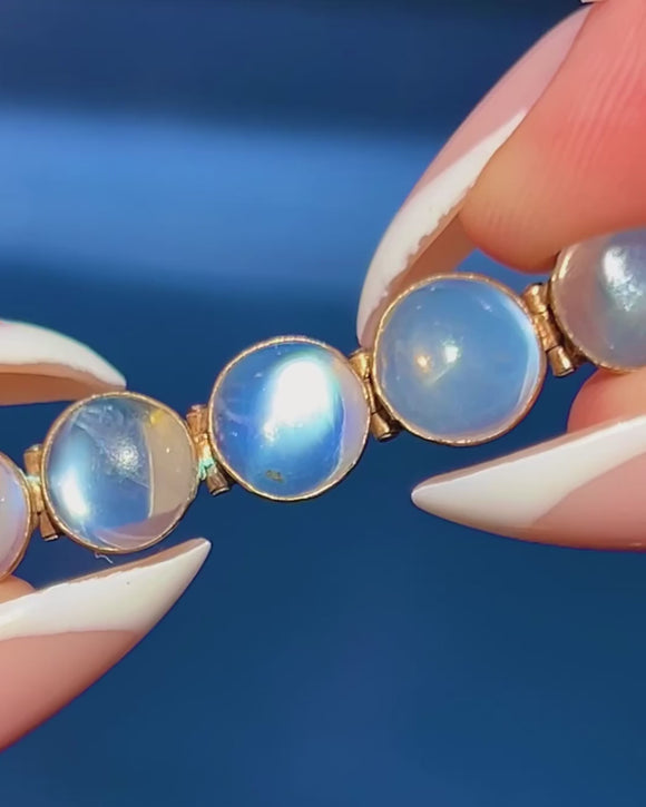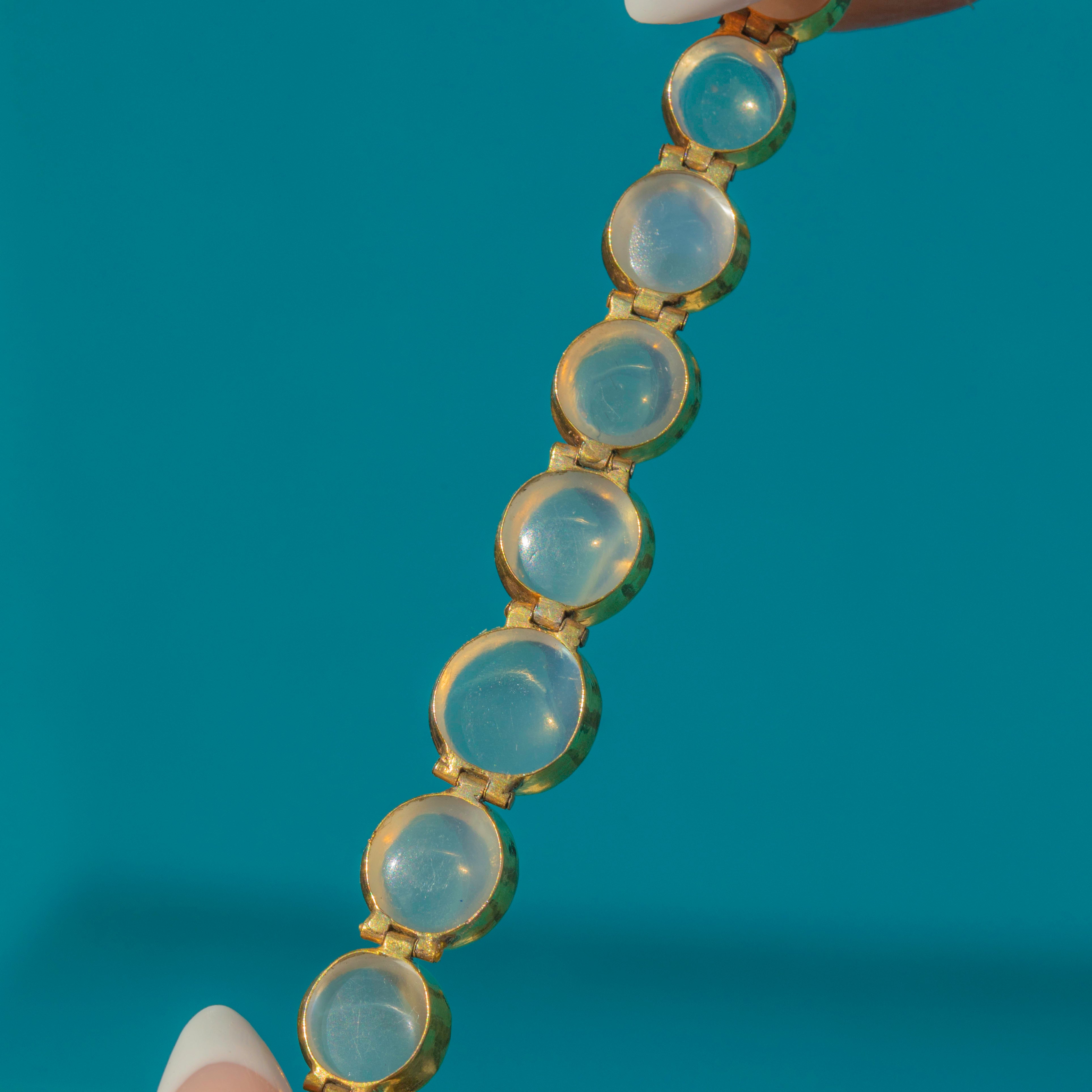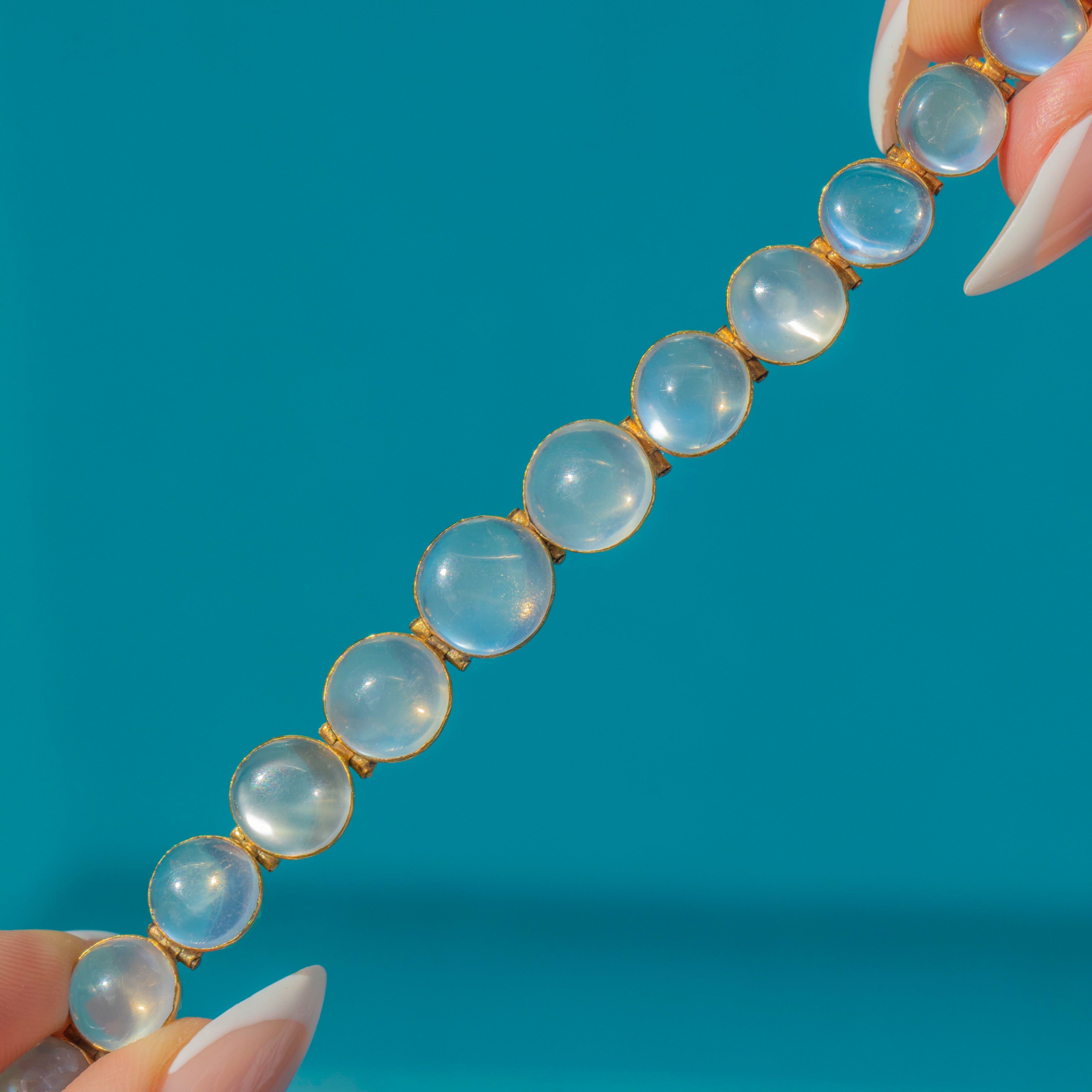 A luminous Victorian Moonstone bracelet in warm 9ct Gold. Round cabochon Moonstones are collet-set in a continuous line, each stone glowing with that ethereal blue sheen the era adored. Elegant on its own and effortless to stack—classic Victorian romance with everyday wearability.