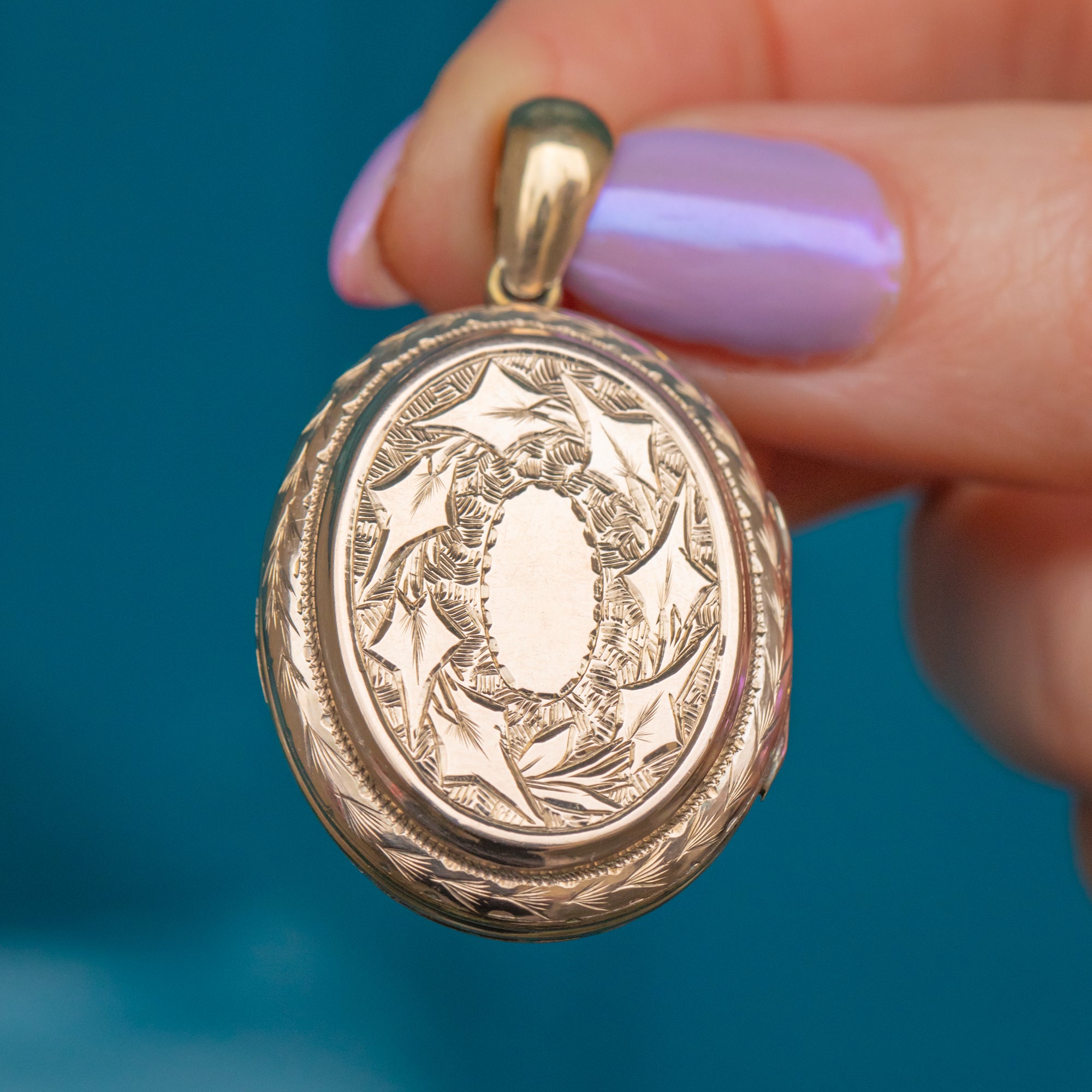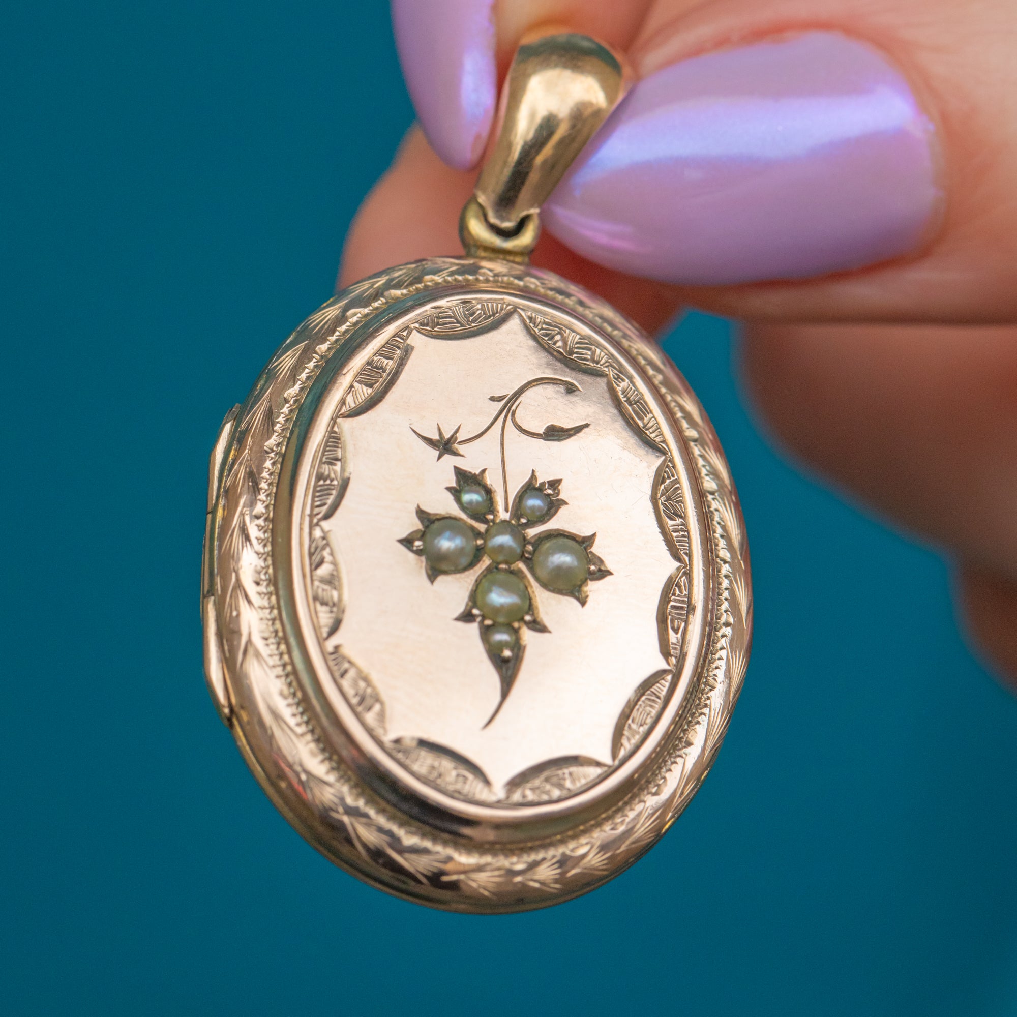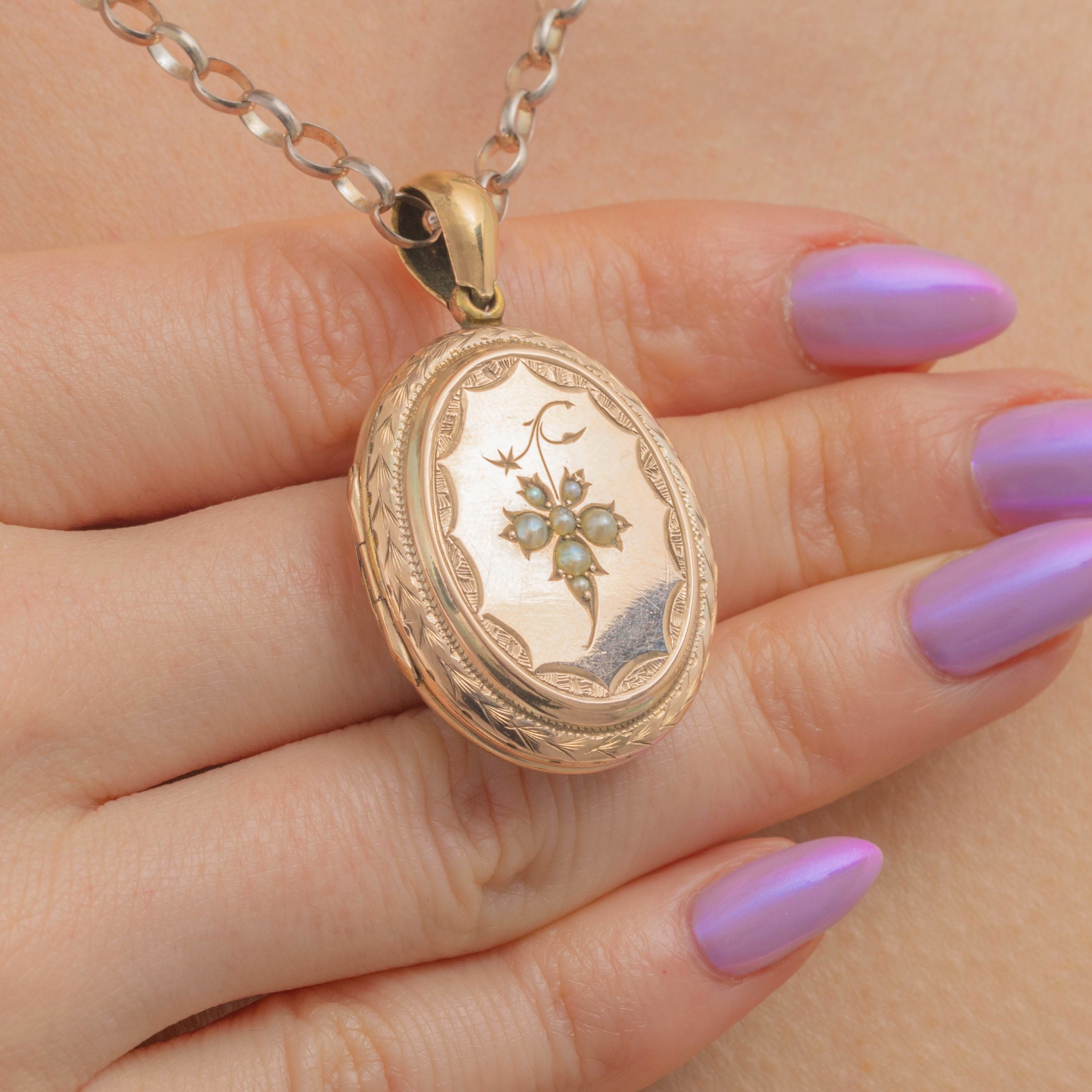 This outstanding Victorian 9ct Gold Pearl engraved oval locket exudes antique charm! Brimming with intricate details engraved into luscious 9ct Gold, you can admire the skilled craftsmanship from every angle.