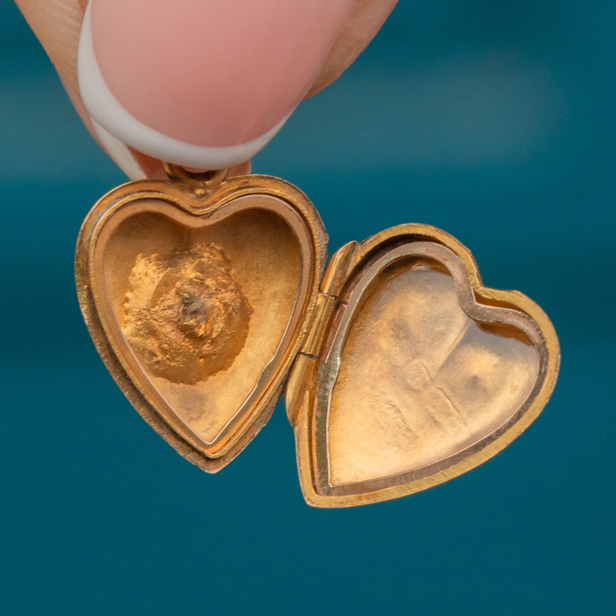 VERY GOOD. We are pleased to present this Victorian 9ct Gold Pearl star set heart locket in very good condition! The Pearl is secure within the setting with a lovely nacre throughout. The Gold has a rich saturation throughout and although there is a couple of dings to the top of the front and the back of the locket, her hallmarks are fully intact allowing us to date her to 1887. With doors that shut with a secure click, wear this Victorian heart locket with confidence!