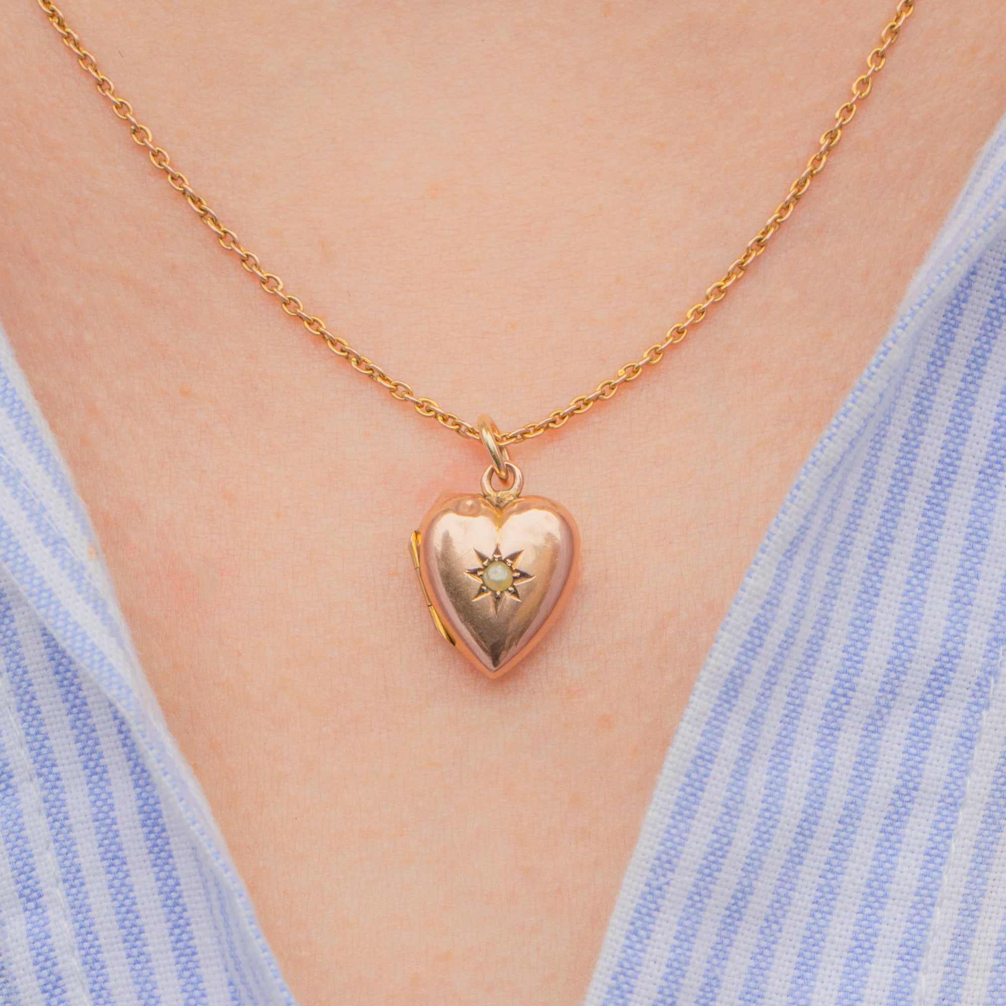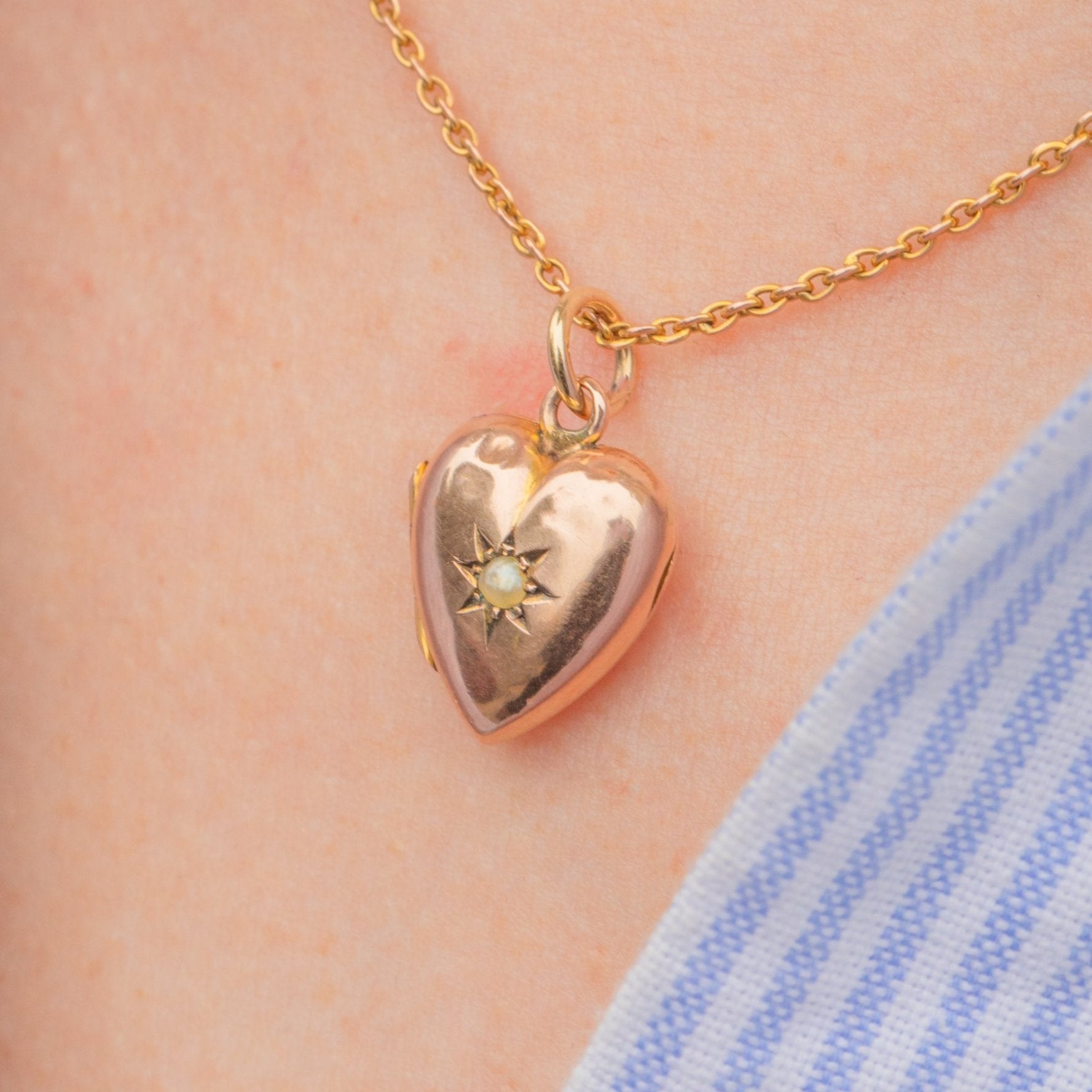 This Victorian 9ct Gold Pearl star set heart locket is just the sweetest! With a perfectly plump heart form, her centre is inlaid with a single shimmering Pearl secured by a star settings; she can't get more Victorian than that!