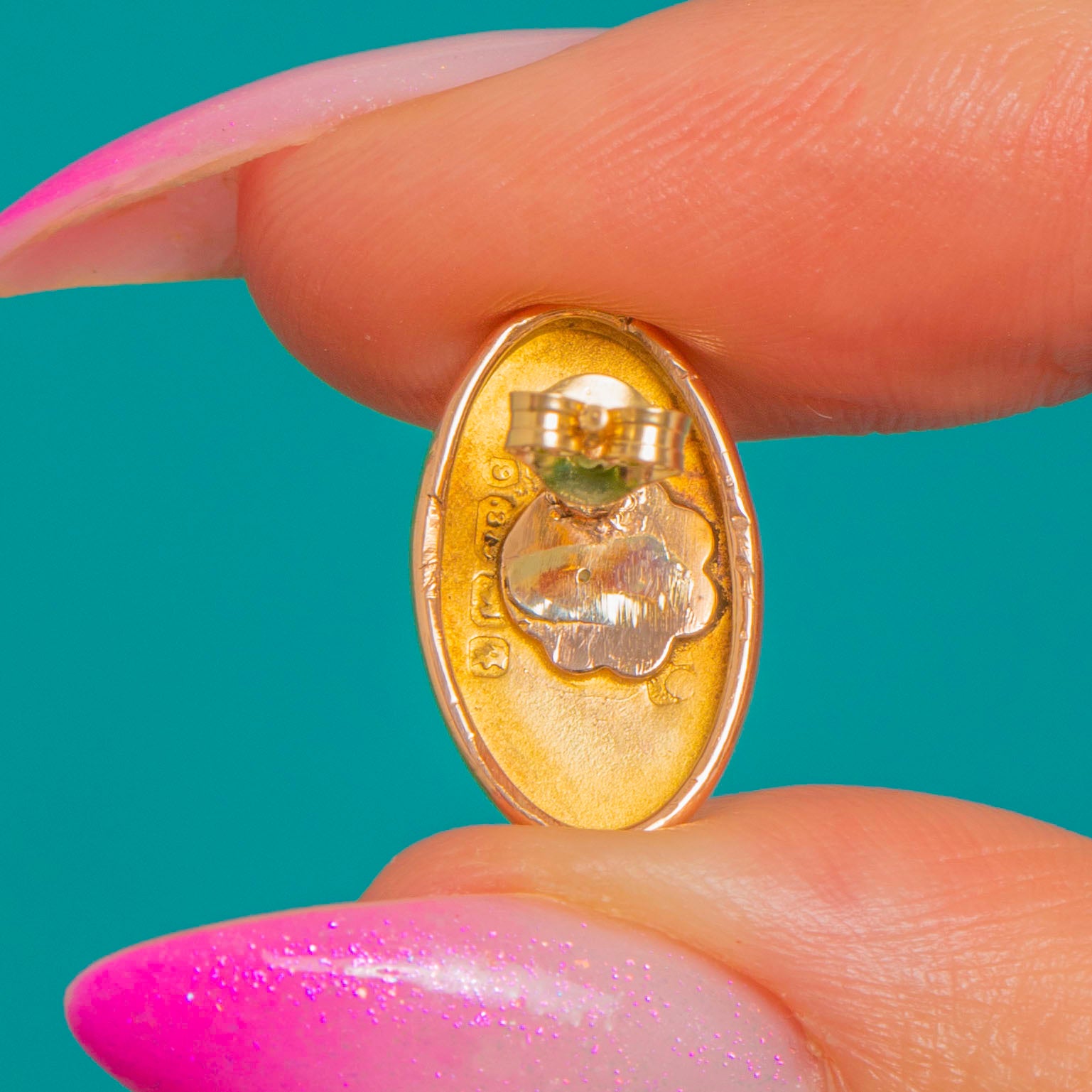 These charming Victorian 9ct Gold stud earrings capture the era’s love of celestial symbolism. Each low-profile oval plaque is crisply engraved with an eight-point star and set at the heart with a petite Pearl, creating a delicate glow against the warm Gold.