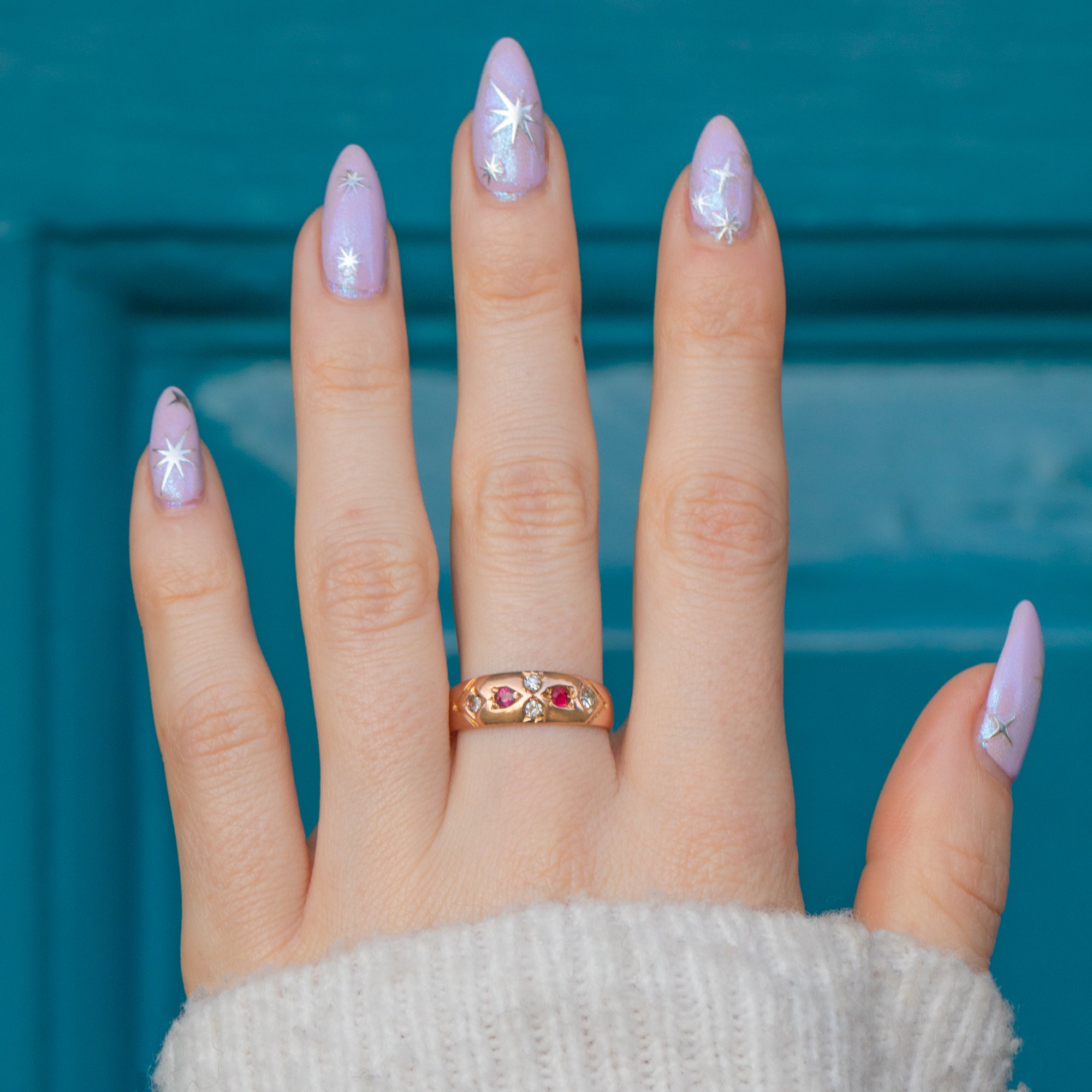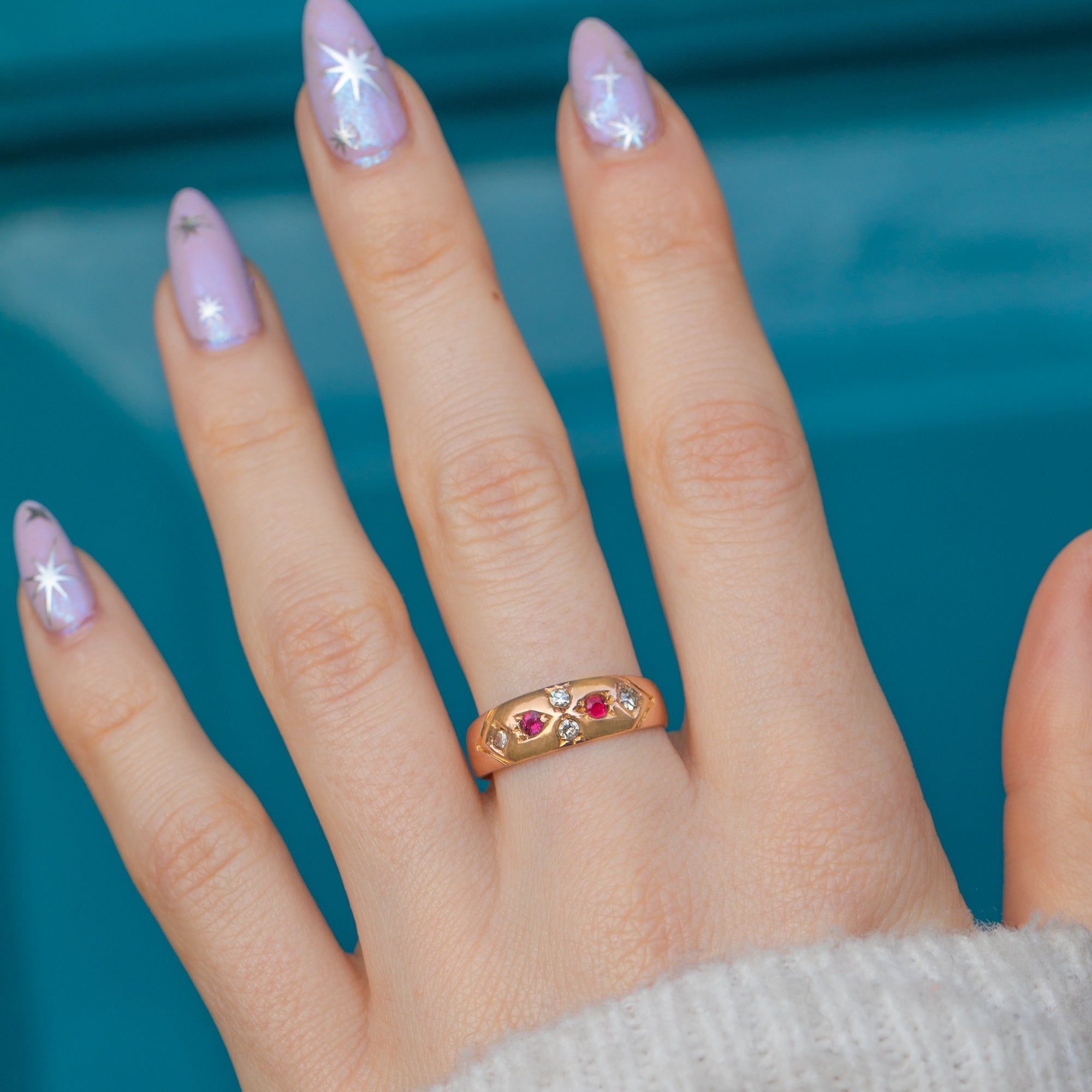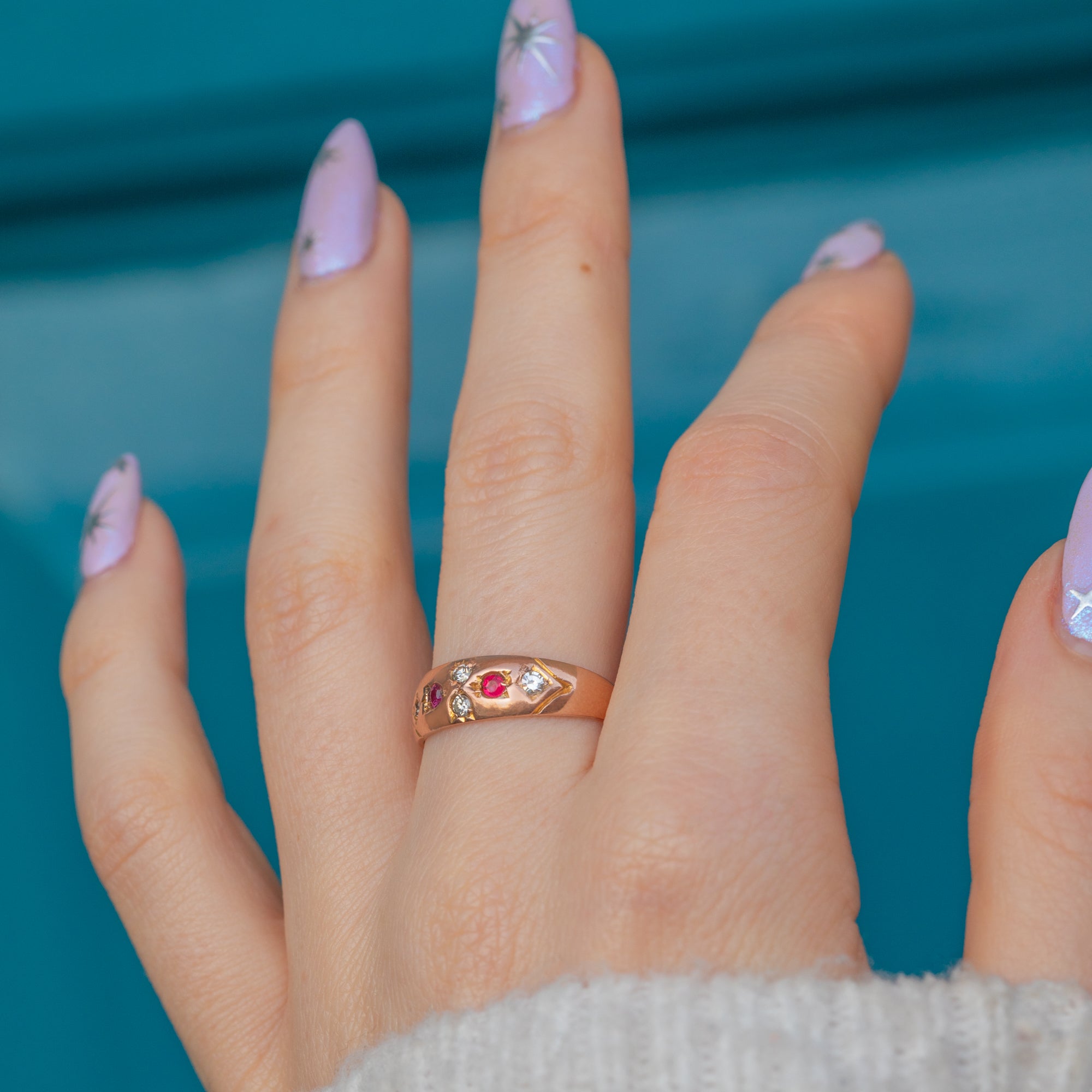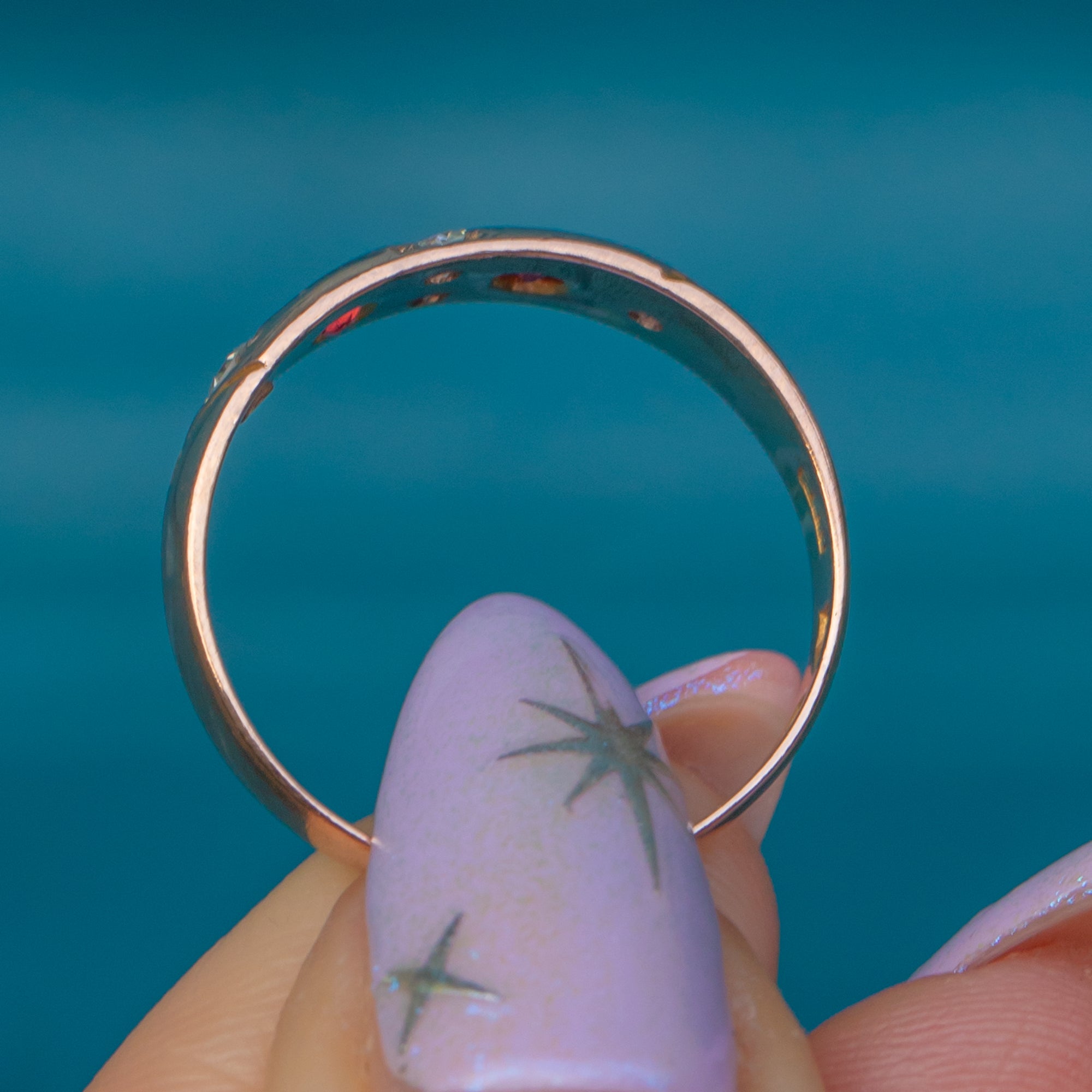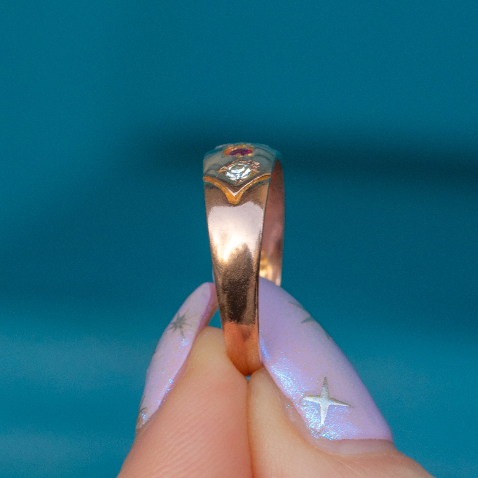 "Gypsy" rings were a favourite during the late Victorian era, beloved for their timeless elegance which remains today. Her 9ct Gold band is buttery and bright with elegant engraved shoulders framing her gemstones!