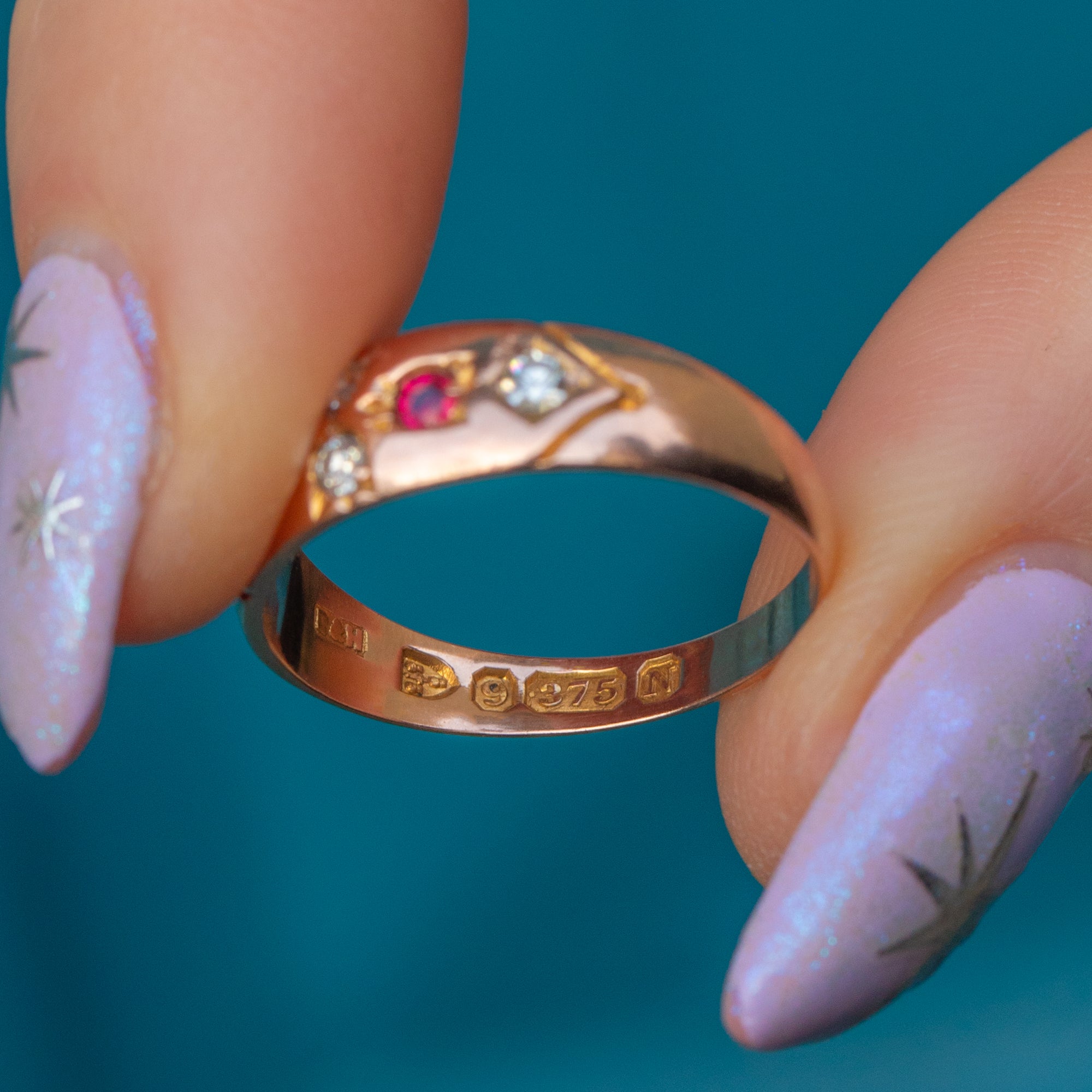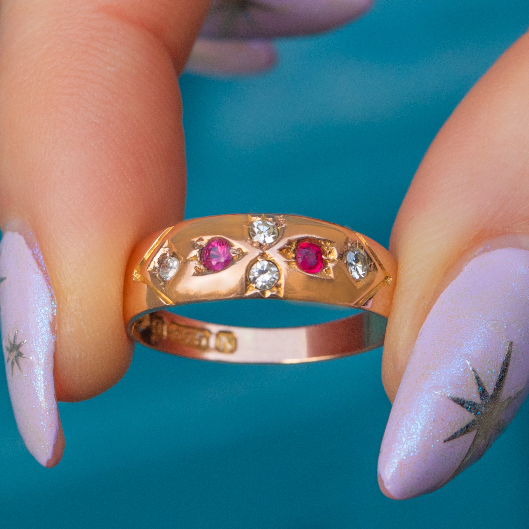 We are delighted to bring you this beautiful 9ct Gold Ruby Diamond gypsy ring! Bursting with Victorian charm, this ring featured four dainty Diamonds, accented by two magenta-hued Rubies and a full set of hallmarks dating to 1896, including the rare Chester Assay.