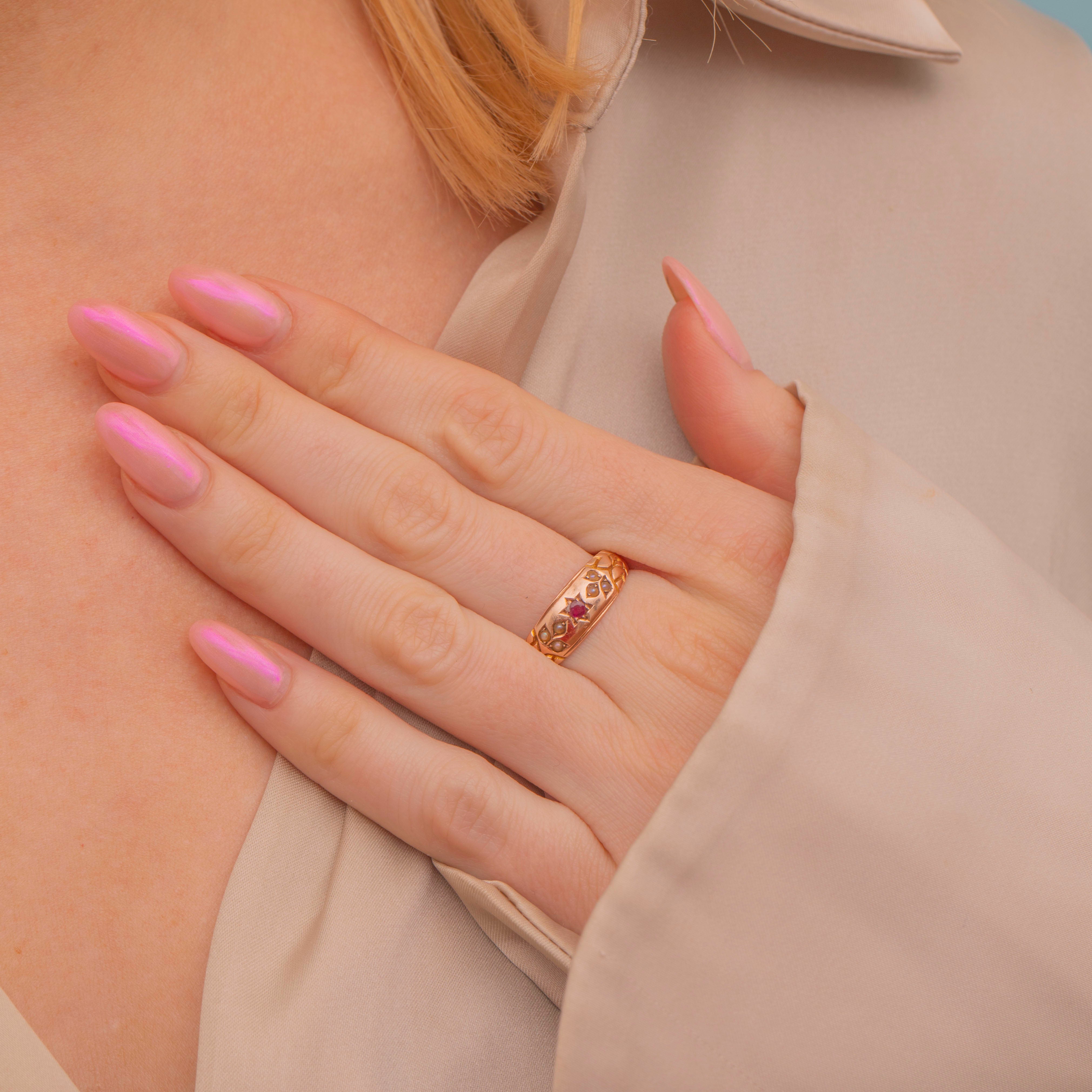 Her saturated 9ct Gold band is intricately detailed, with the most gorgeous floral engraved motifs for an added romantic touch. A real treasure, she is the perfect ring for stacking or as a statement staple piece!