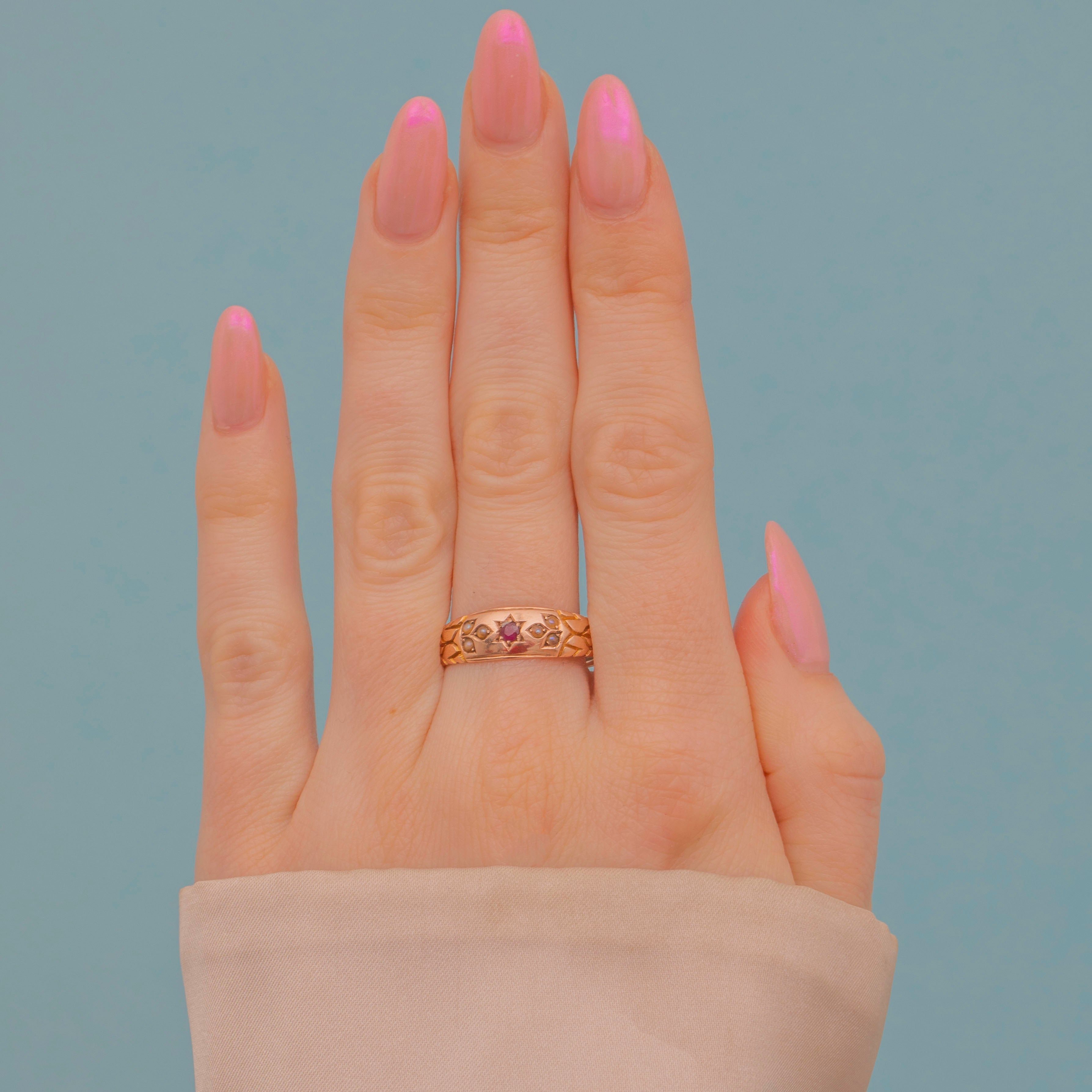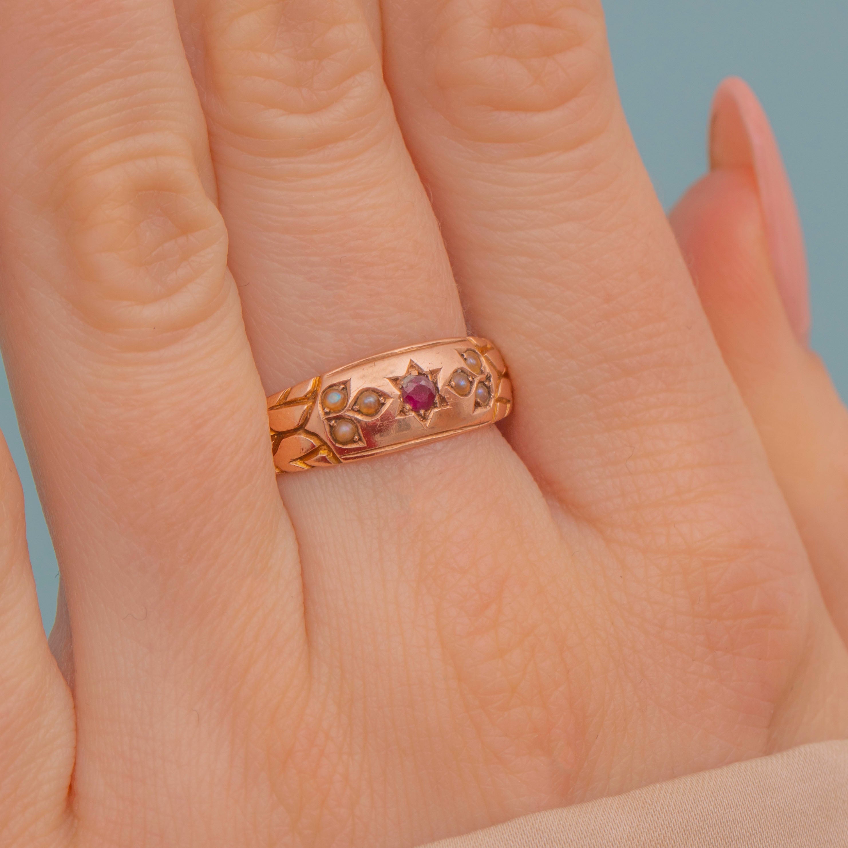 Victorian 9ct Gold Ruby Pearl Gypsy Ring, Floral Motifs