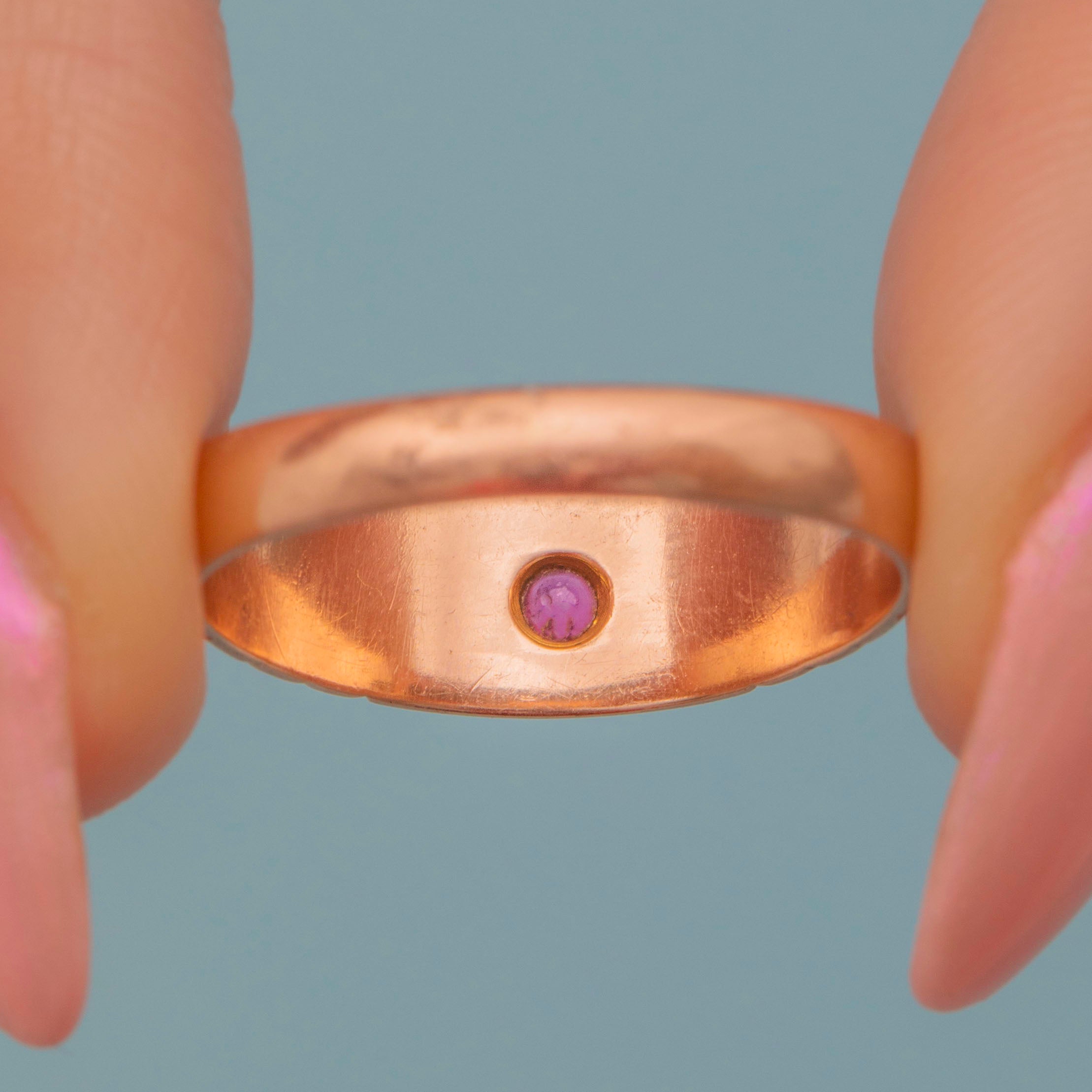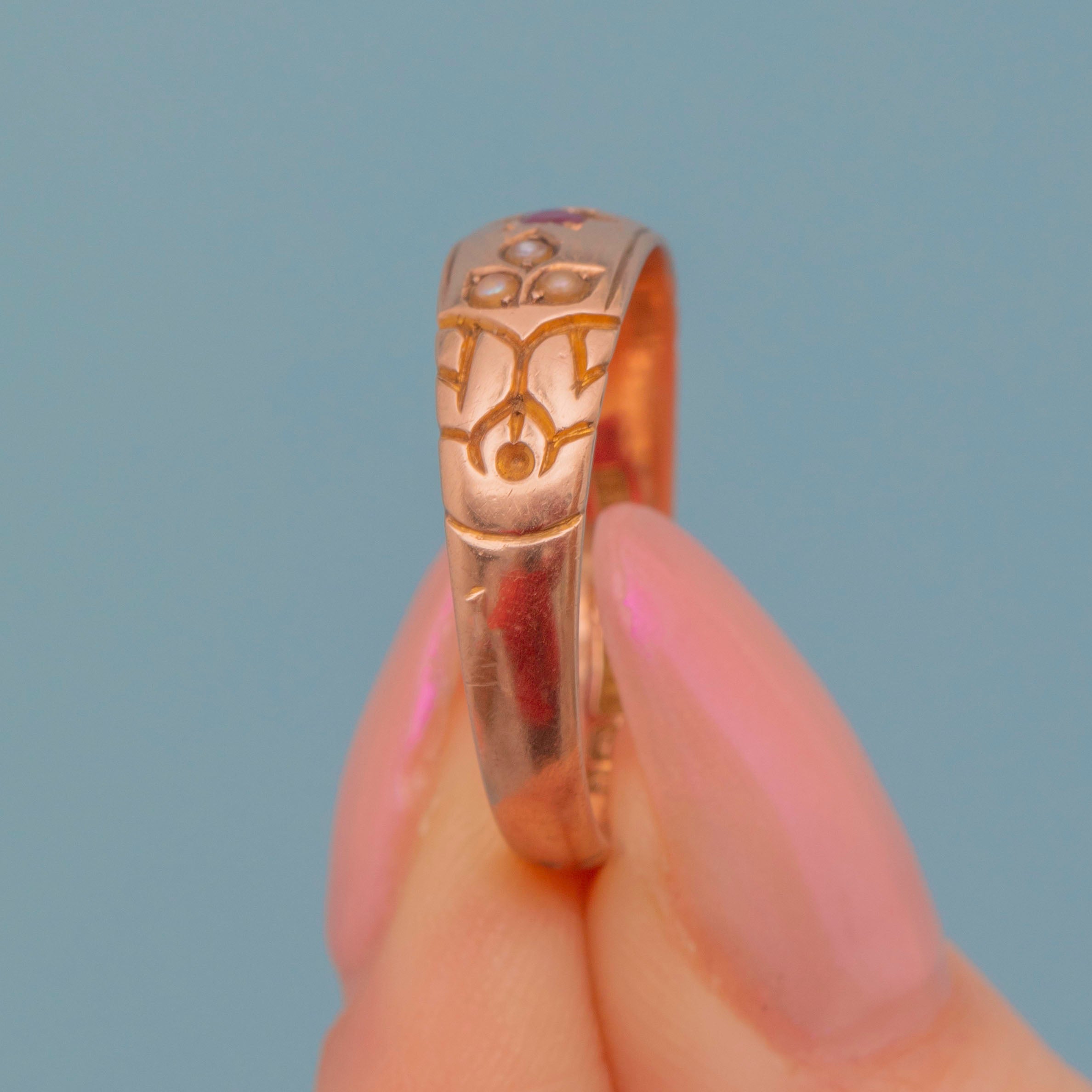 EXCELLENT: This Victorian 9ct Gold Ruby Pearl gypsy ring in in superb antique condition. She is Victorian, flaunting chunky & clear hallmarks. All gemstones sits secure, and her buttery band glides onto the hand like a dream! Dating back to 1900, her beauty has been well preserved!