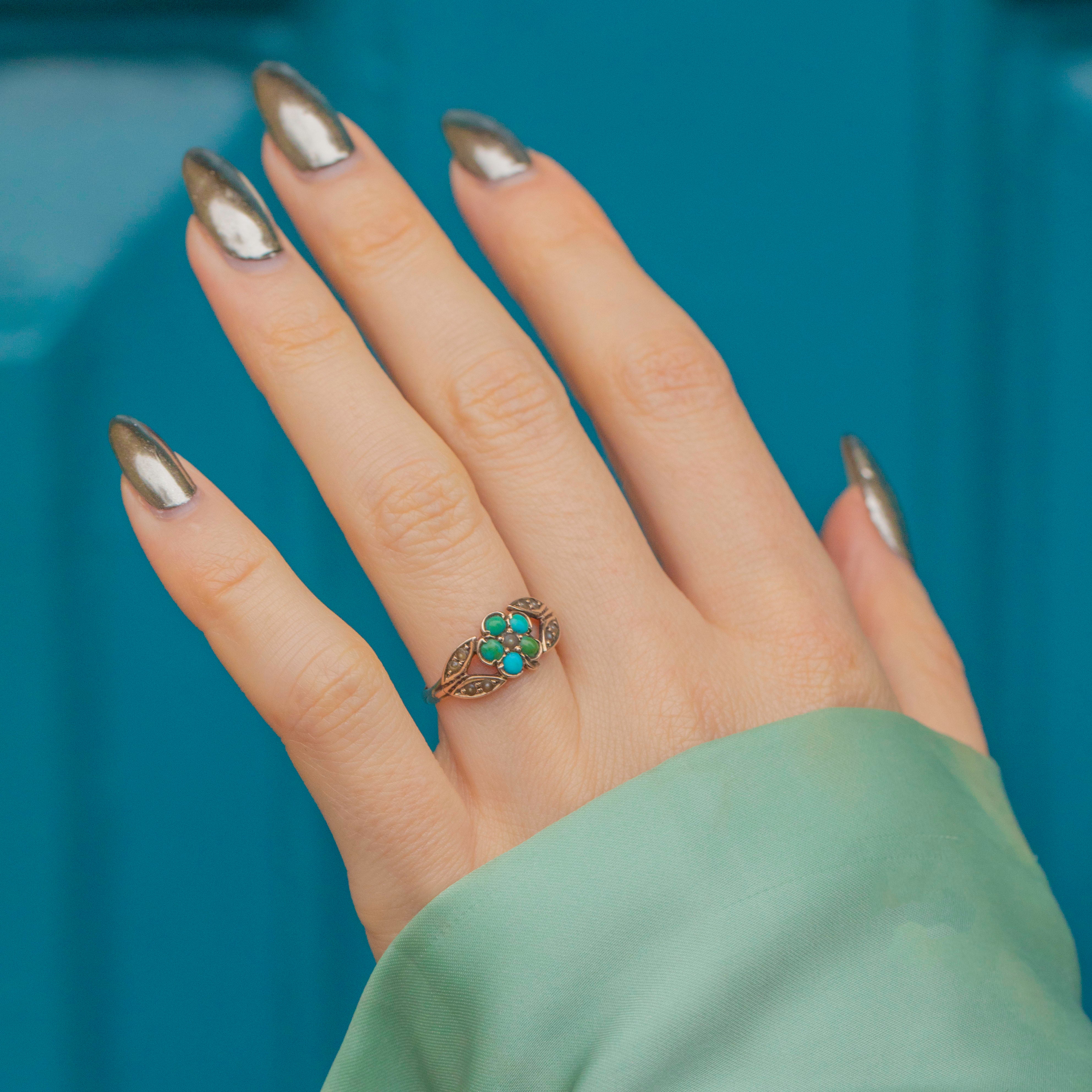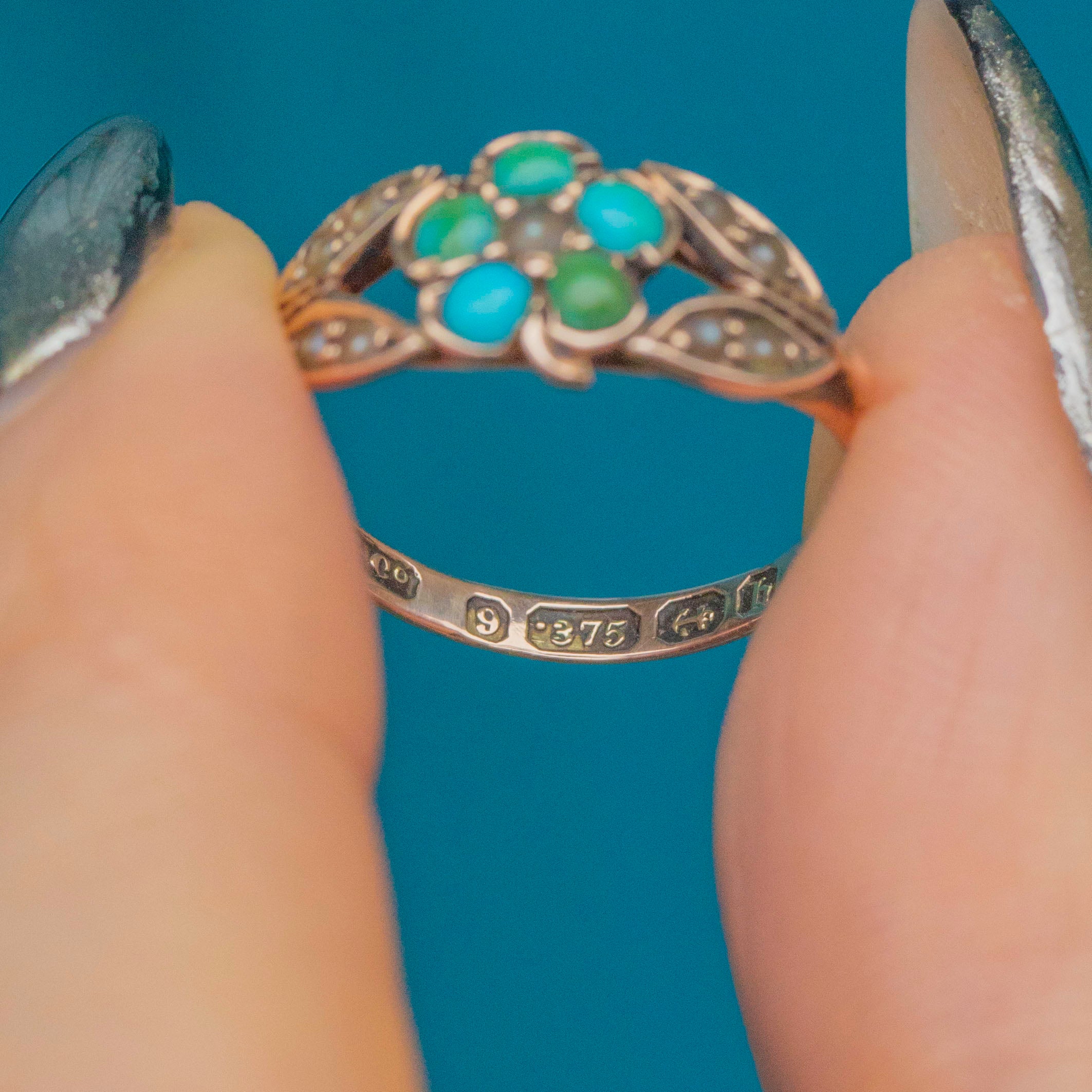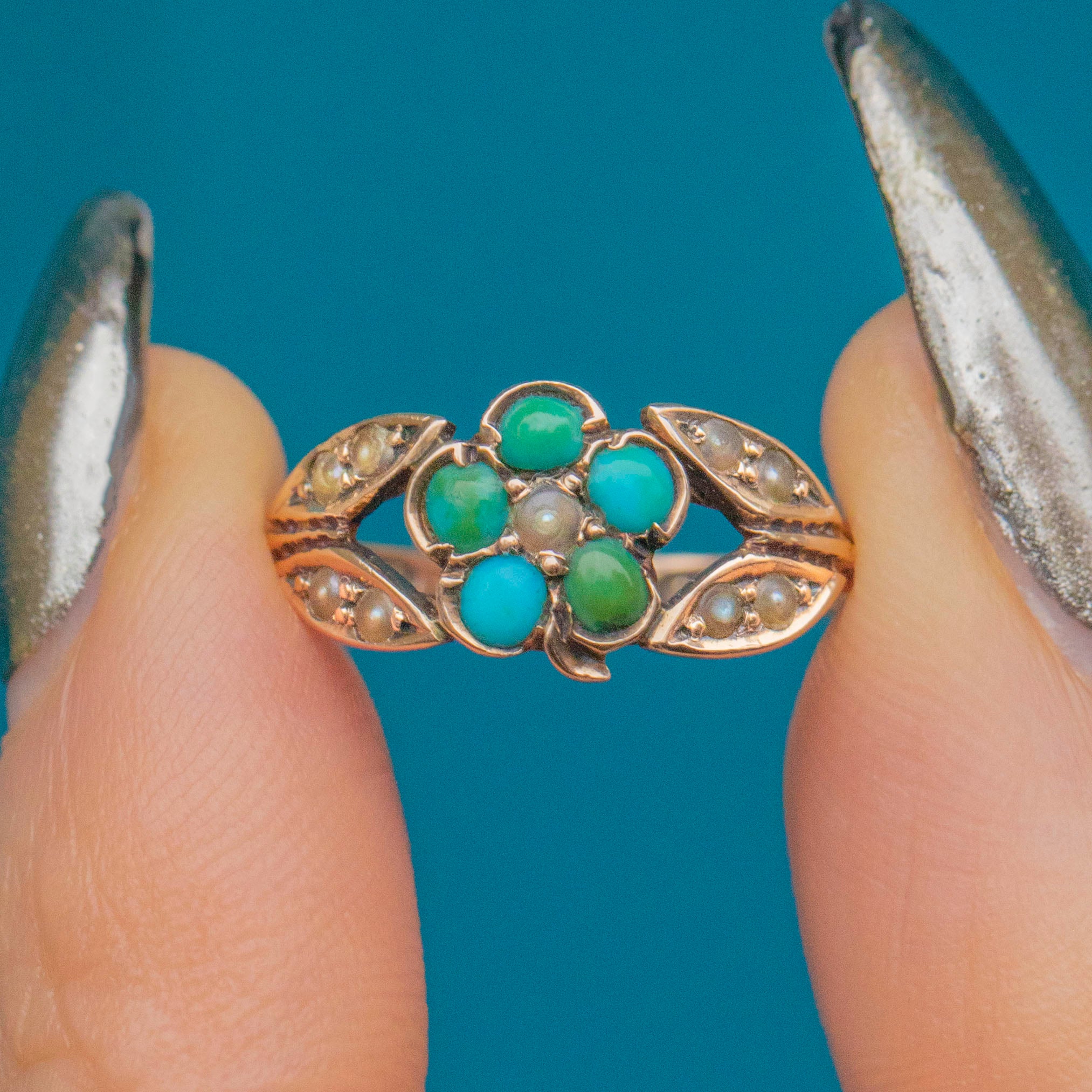 This adorable Victorian 9ct Gold Turquoise and Pearl forget-me-not ring is perfect for adding a pop of colour to your everyday attire!