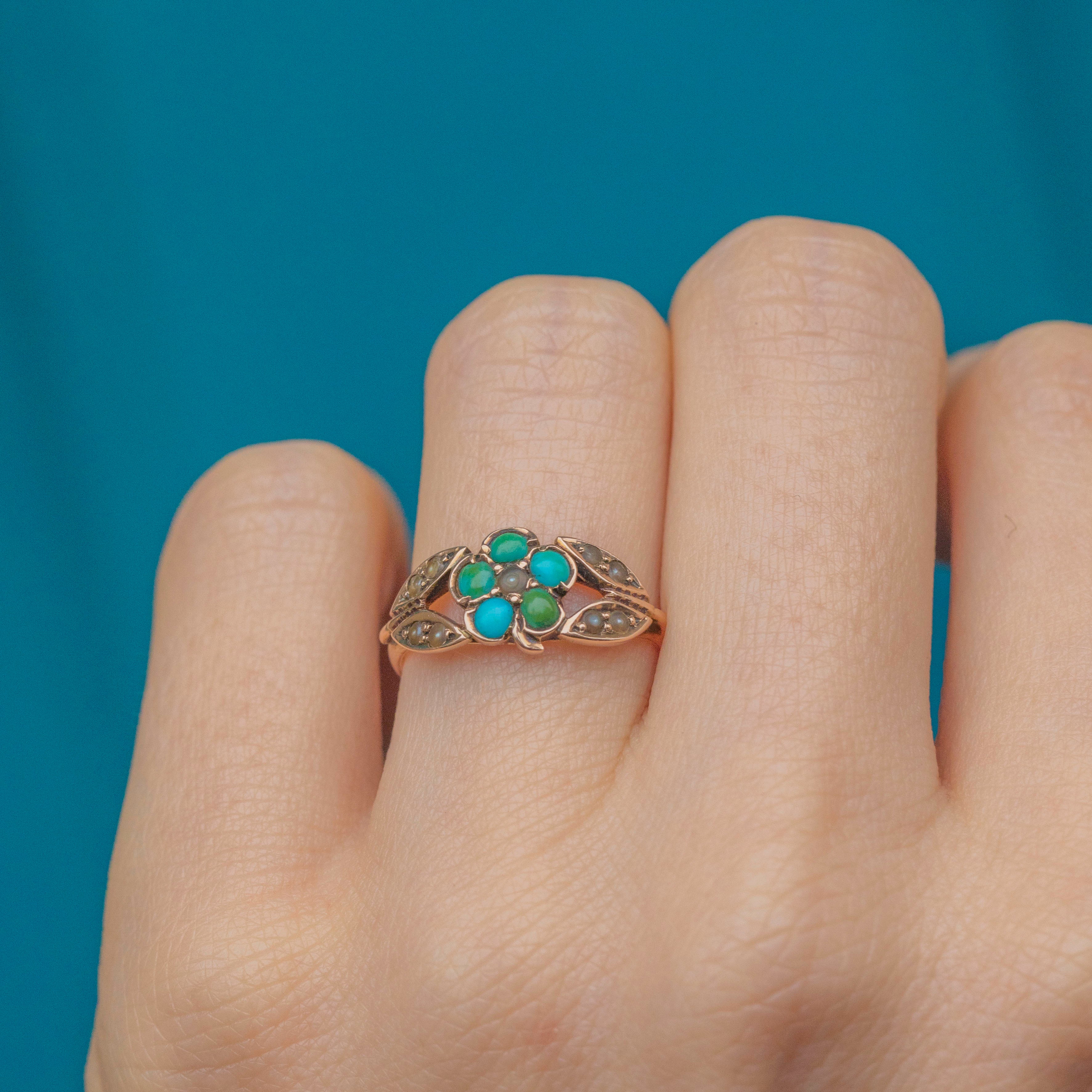 Victorian 9ct Turquoise Pearl Forget-Me-Not Ring, c.1876