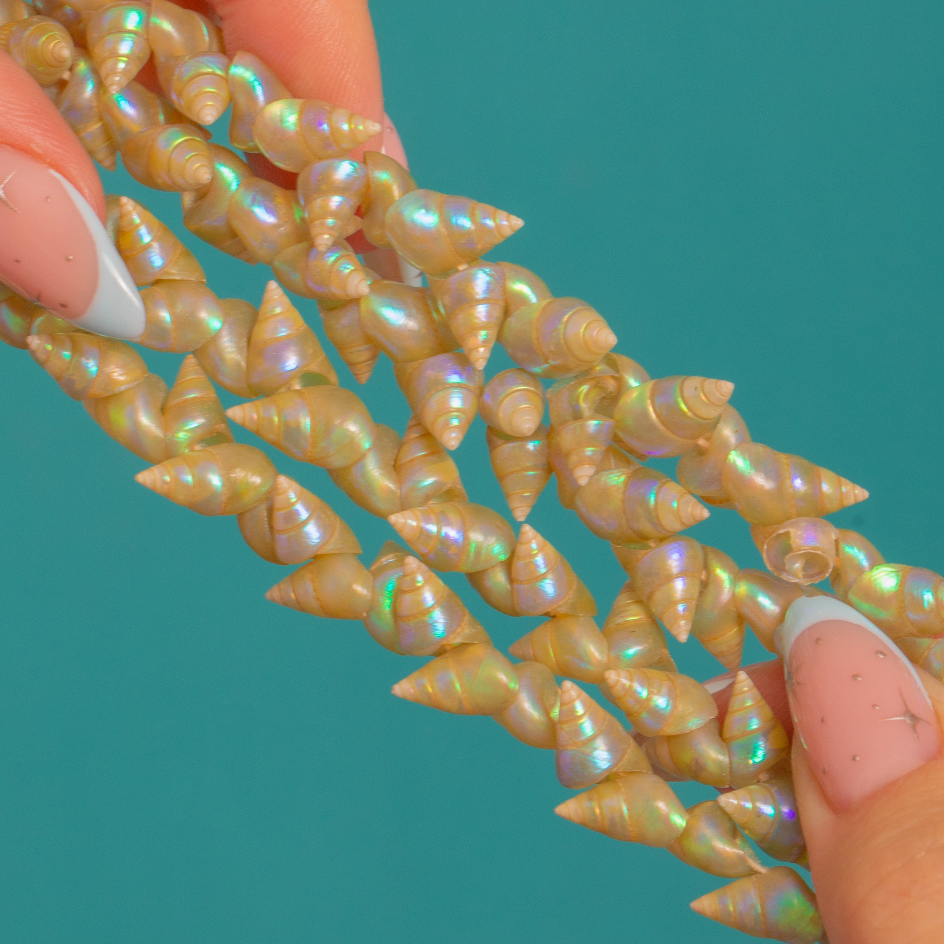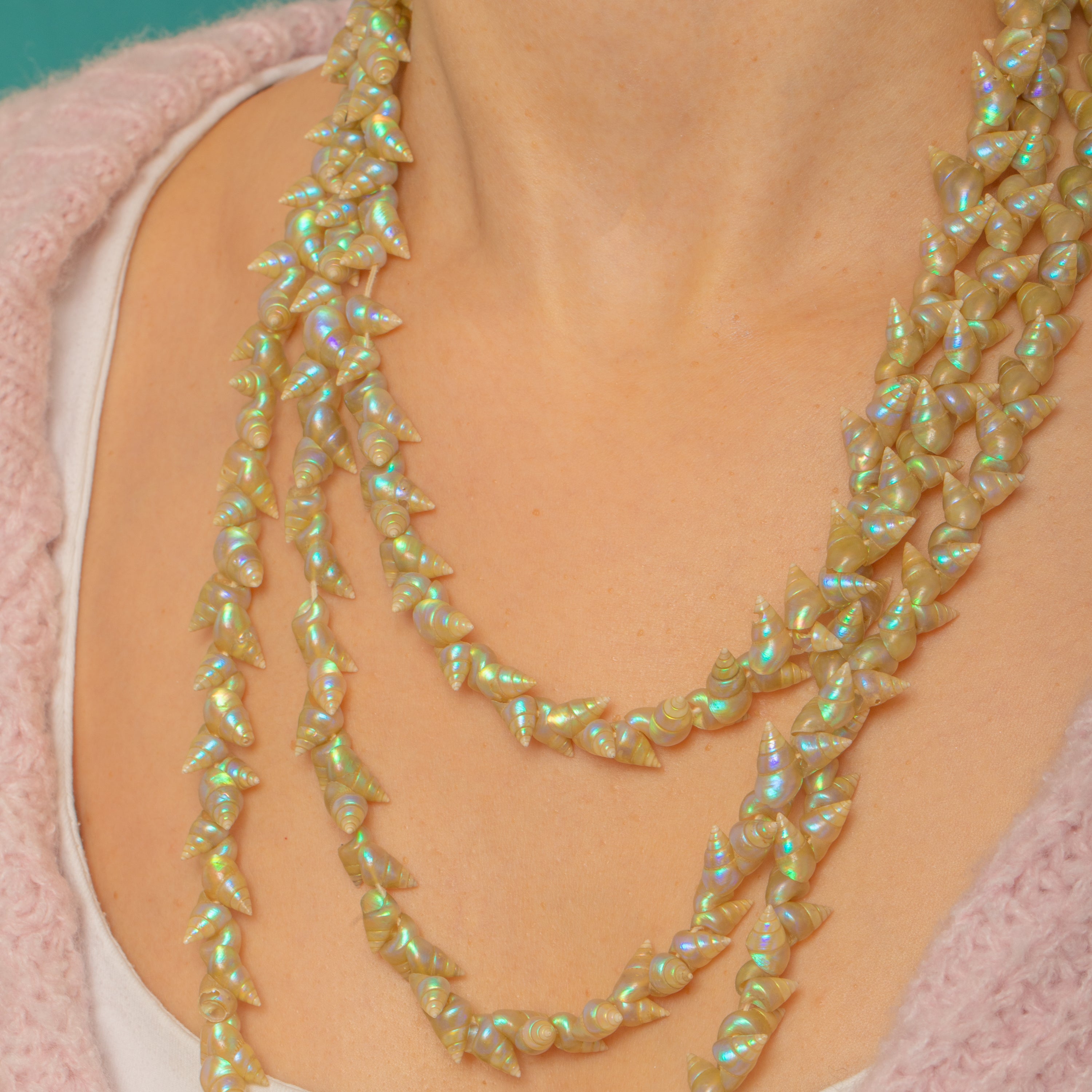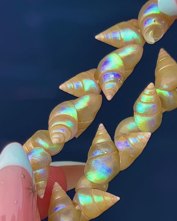 A rare Victorian Aboriginal Tasmanian Maireener shell necklace, shimmering with the oceanic iridescence these treasured shells are known for. Closely strung, tapered spiral beads glow with pearly champagne tones lit by flashes of blue, lilac and electric green, creating a dense, tactile texture that feels wonderfully organic and beach-inspired.