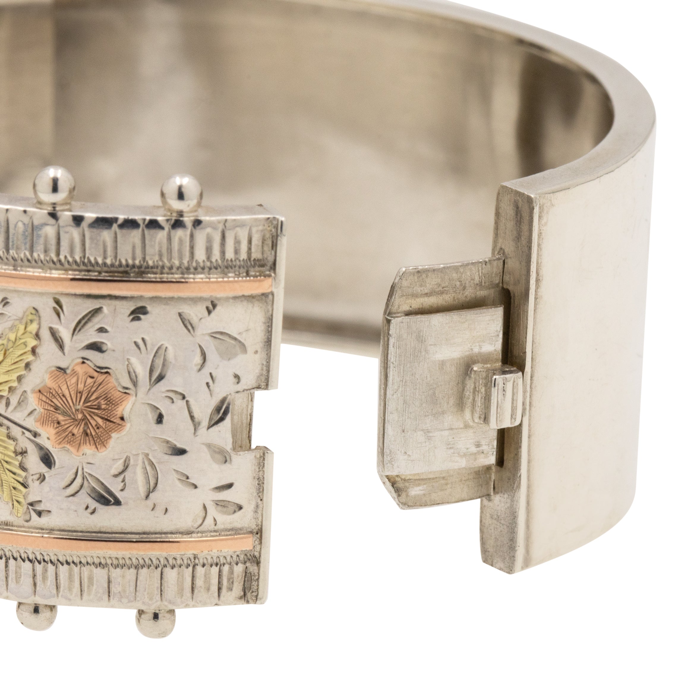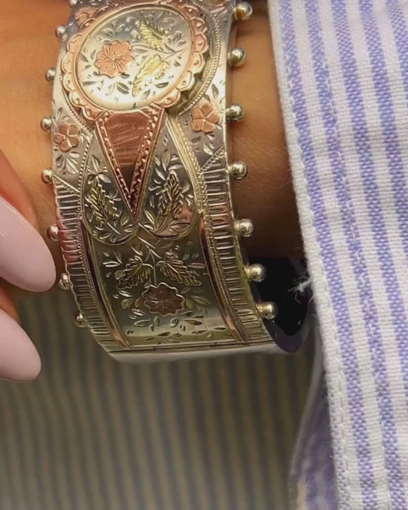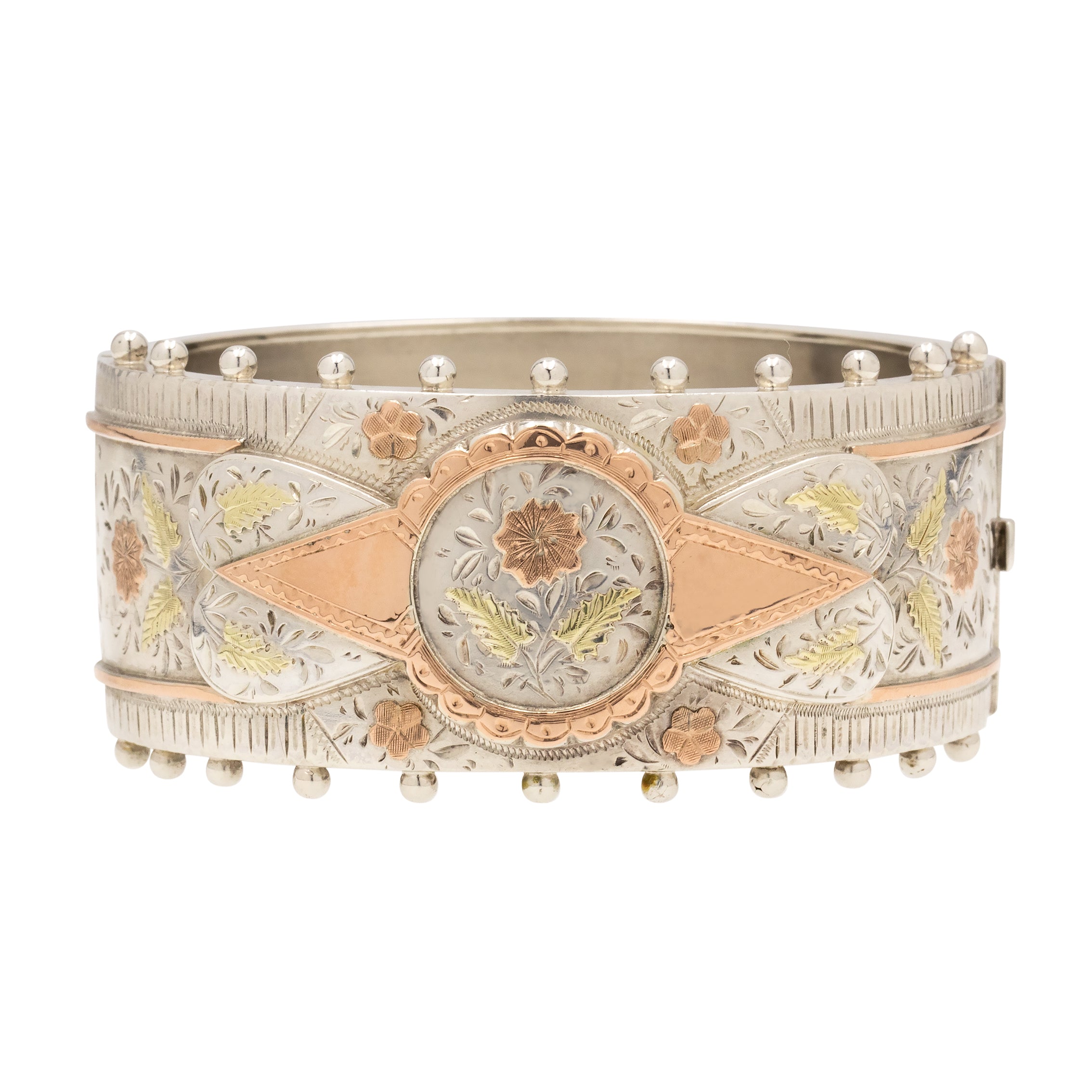 ビクトリア朝美学の花柄彫刻入りバングル、ビーズエッジ付き、約1884年製。