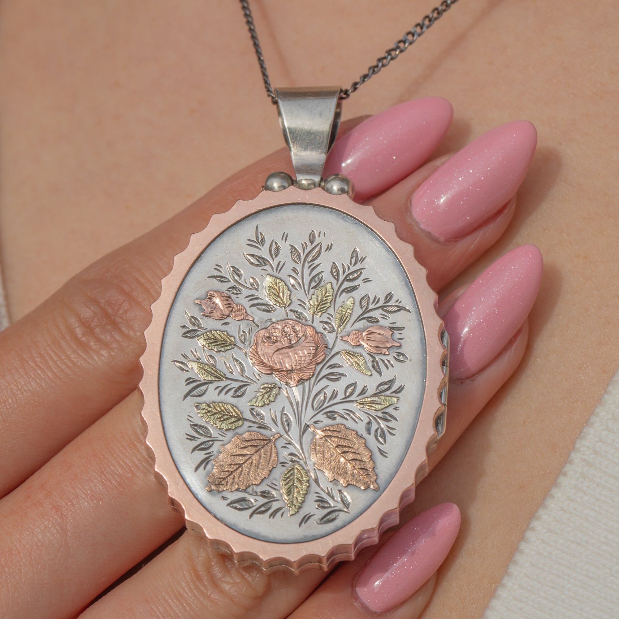 A true celebration of Victorian craftsmanship, the level of detail achieved is next to none, displaying ornate 9ct Gold roses and leaves adorned with intricate hand-engraved details, bringing this piece to life. Framed by a 9ct Gold scalloped border adding a distinct, eye-catching finish, this Victorian Aesthetic locket will make a statement wherever she goes!
