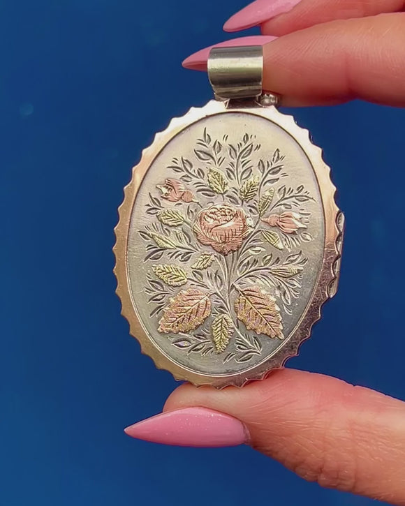VERY GOOD-EXCELLENT: This Victorian Aesthetic Silver & 9ct Gold floral locket is in wonderful condition. The front of the locket is immaculate with all details remaining crisp and defined. The Silver has accrued a light patina creating a lovely contrast against the Gold details and enhancing the engraved details. There are a few light dings on the back of the locket, commensurate with age, which are not noticeable from the front. The locket closes securely and the large bale allows you to suspend it from a chain and wear it with the utmost confidence!