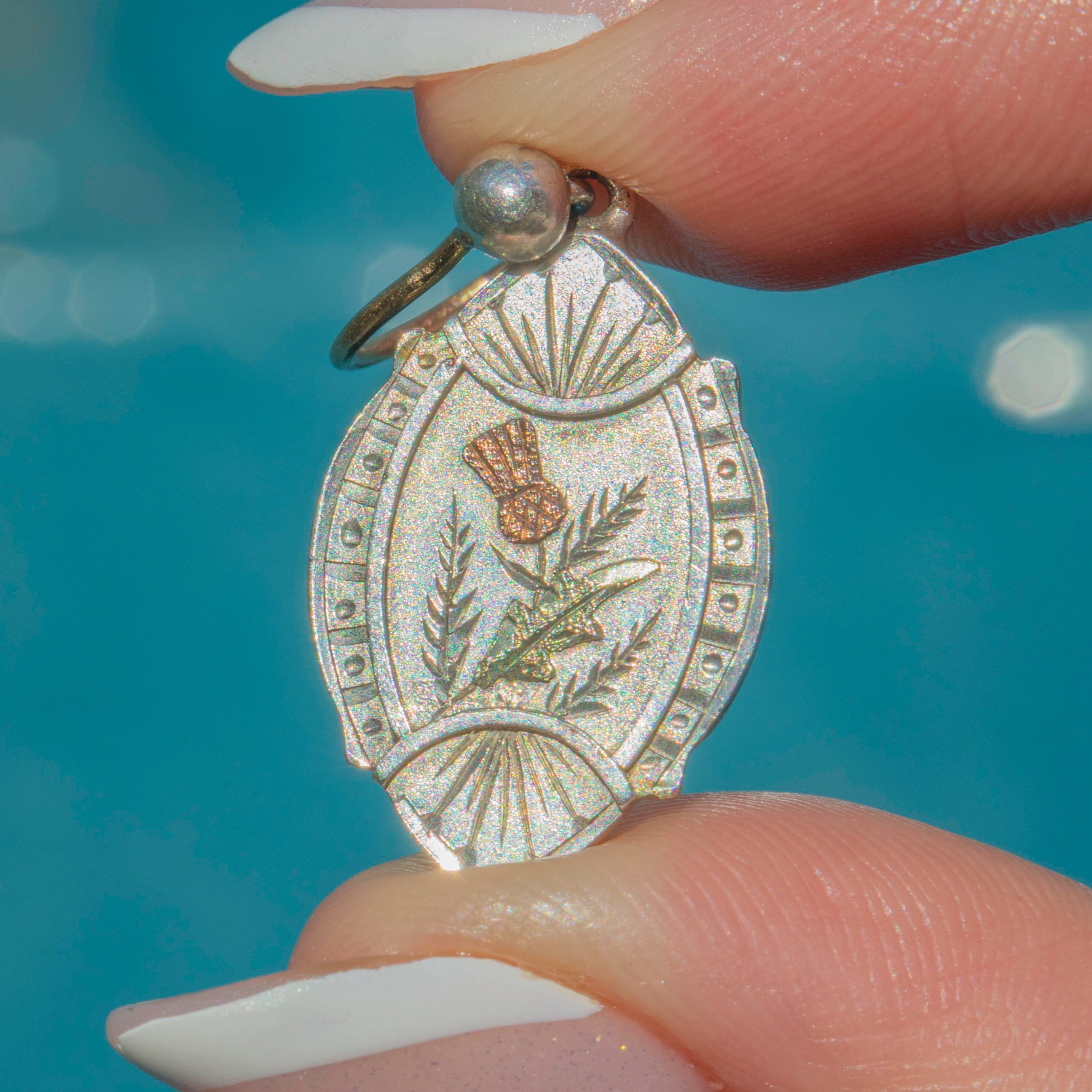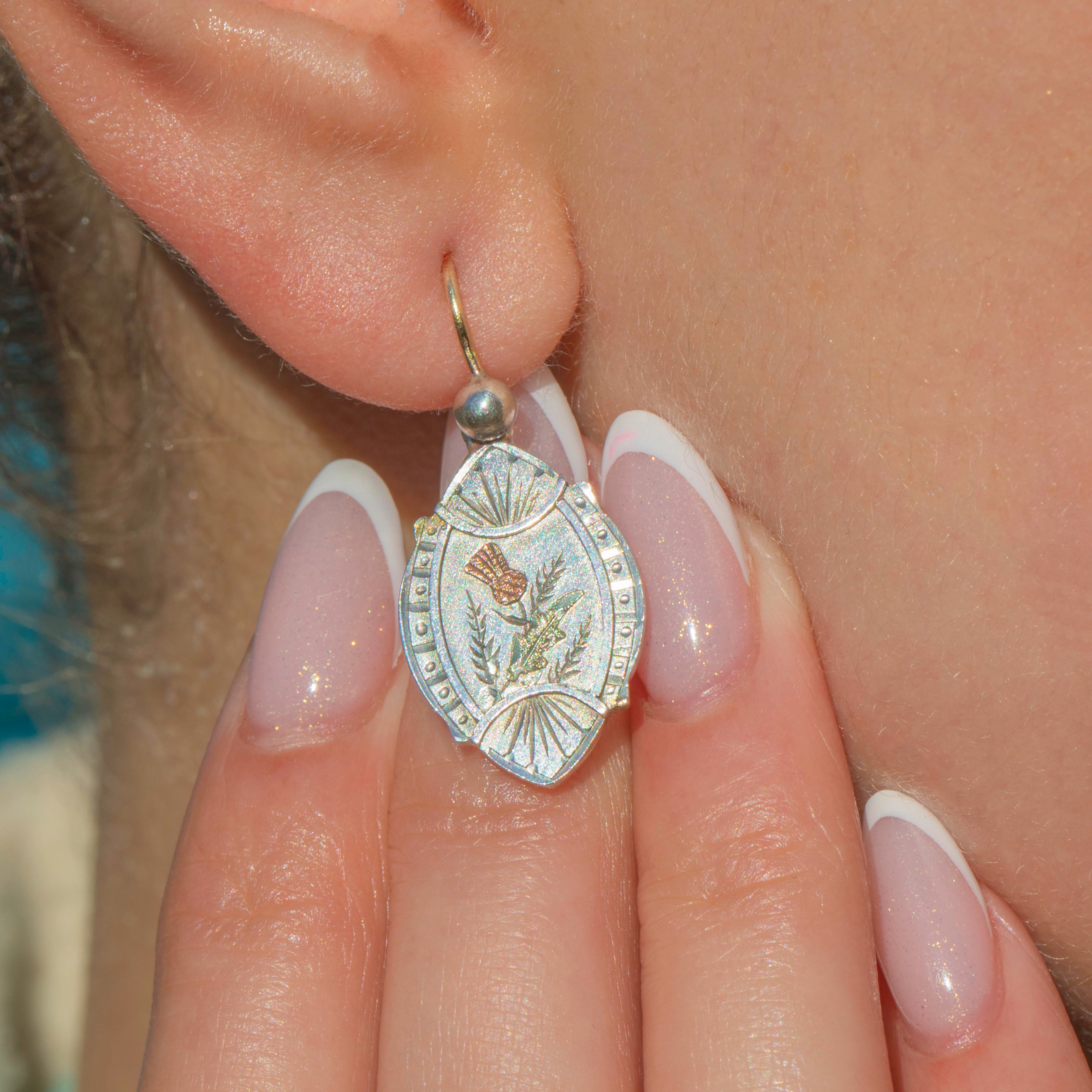 VERY GOOD: These Victorian Aesthetic Silver & 9ct Gold floral navette earrings are in very good condition. The Silver is bright and has accrued an admirable patina within the details making them pop. The engravings are defined and the rose Gold thistles are pristine. There is some general age-related wear throughout, including evidence of a conversion on the back. However, this is all minor and does not detract from their overall beauty. The hooks are slender and comfortable to wear, so you can enjoy these Victorian Aesthetic earrings with confidence!