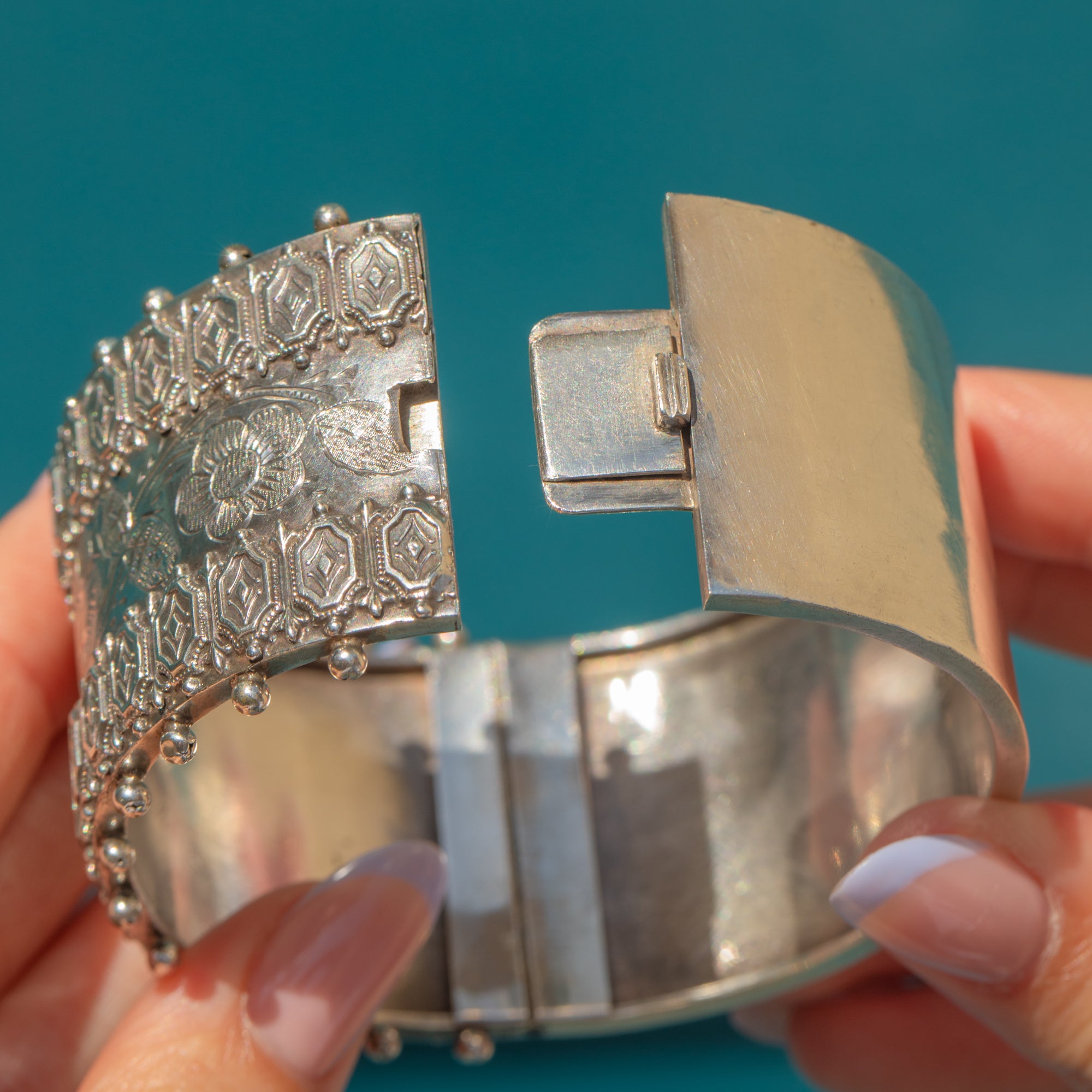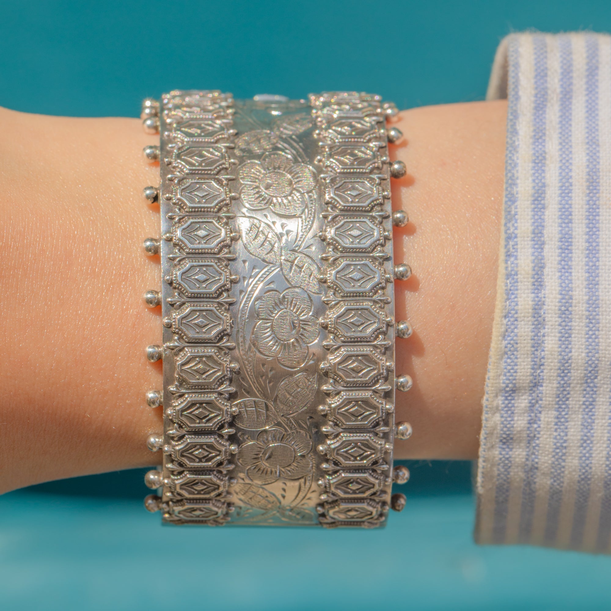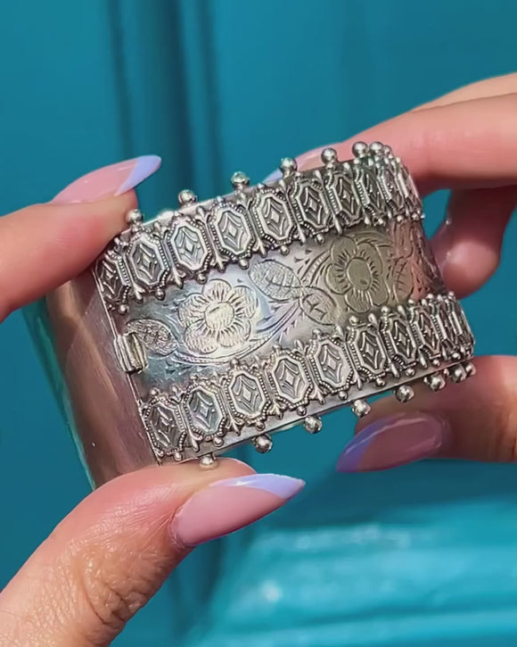 Emphasising 'art for art's sake', this is a beautifully handmade bangle, boasting floral engravings and a striking beaded edge. Providing exceptional coverage, this antique Silver cuff bangle will make a statement as she adorns your wrist!