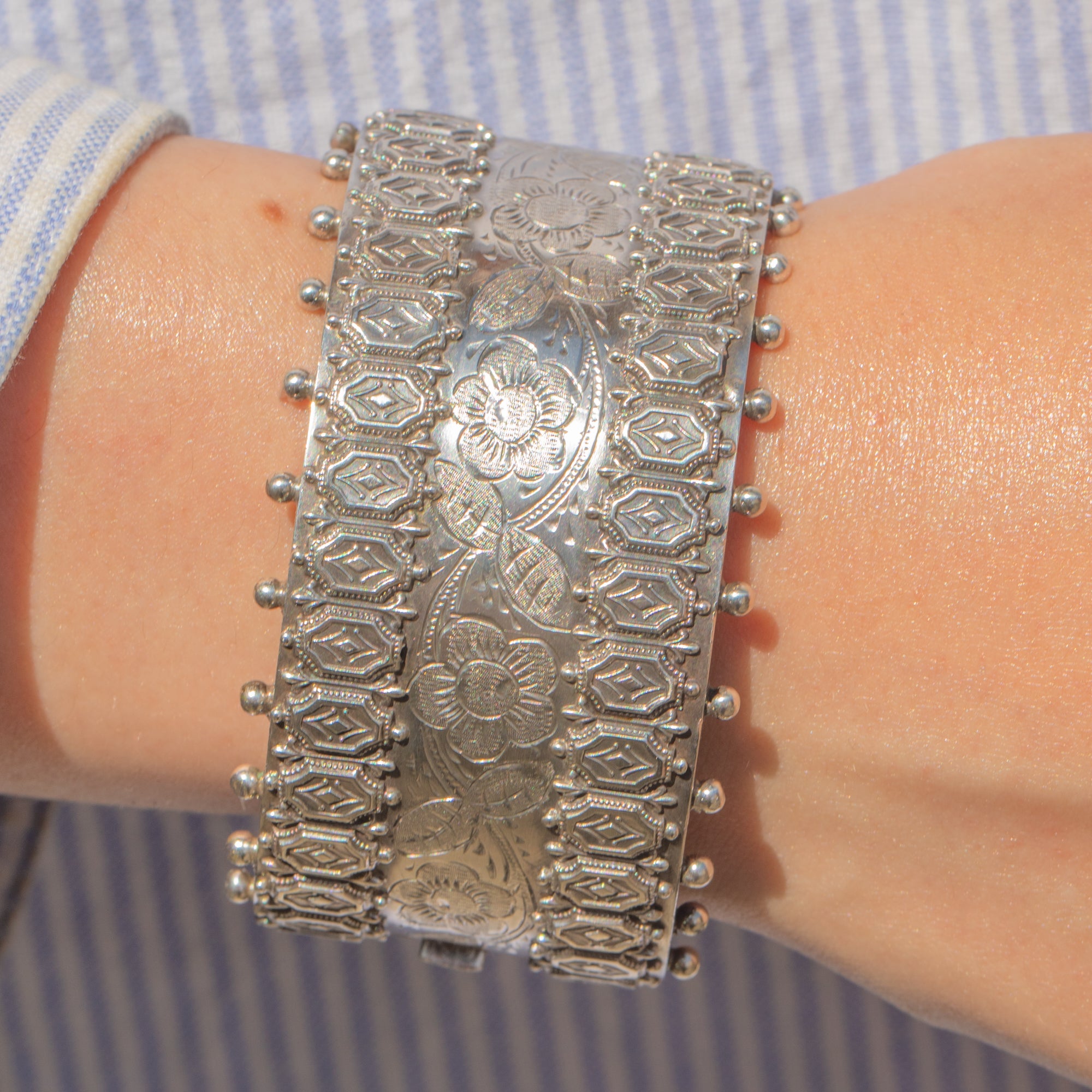 Made during the peak of the Victorian Aesthetic movement, this Victorian Aesthetic Silver engraved bangle is brimming with outstanding details!