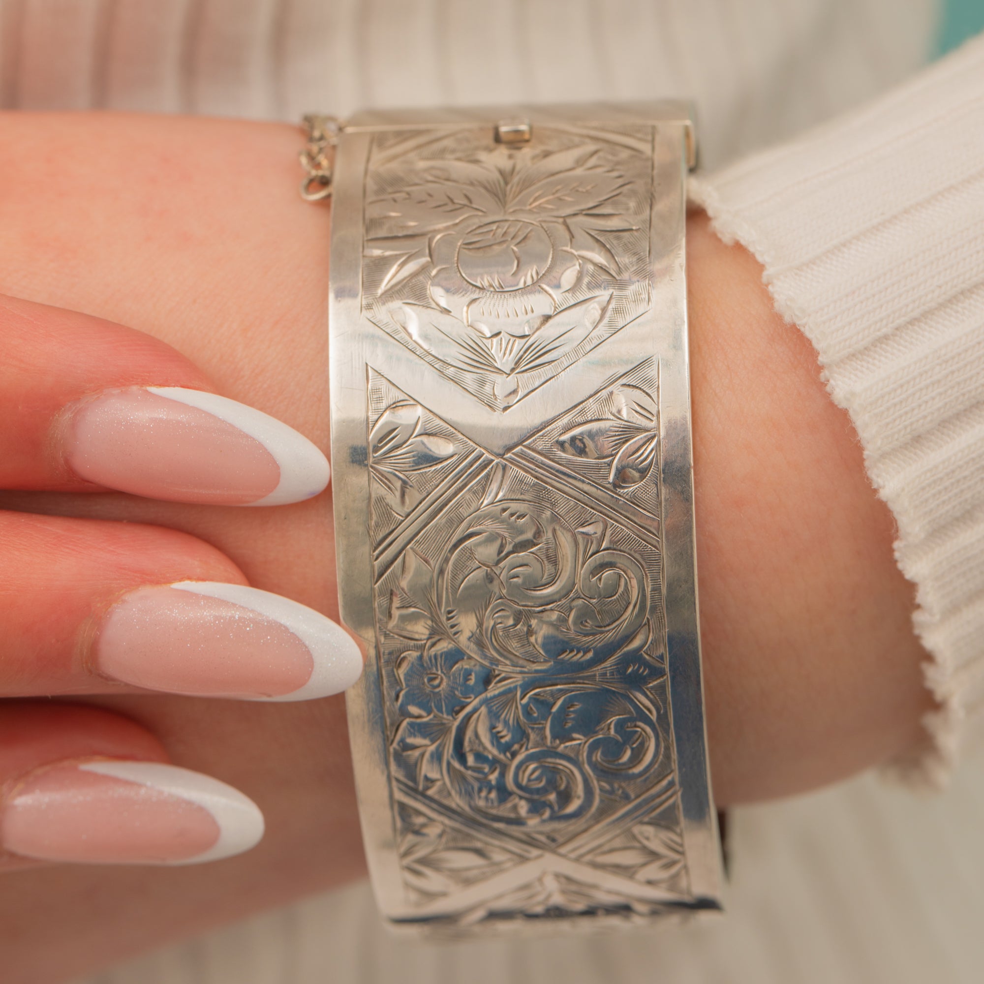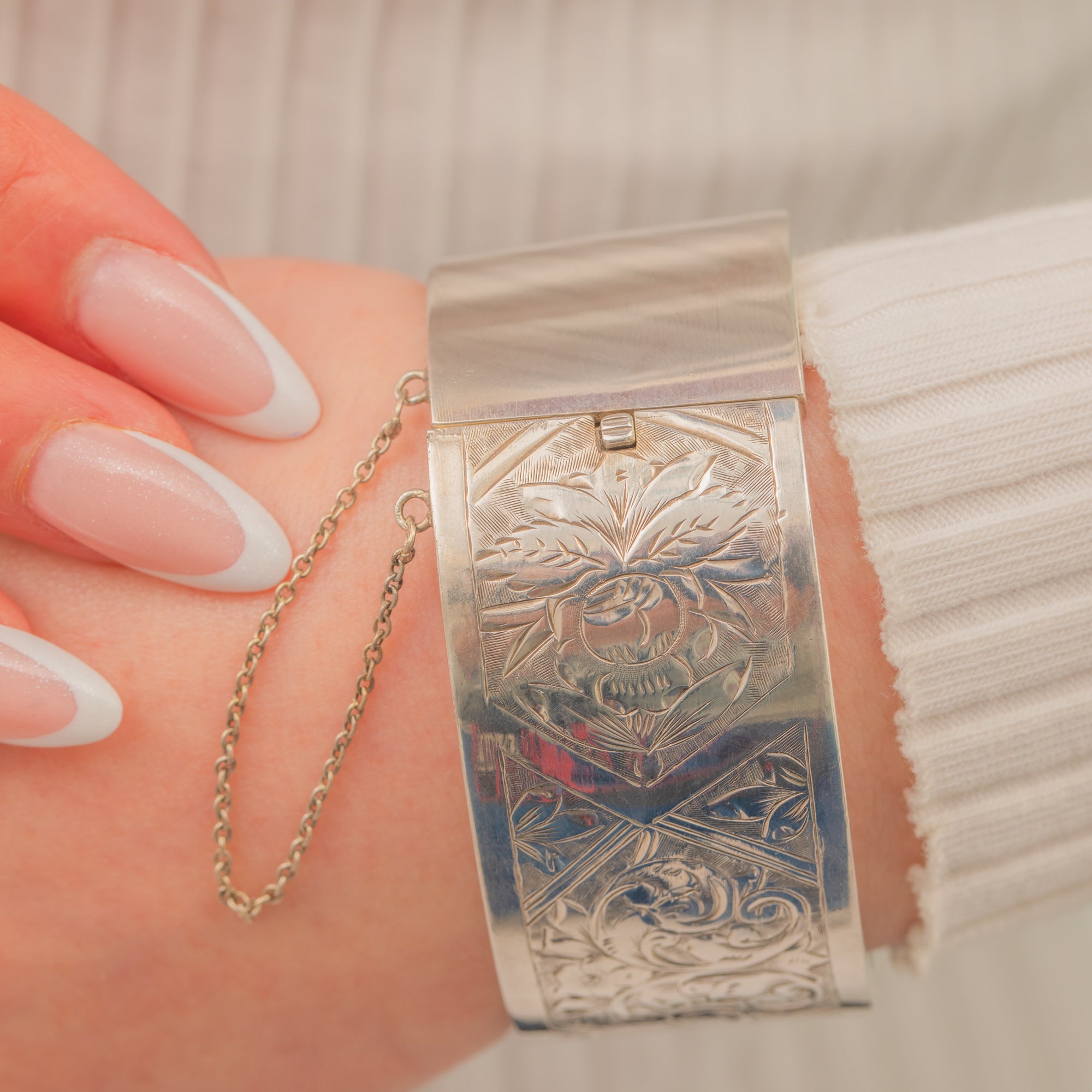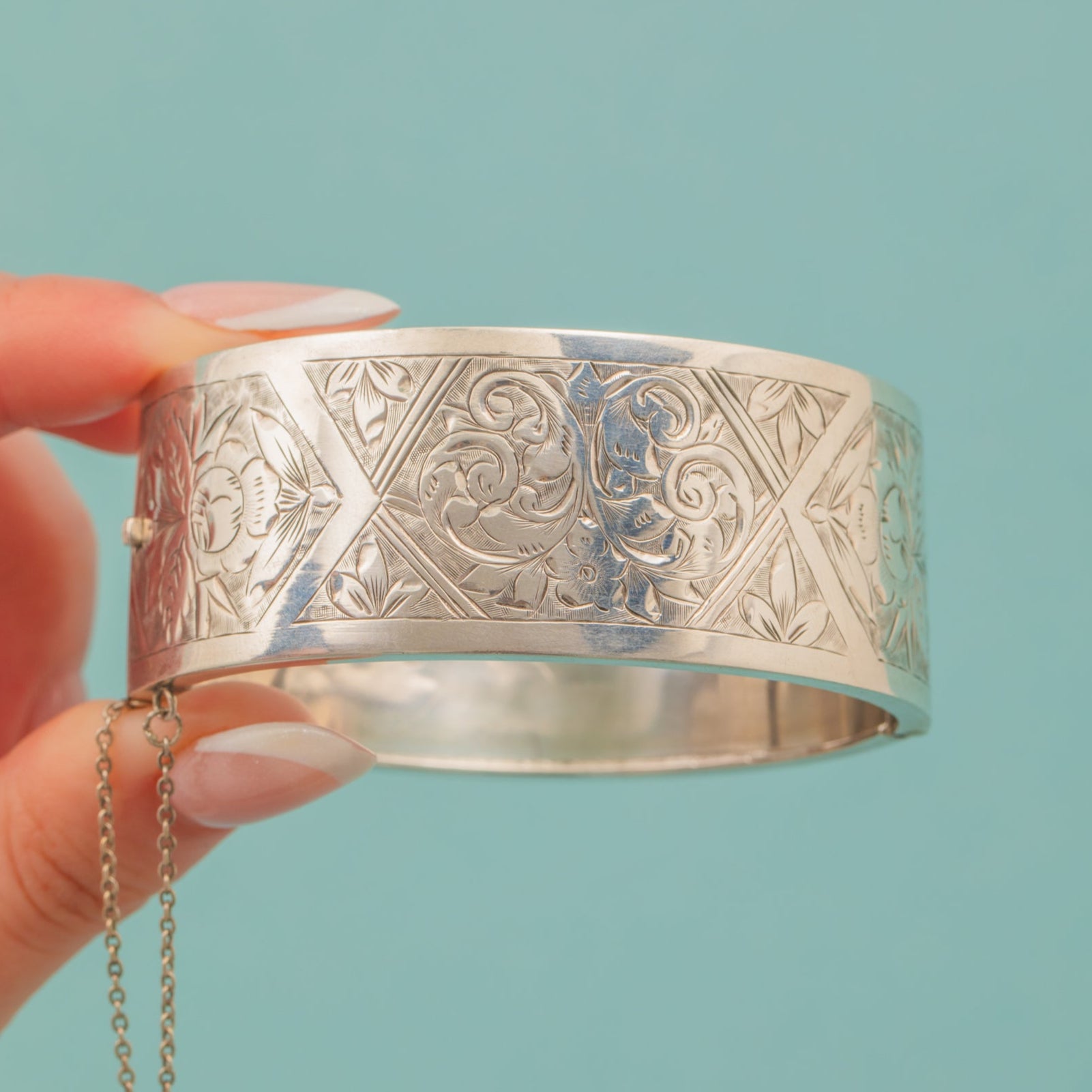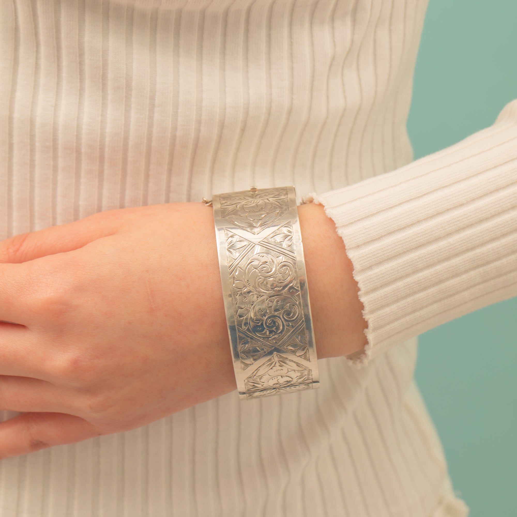 VERY GOOD: This Victorian Aesthetic Silver engraved bangle is in very good condition. The bangle itself has maintained a great form, with the engravings along the front remaining crisp. On the back, there are a few light dings and surface marks but nothing untoward. The clasp shuts securely and the bangle sits comfortably around the wrist!